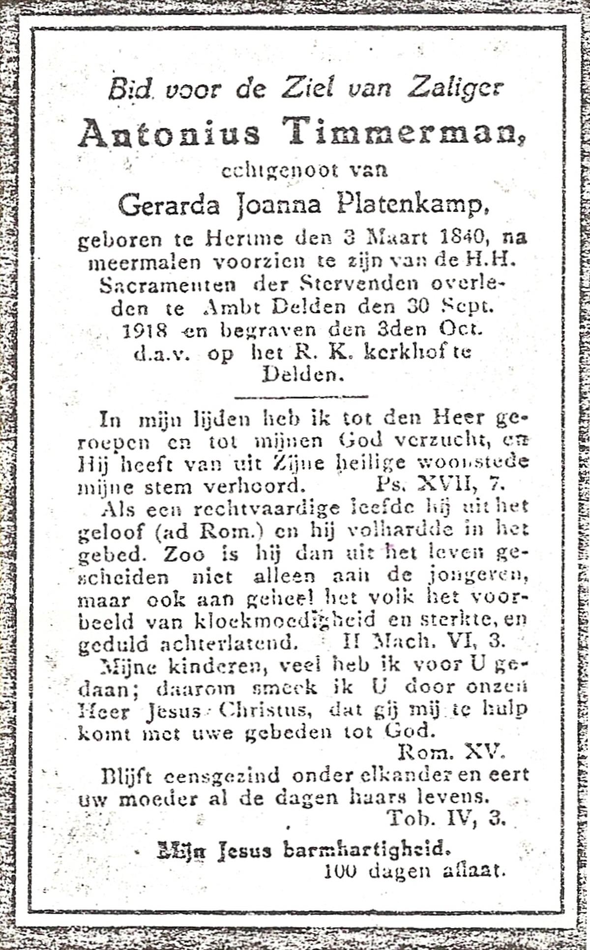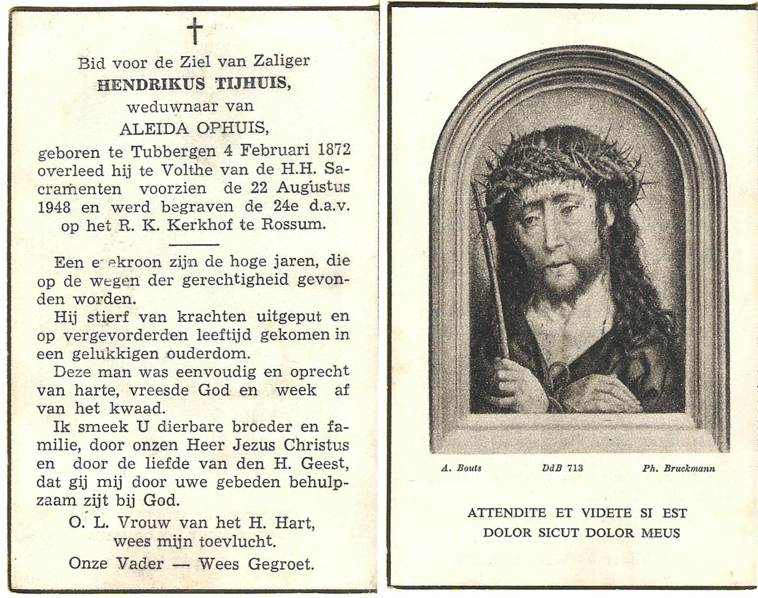 TIJHUIS, Hendrikus, geboren op 04-02-1872 te Tubbergen, overleden op 22-8-1948 te Volthe op 76-jarige leeftijd, begraven op 24-8-1948 te Rossum.