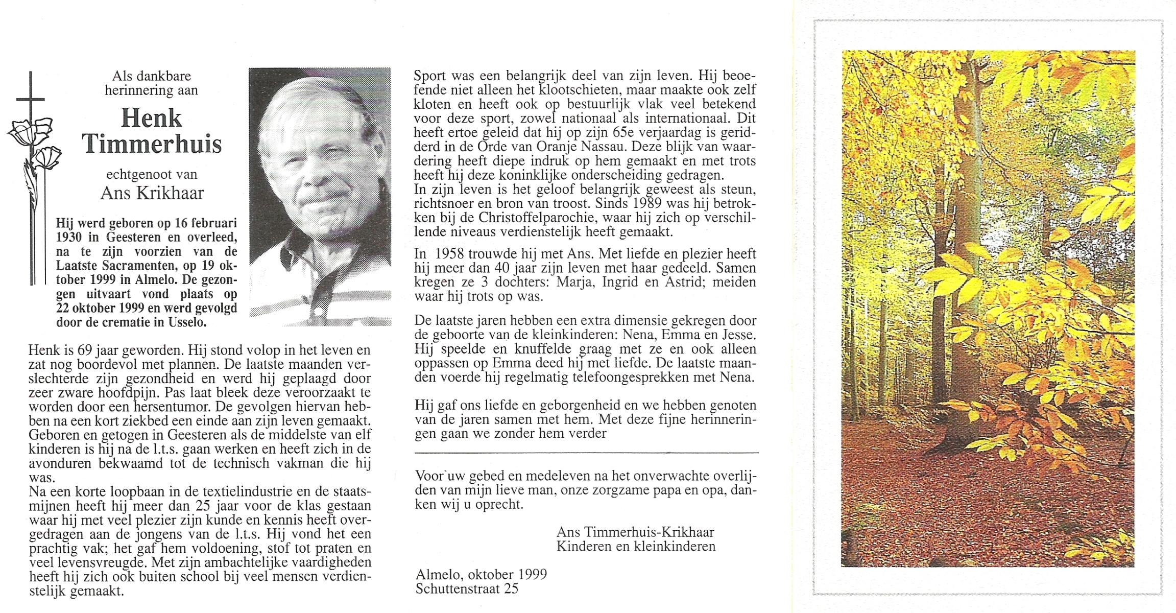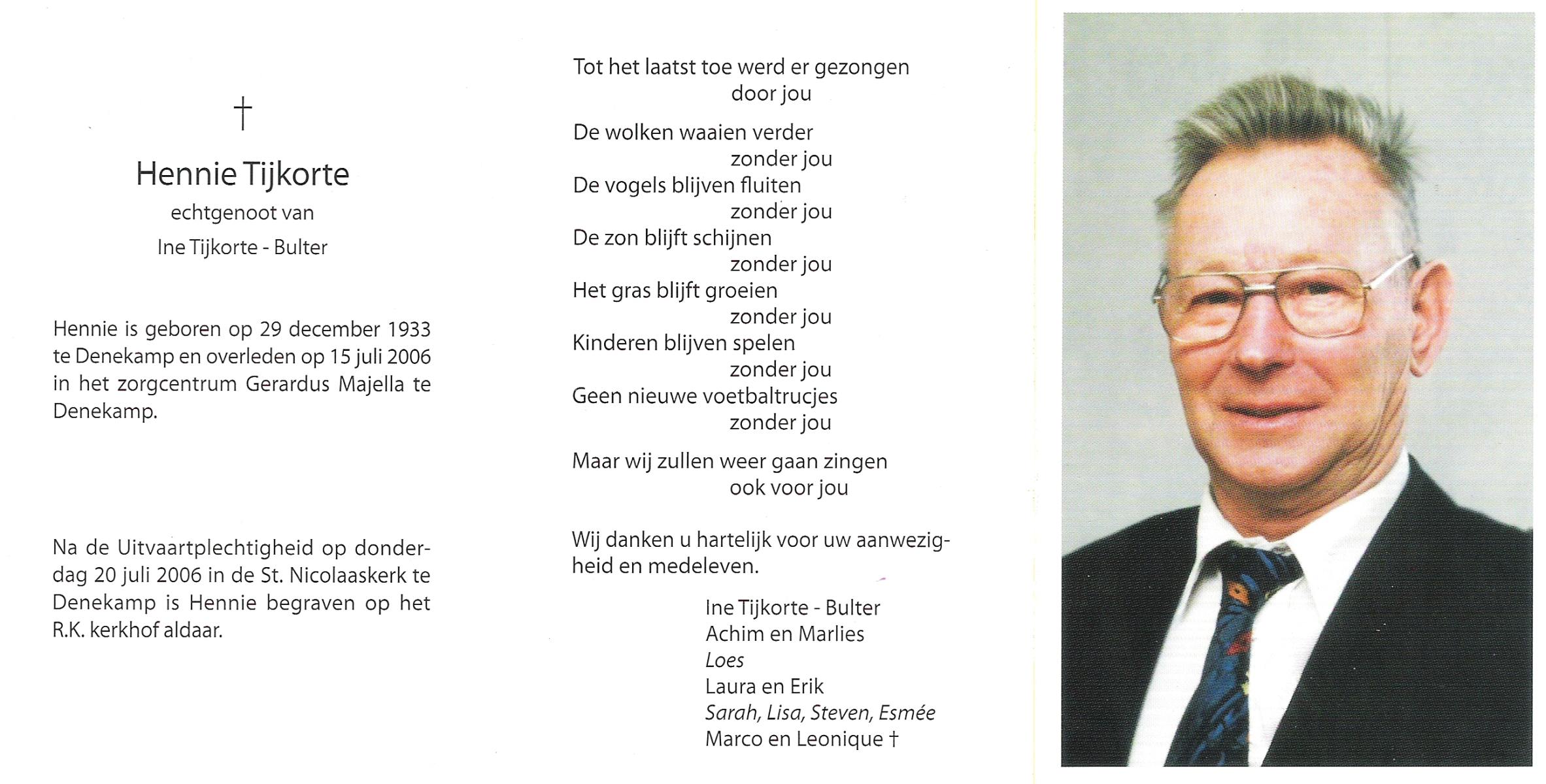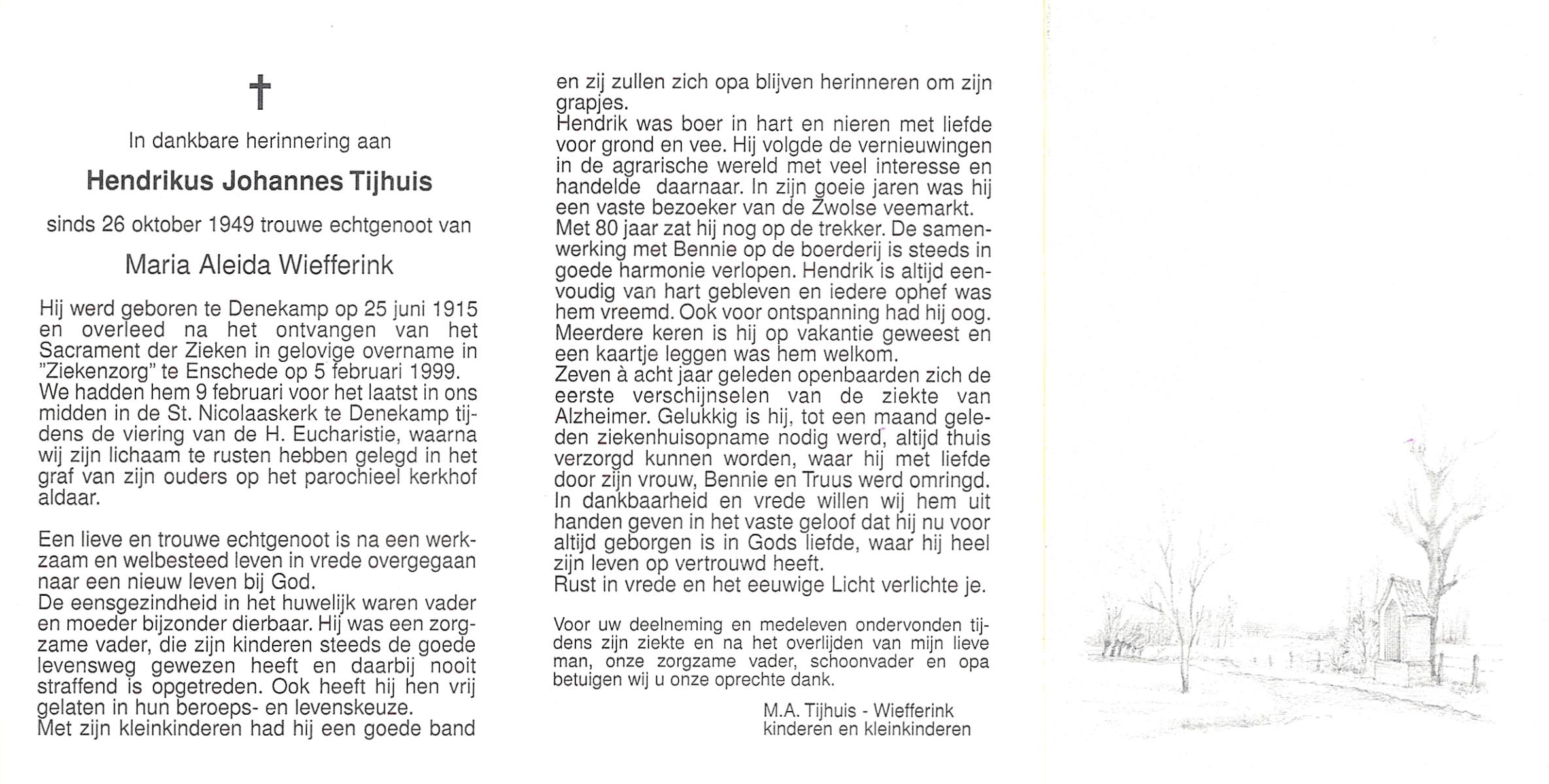 TIJHUIS, Hendrikus Johannes, geboren op 25-6-1915 te Denekamp, overleden op 5-2-1999 te Enschede op 83-jarige leeftijd, begraven op 9-2-1999 te Denekamp.