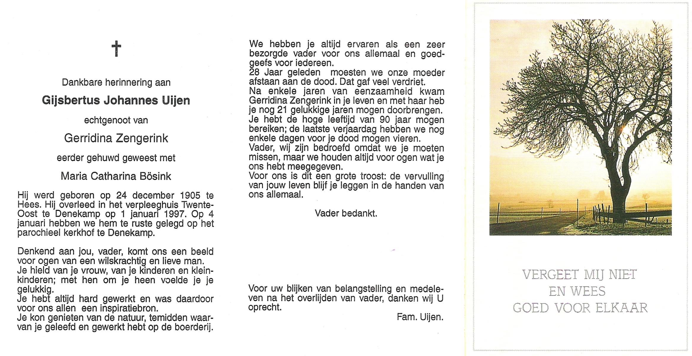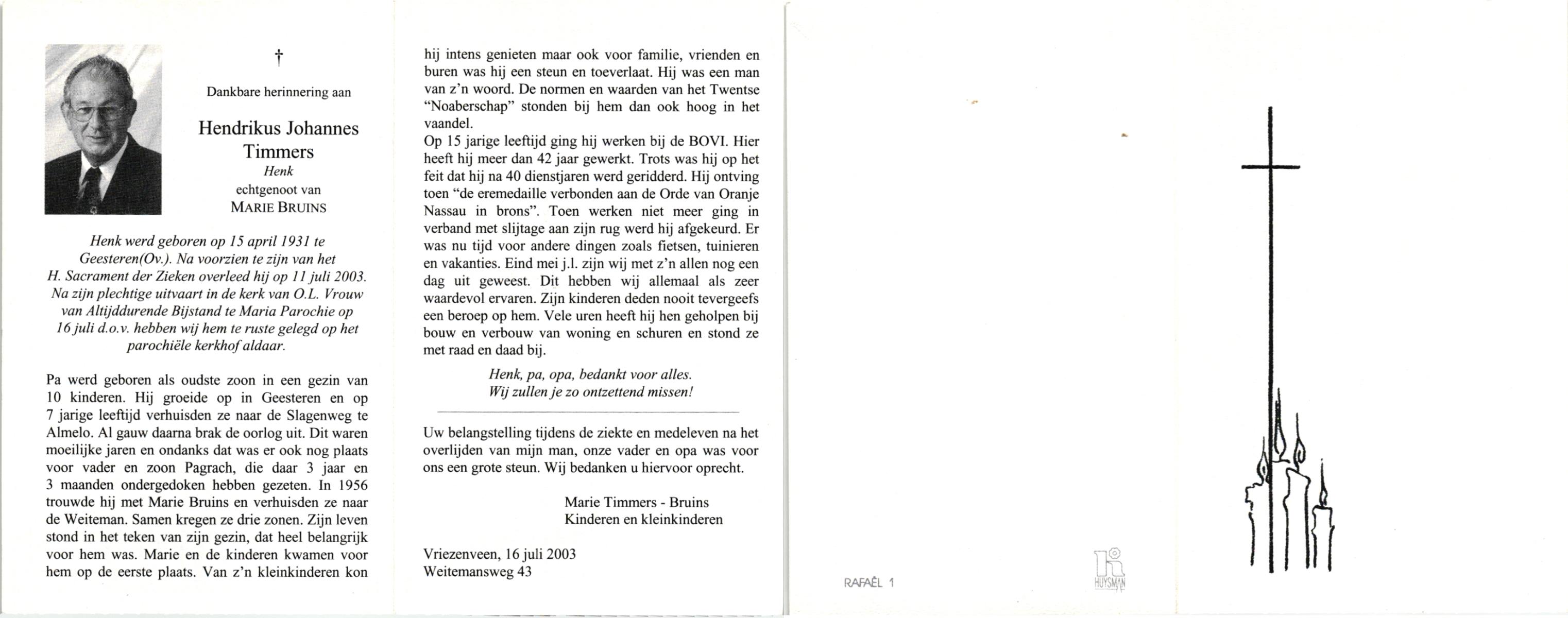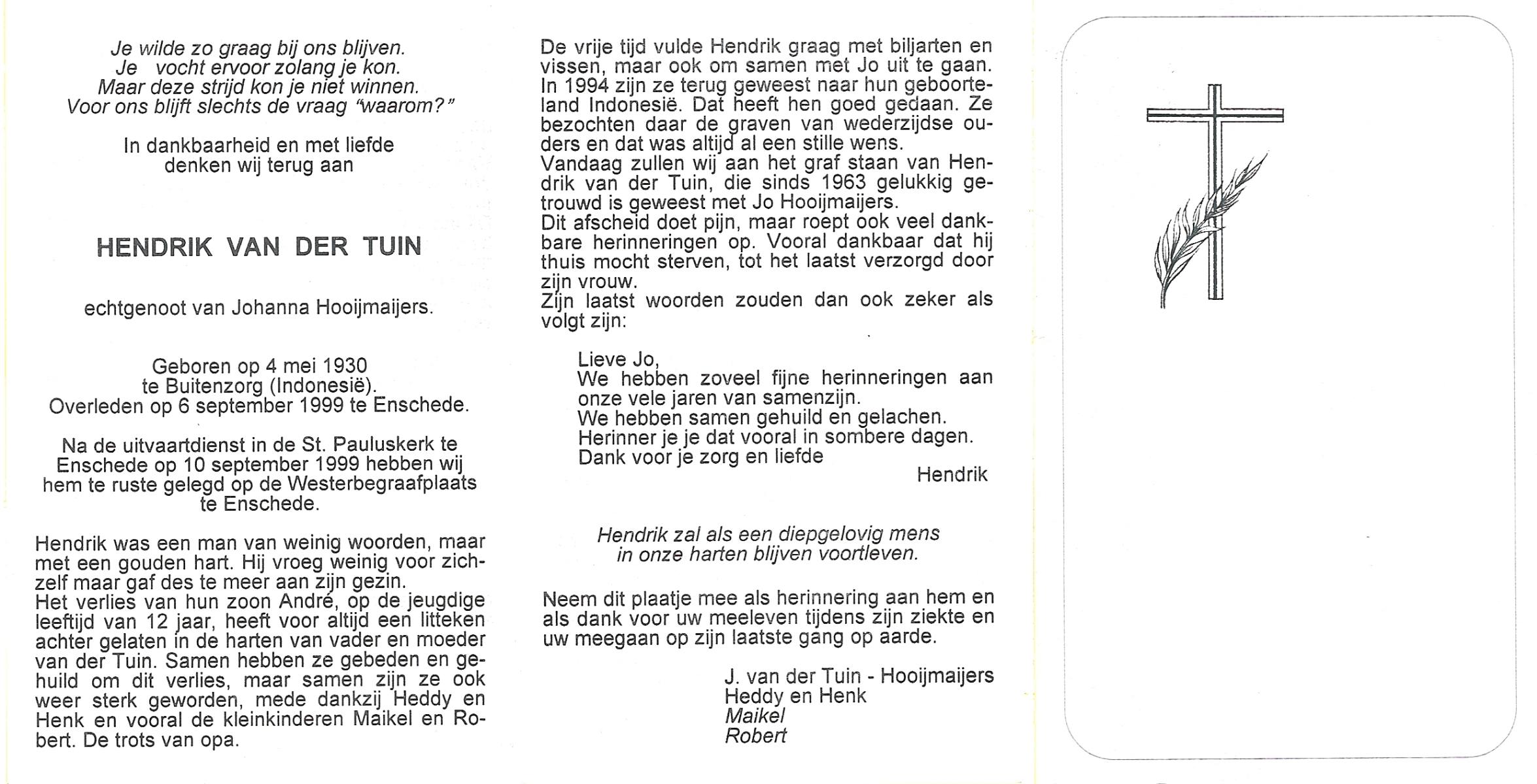 TIJHUIS, Hendrikus Johannes, geboren op 25-6-1915 te Denekamp, overleden op 5-2-1999 te Enschede op 83-jarige leeftijd, begraven op 9-2-1999 te Denekamp.