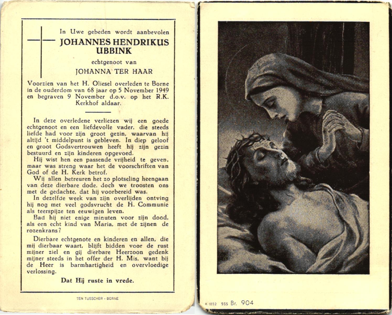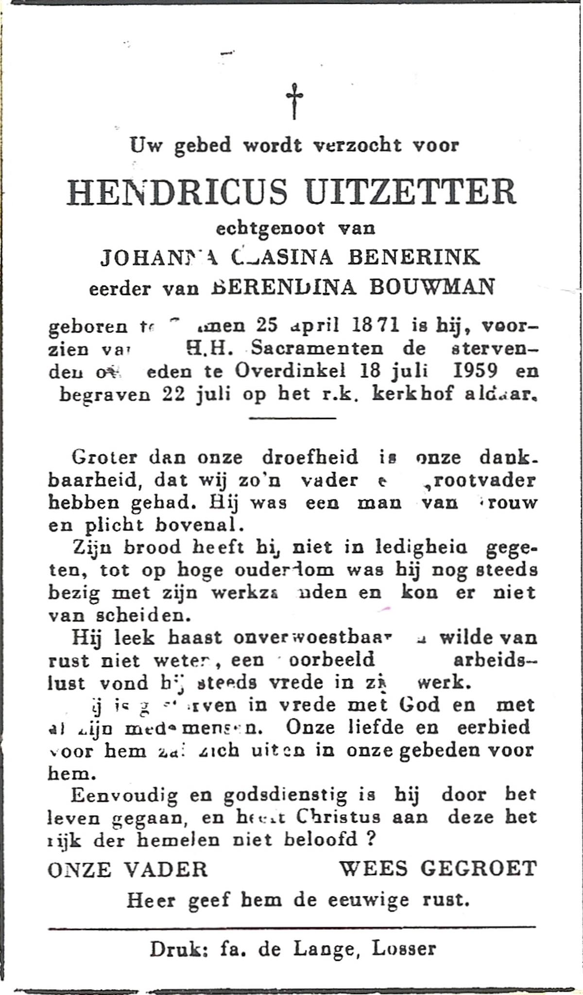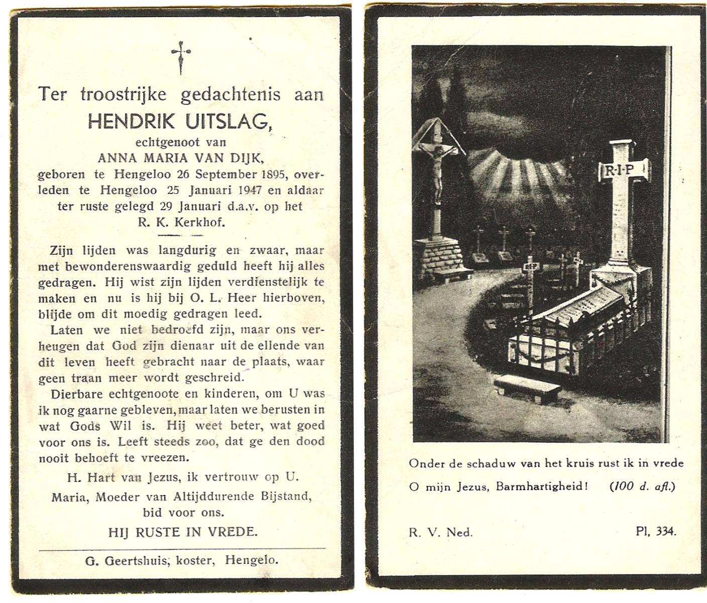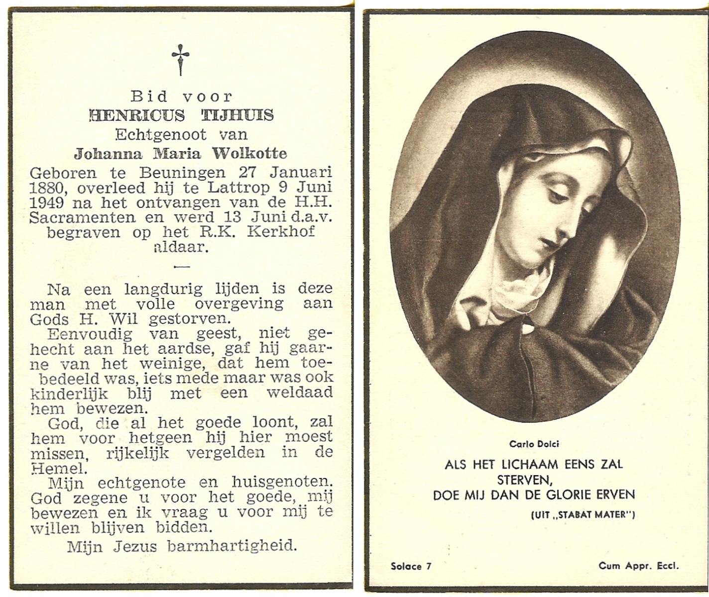 TIJHUIS, Henricus, geboren op 27-01-1880 te Beuningen (Ov.), overleden op 9-6-1949 te Lattrop op 69-jarige leeftijd, begraven op 13-6-1949 te Lattrop R.K.kerkhof.