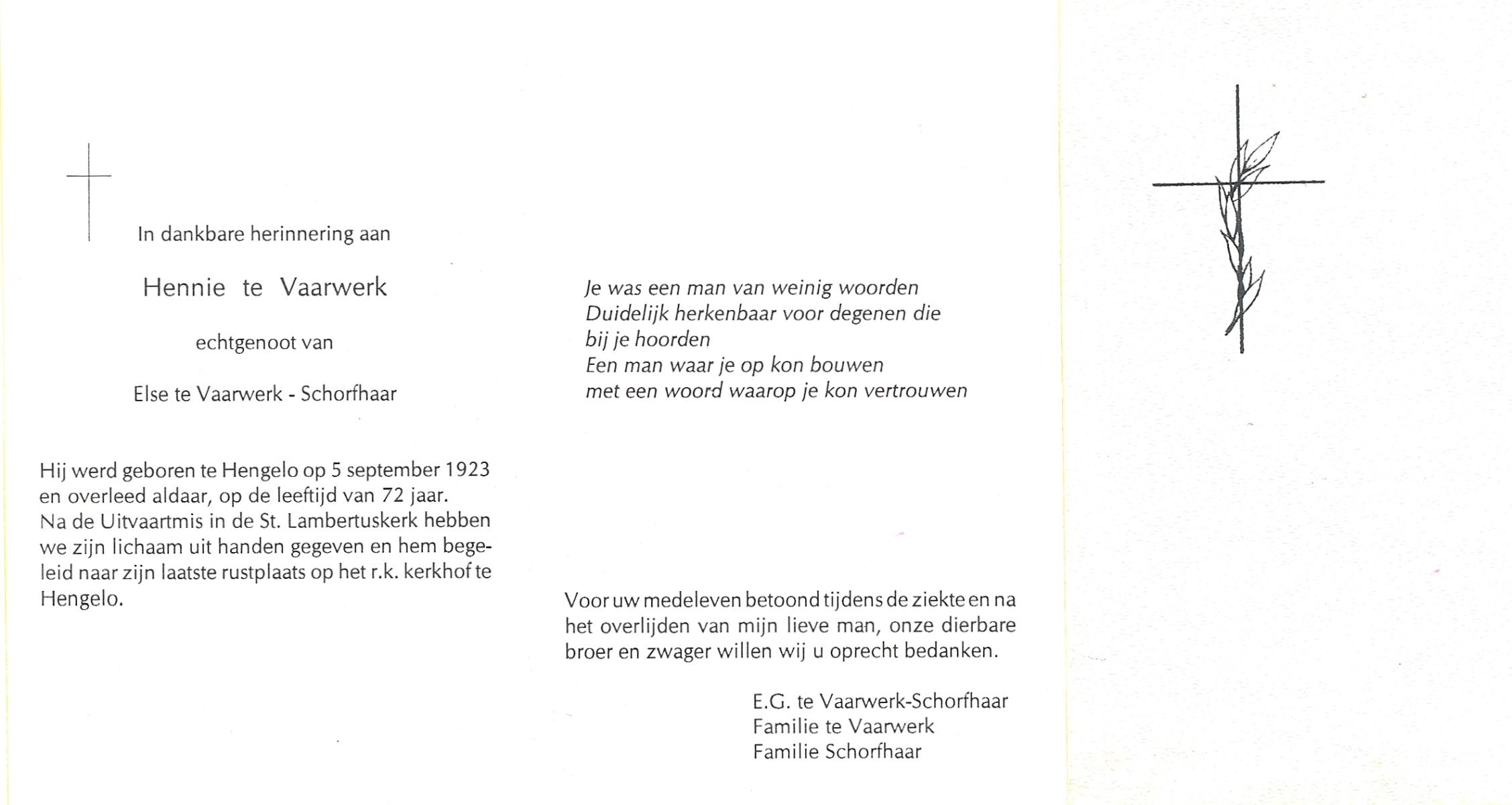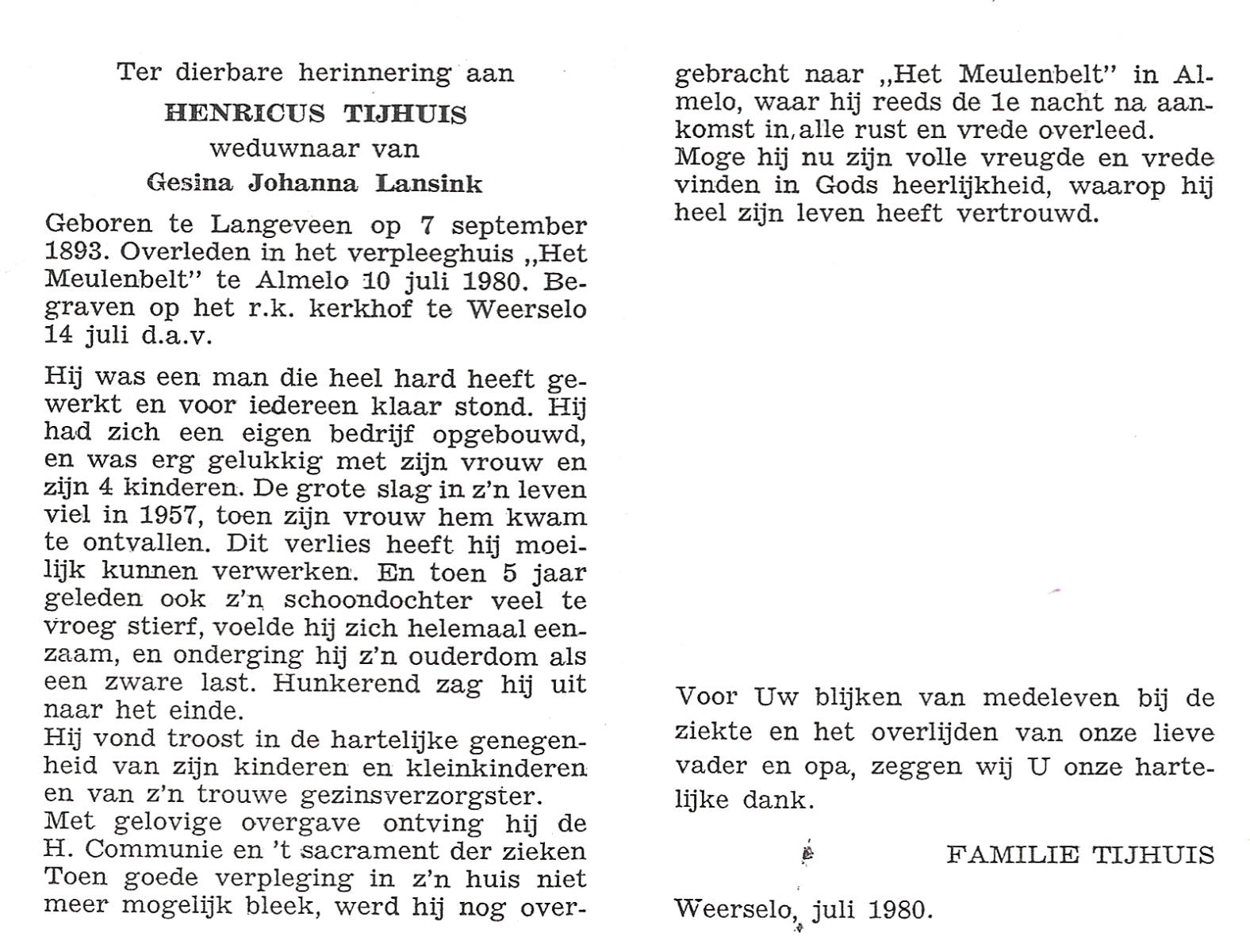 TIJHUIS, Henricus, geboren op 07-09-1893 te Langeveen, overleden op 10-7-1980 te Almelo op 86-jarige leeftijd, begraven op 14-7-1980 te Weerselo.