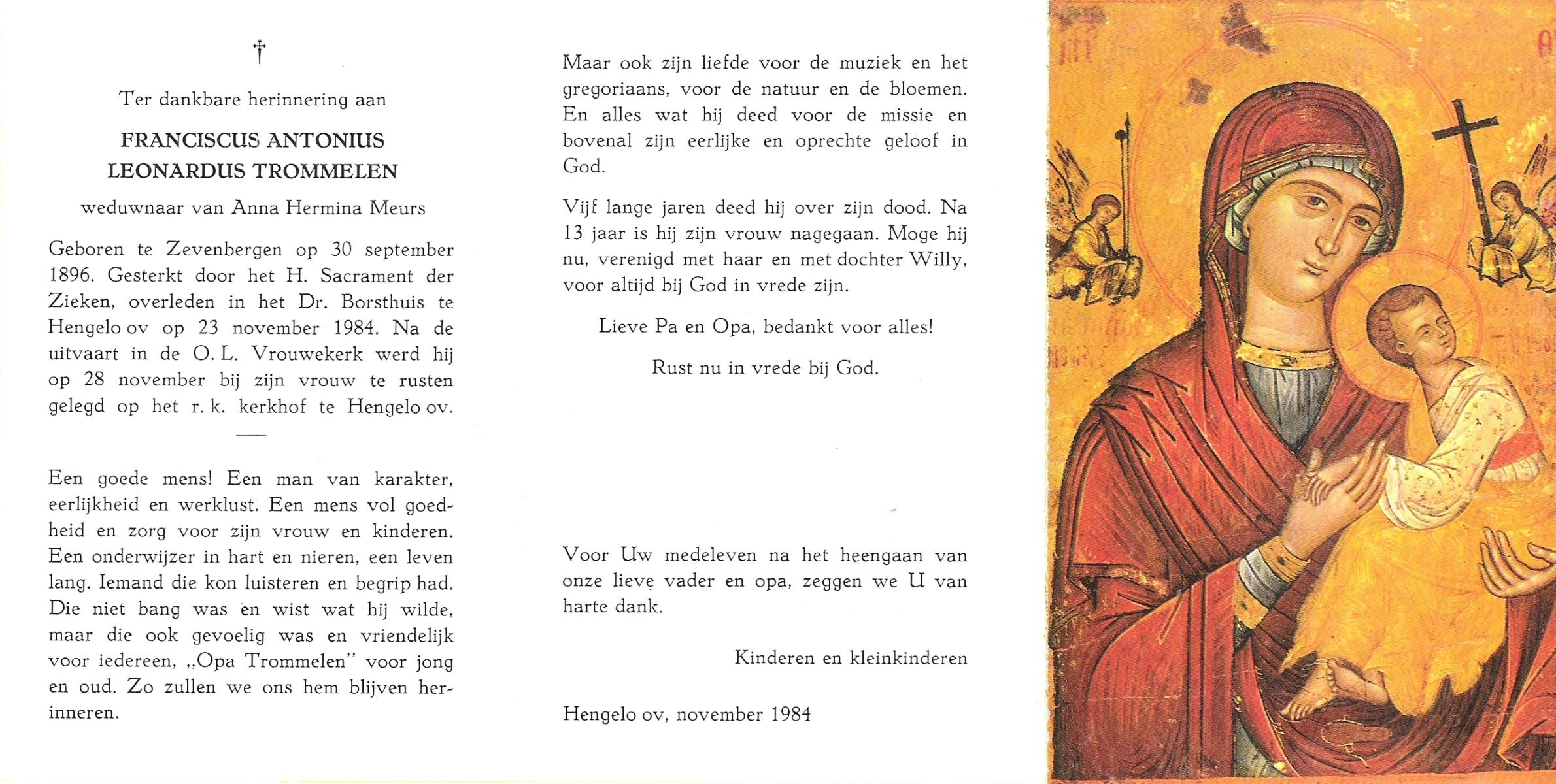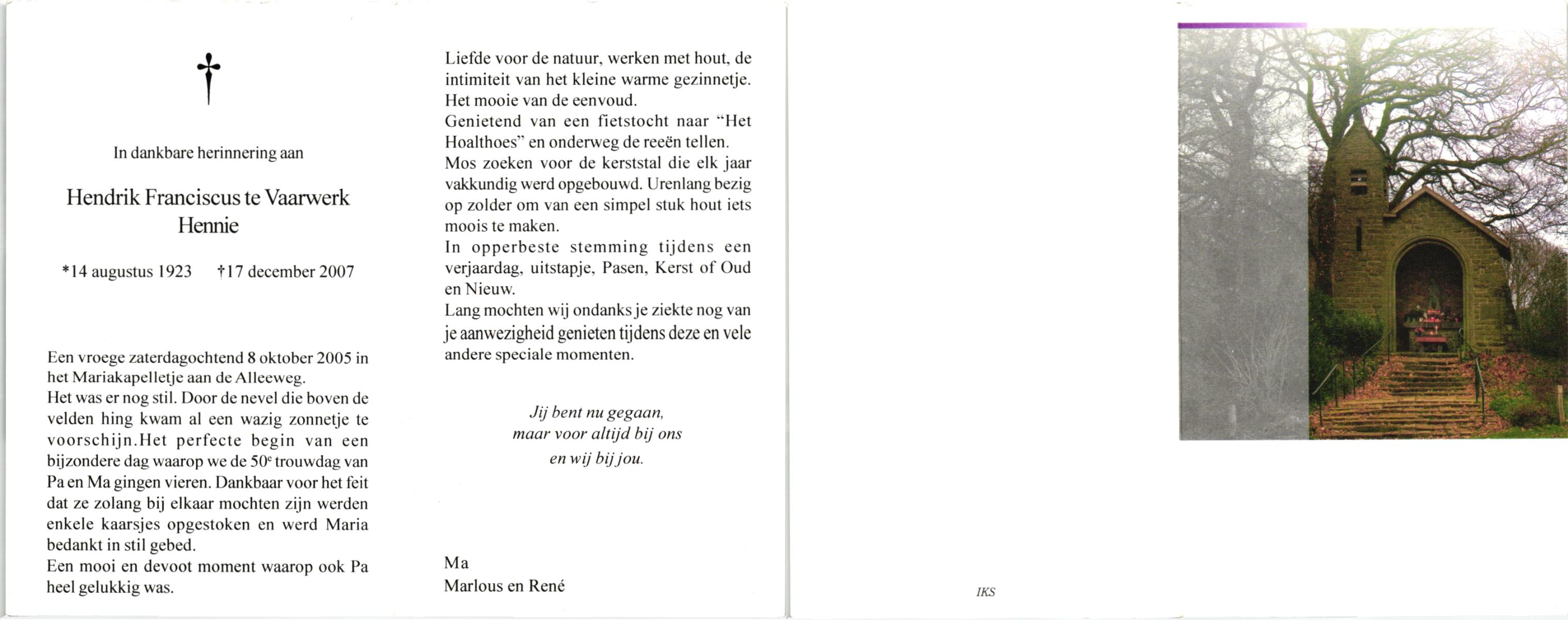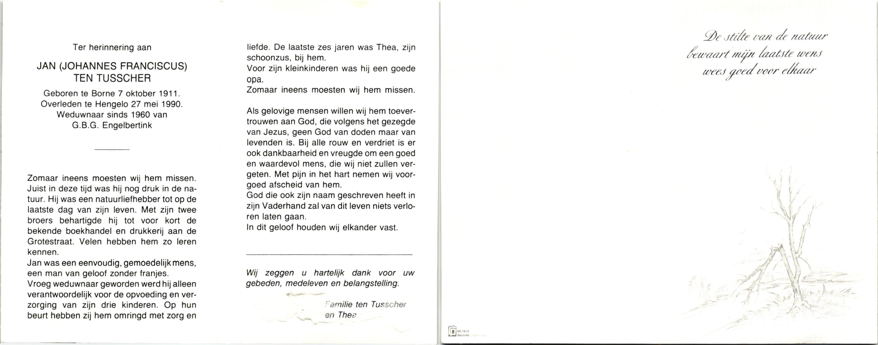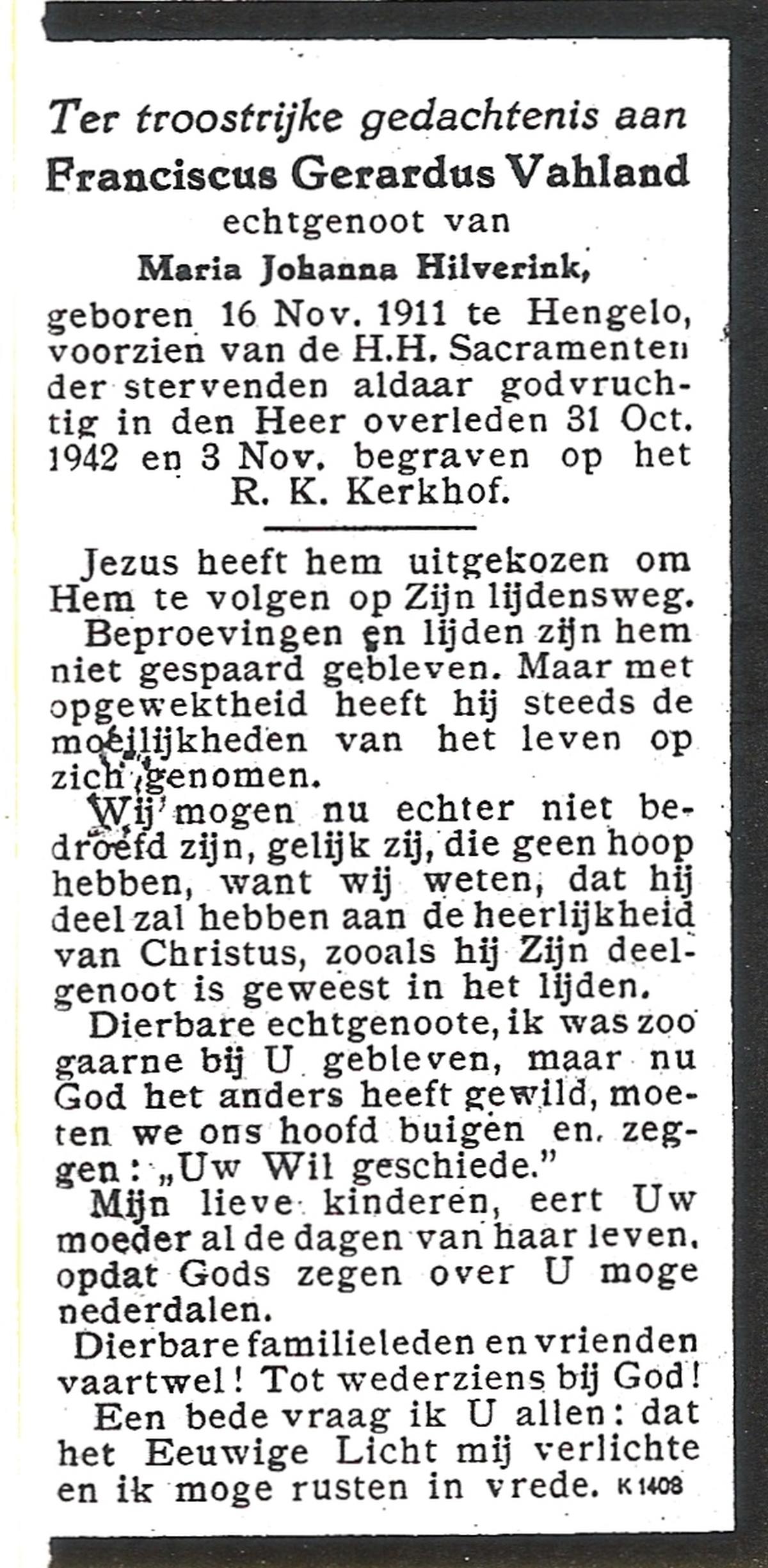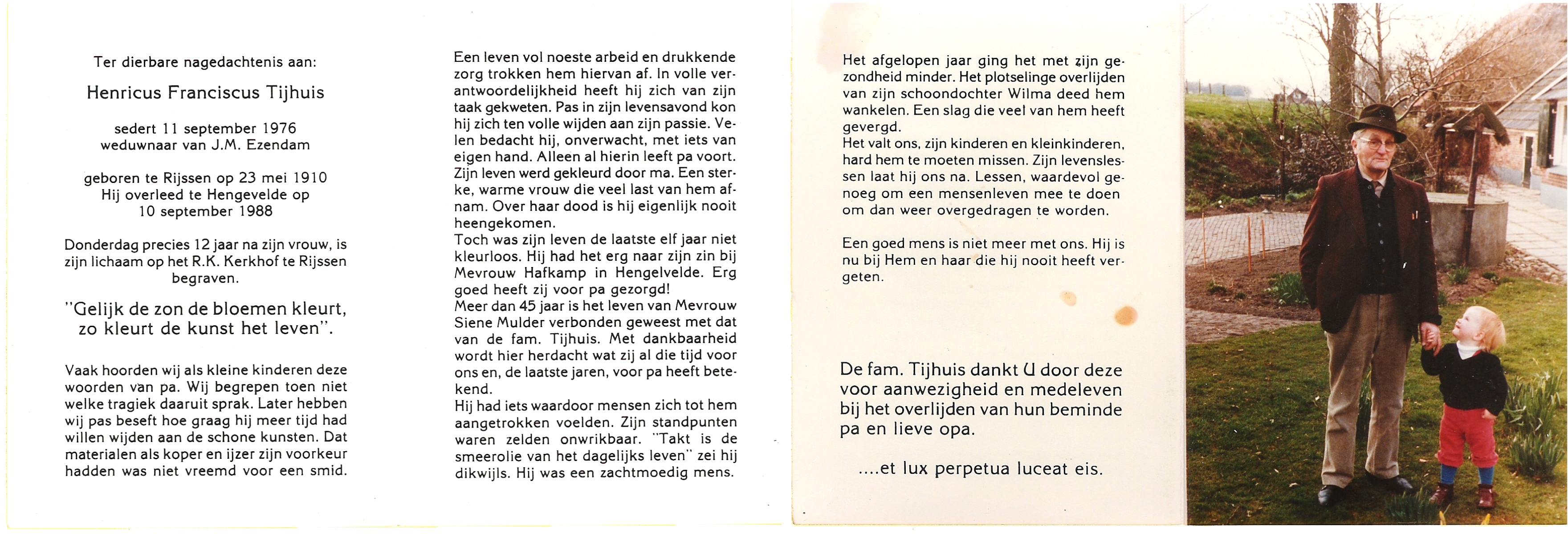 TIJHUIS, Henricus Franciscus, geboren op 23-5-1910 te Rijssen, overleden op 10-9-1988 te Hengevelde op 78-jarige leeftijd, begraven te Rijssen.