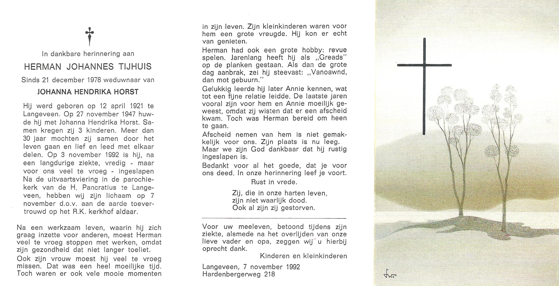 TIJHUIS, Herman Johannes, geboren op 12-4-1921 te Langeveen, overleden op 3-11-1992 op 71-jarige leeftijd, begraven op 7-11-1992 te Langeveen.