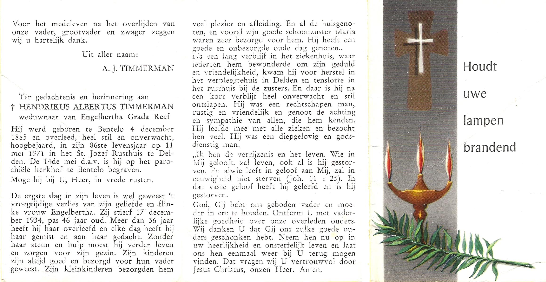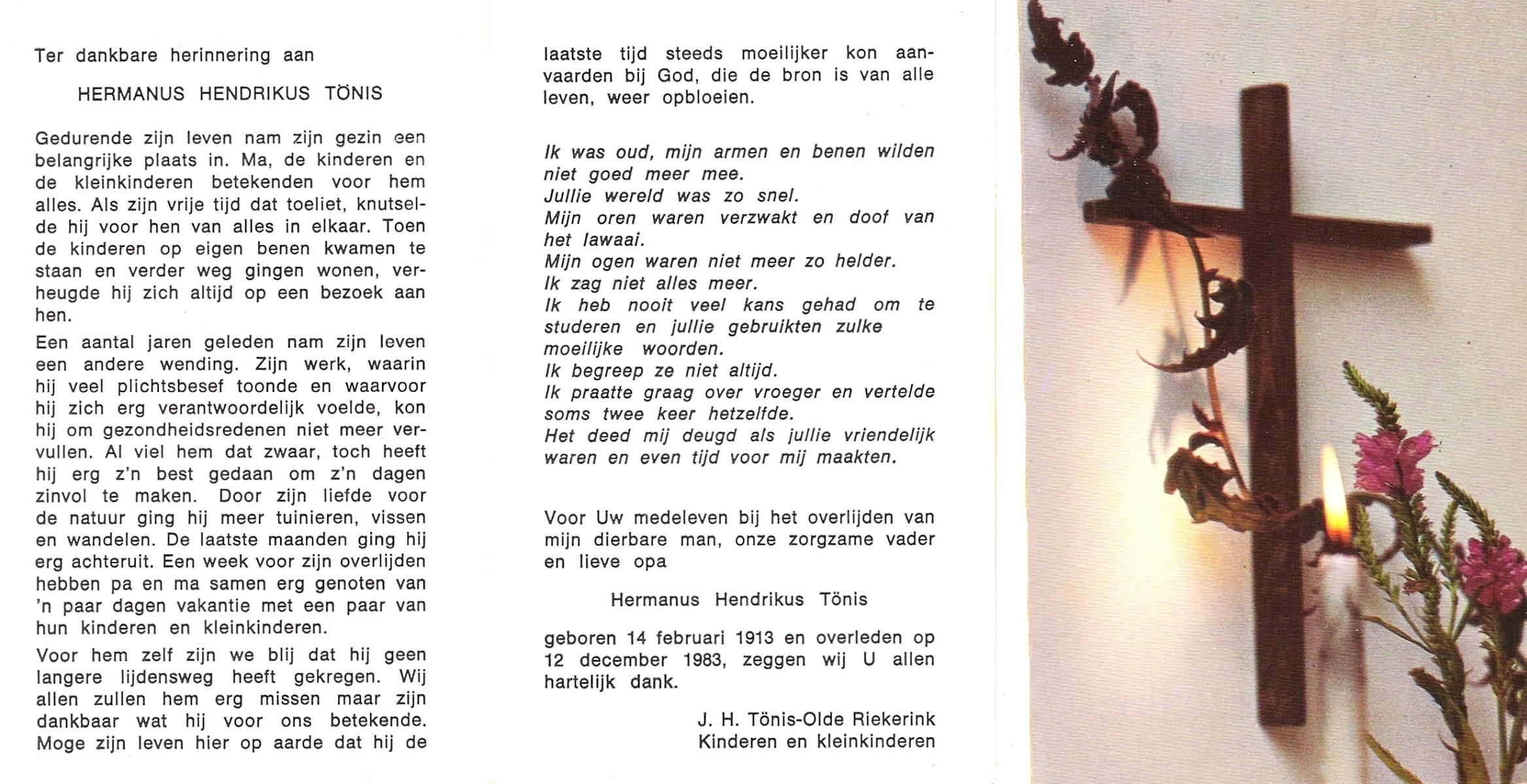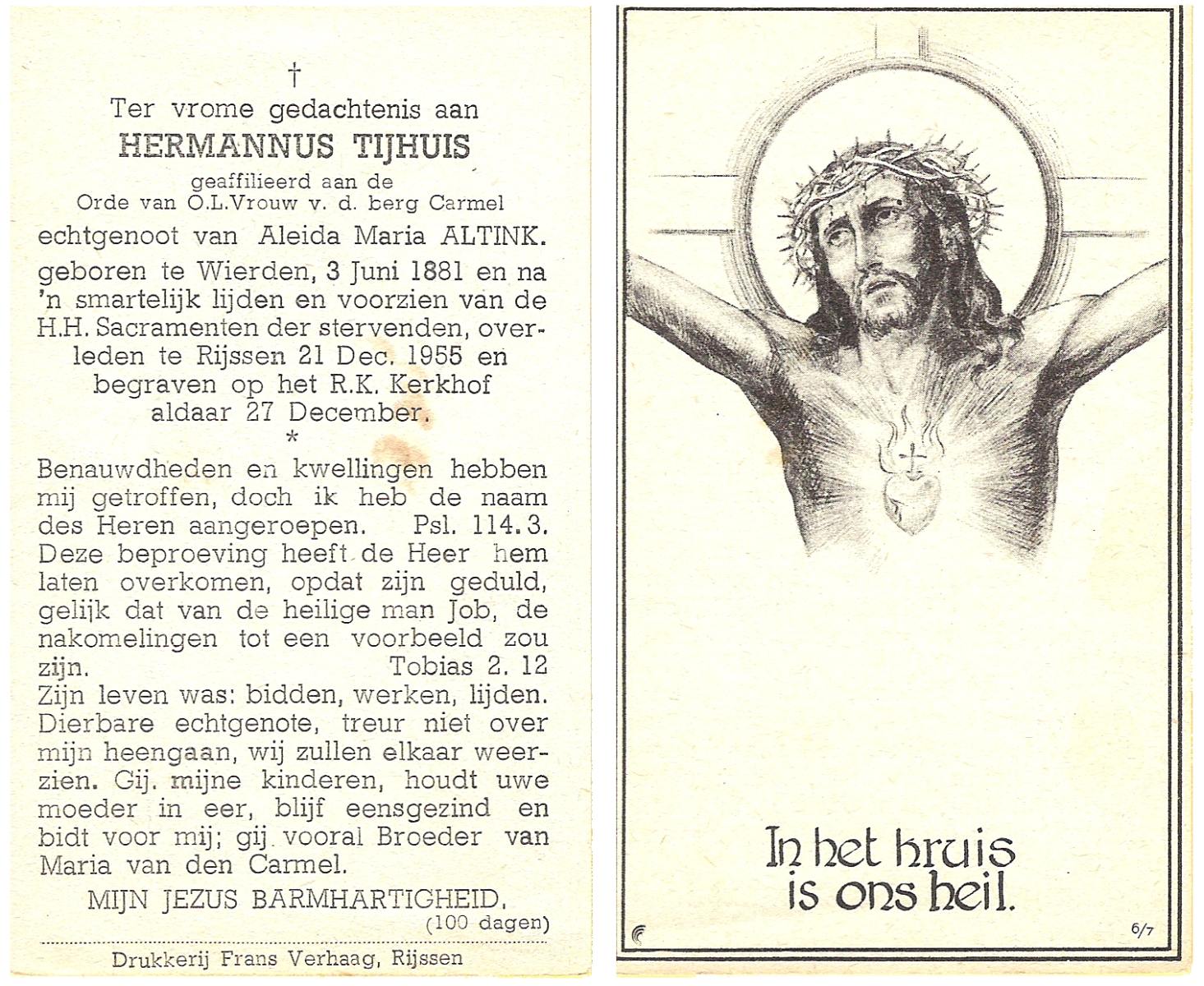 TIJHUIS, Hermannus, geboren op 03-06-1881 te Wierden, overleden op 21-12-1955 te Rijssen op 74-jarige leeftijd, begraven op 27-12-1955 te Rijssen.