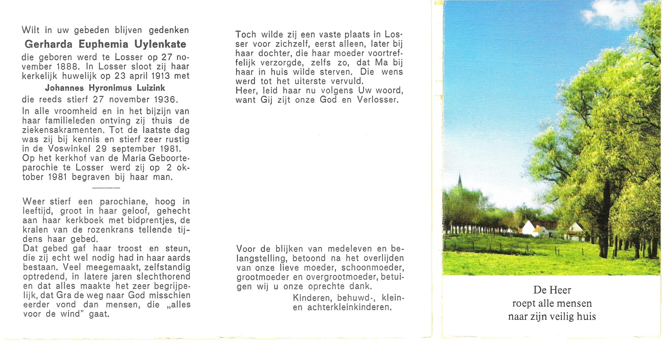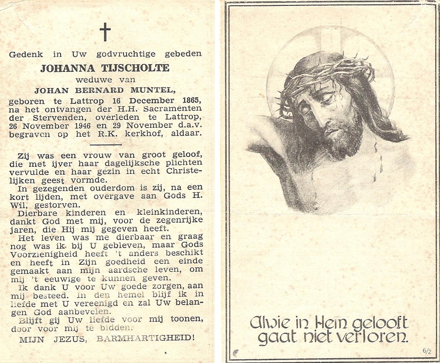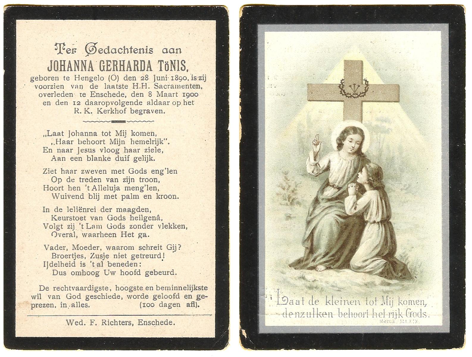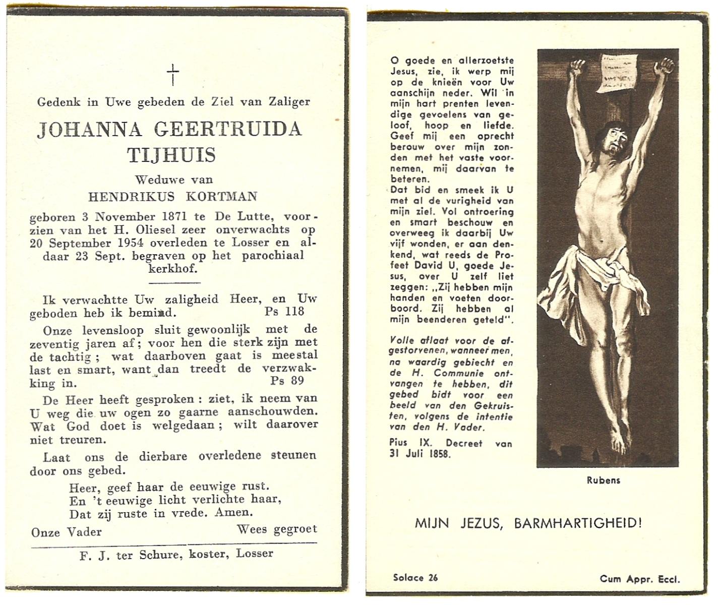 TIJHUIS, Johanna Geertruida, geboren op 03-11-1871 te De Lutte, overleden op 20-9-1954 te Losser op 82-jarige leeftijd, begraven op 23-9-1954 te Losser.