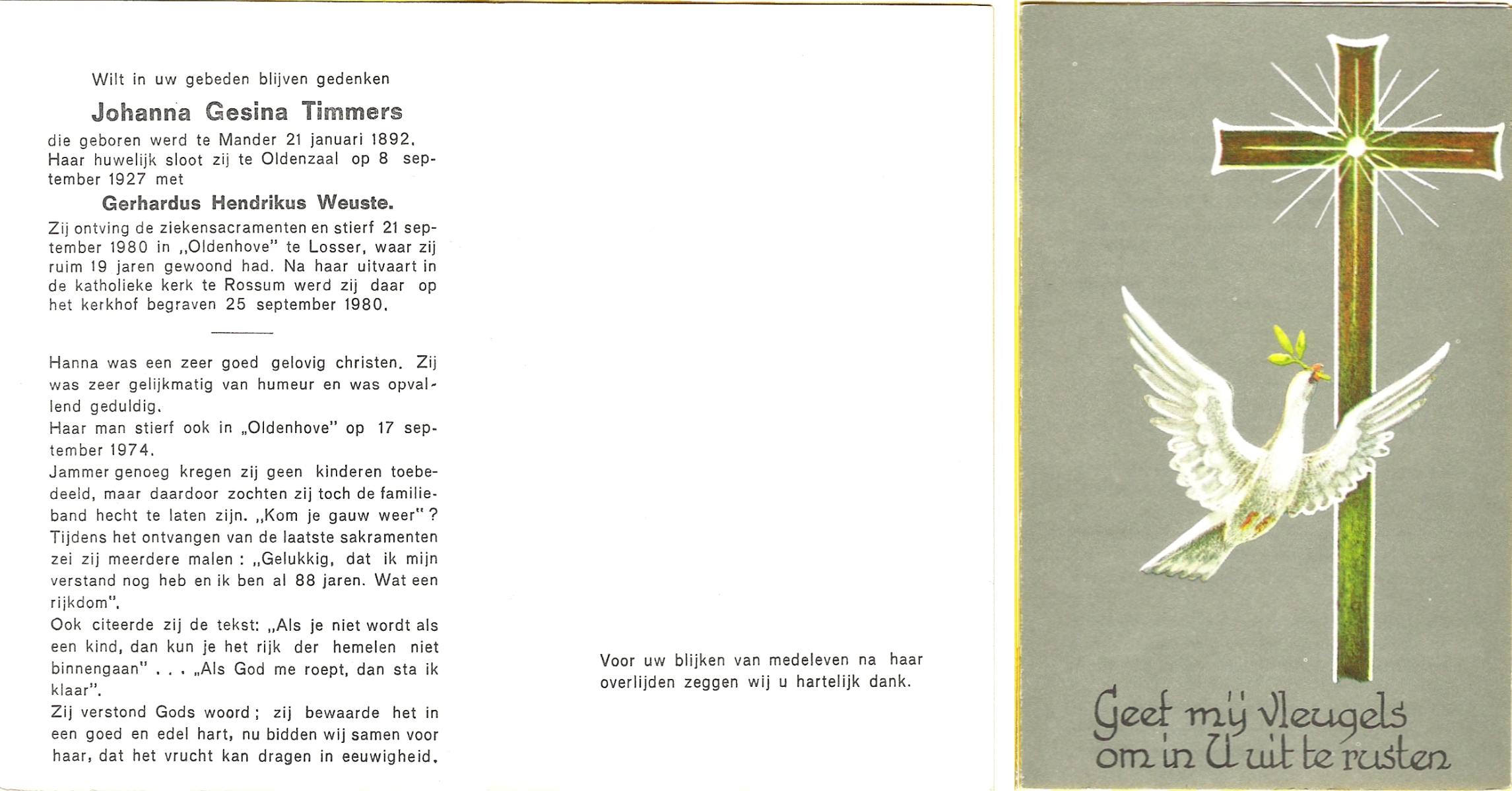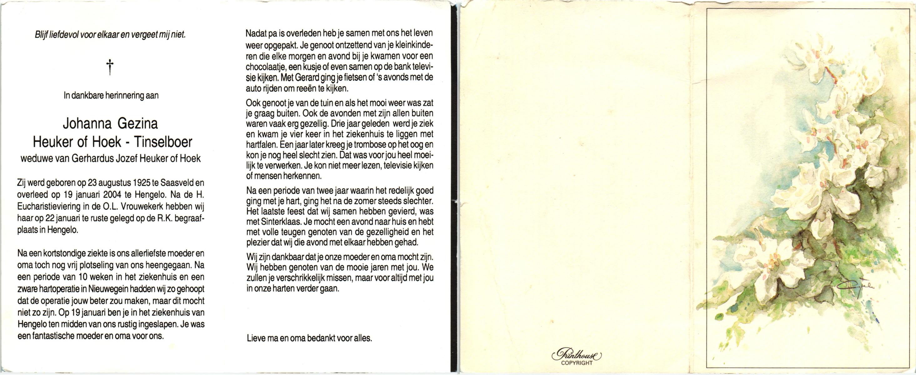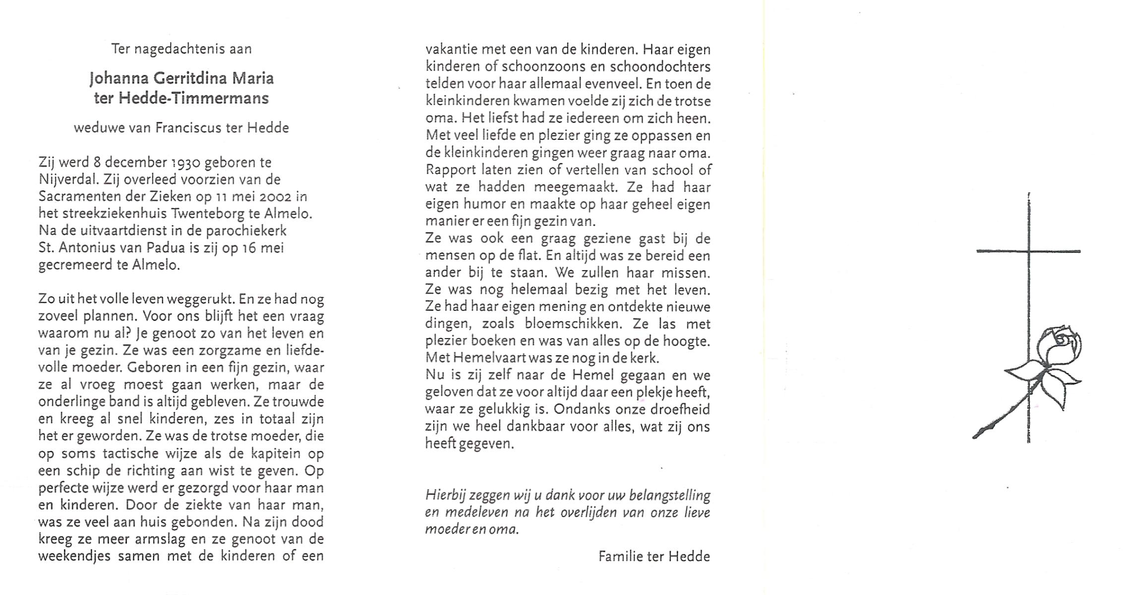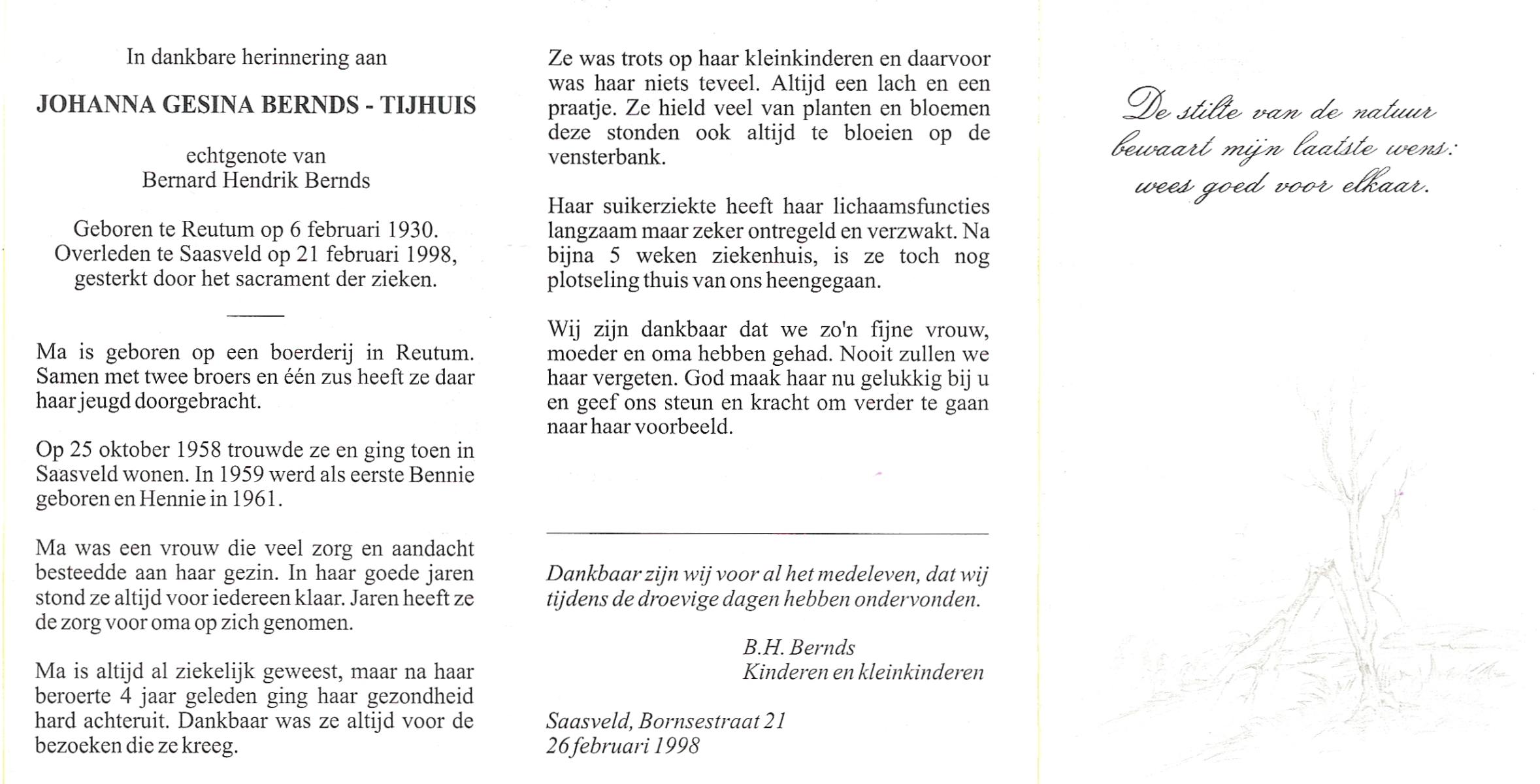 TIJHUIS, Johanna Gesina, geboren op 6-2-1930 te Reutum, overleden op 21-2-1998 te Saasveld op 68-jarige leeftijd.