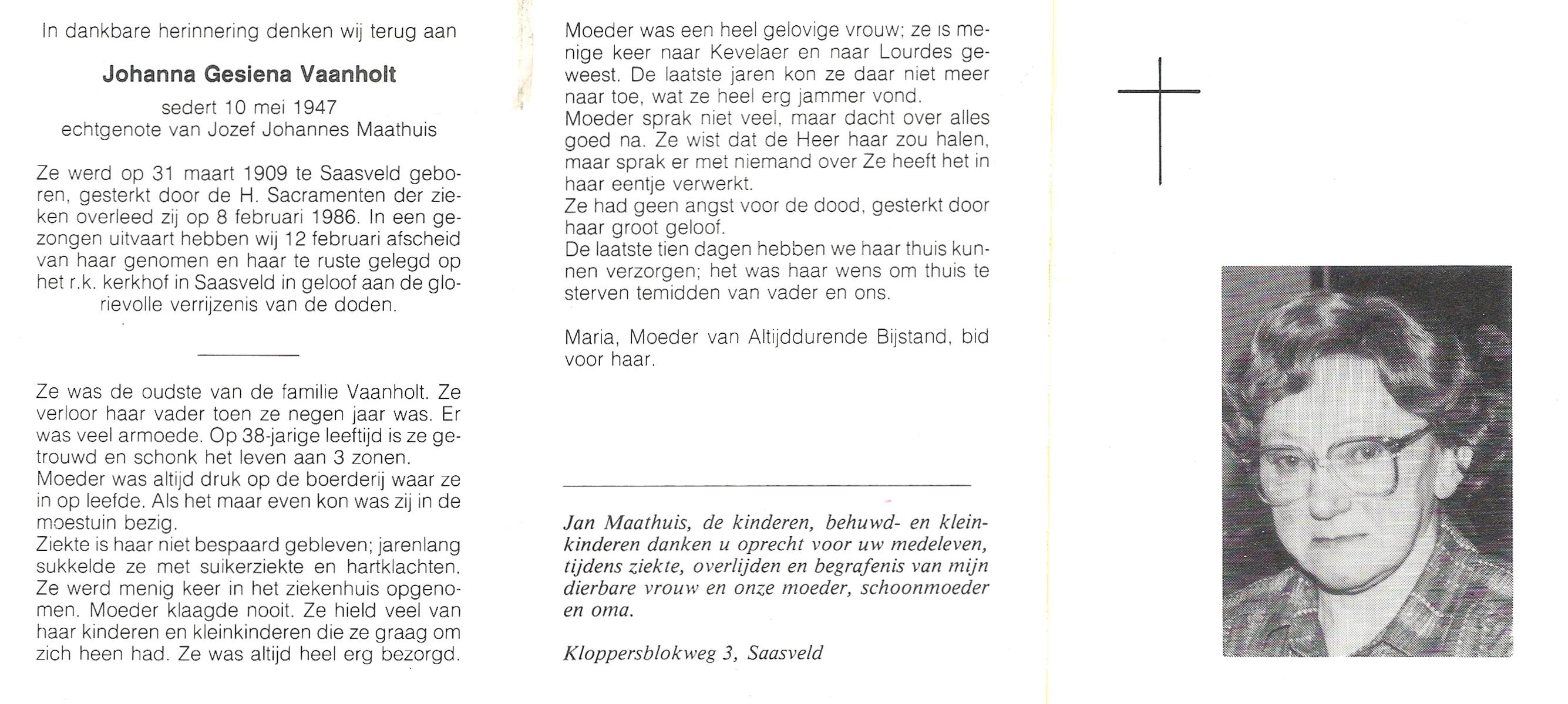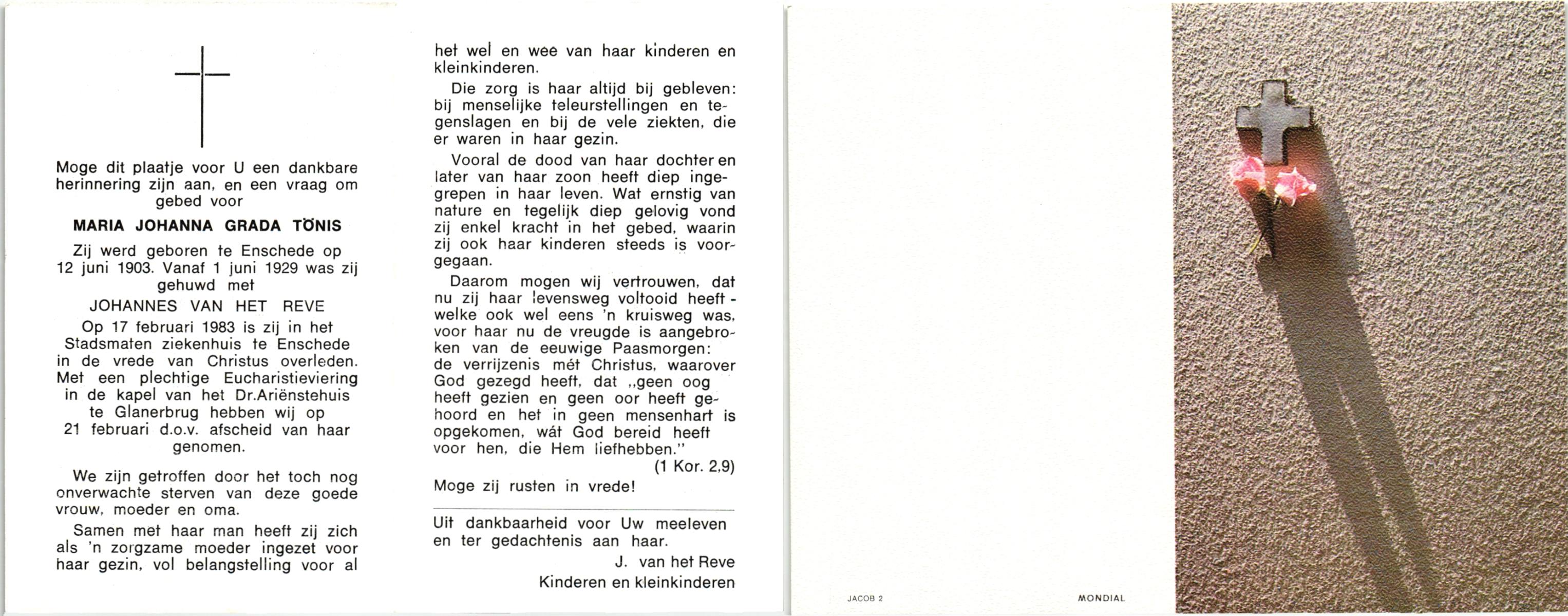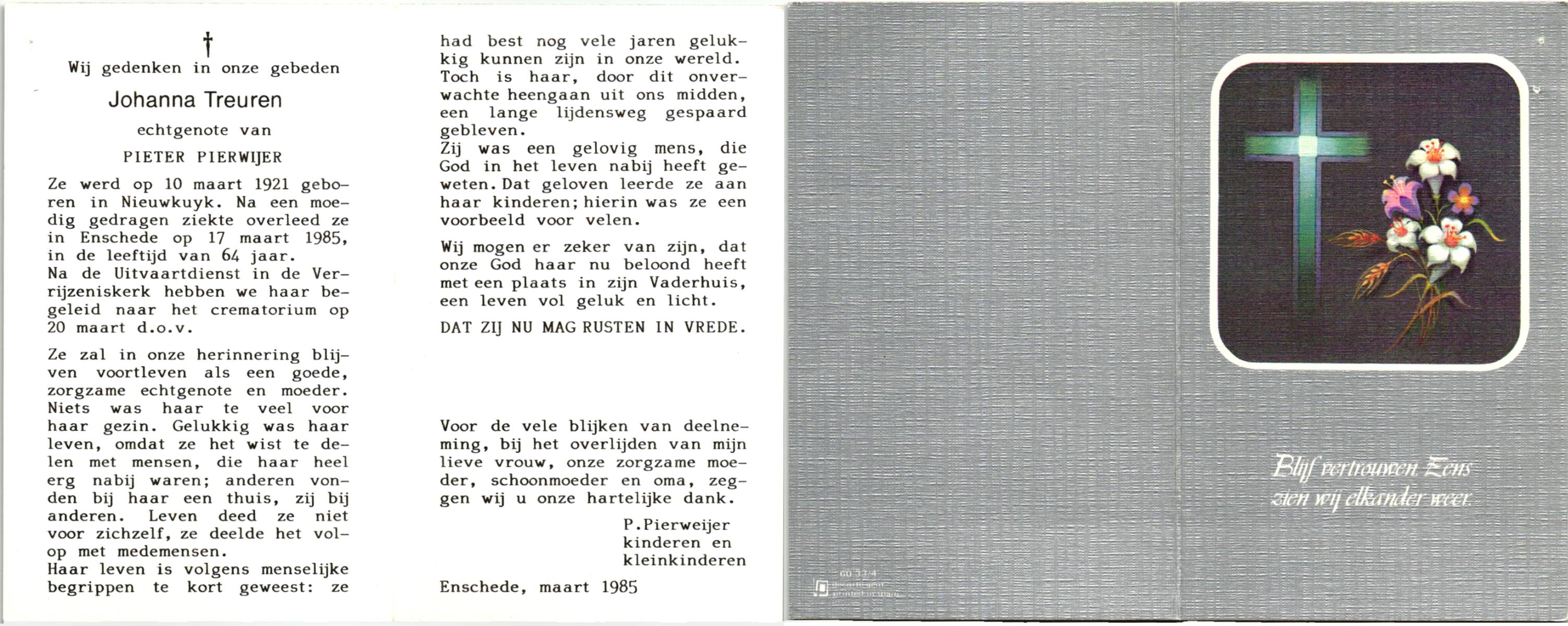 TIJHUIS, Johanna Gesina, geboren op 6-2-1930 te Reutum, overleden op 21-2-1998 te Saasveld op 68-jarige leeftijd.
