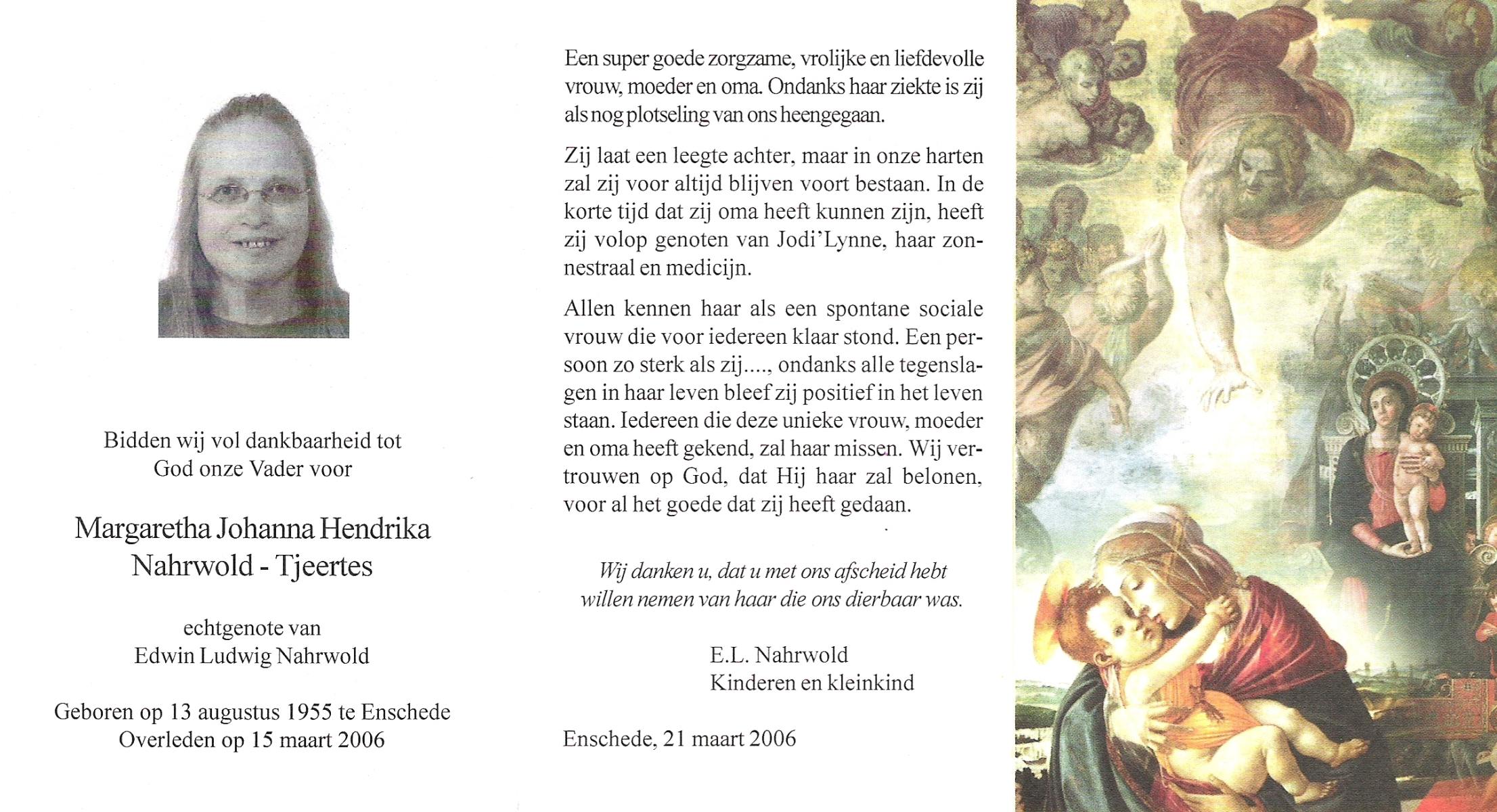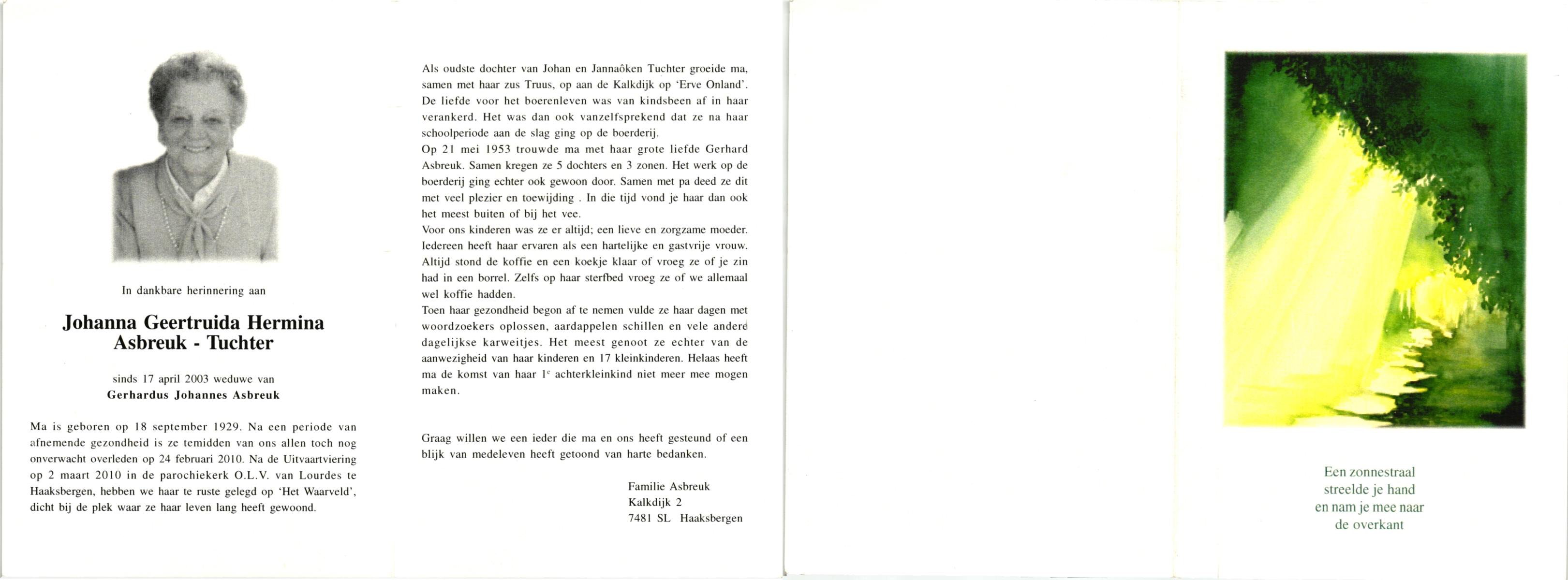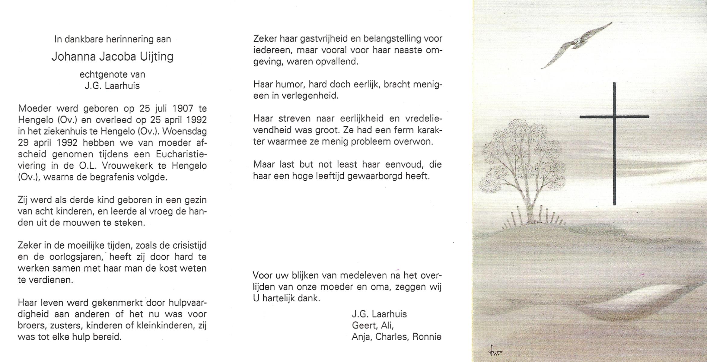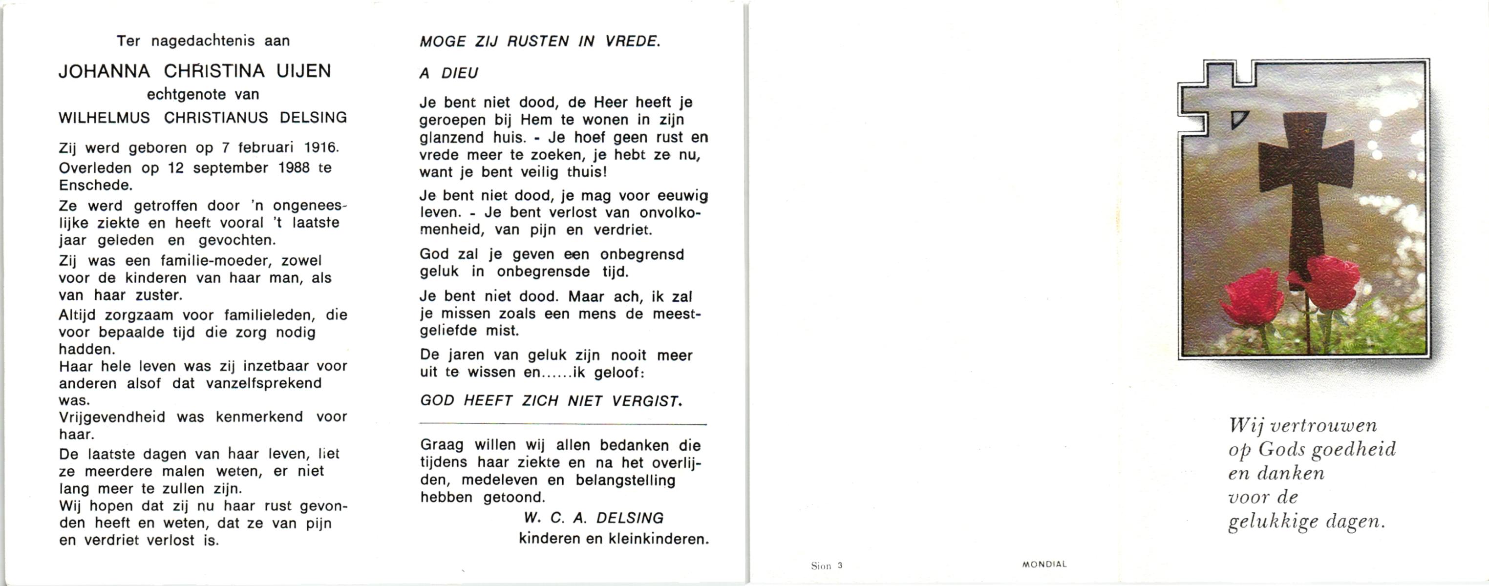 TIJHUIS, Johanna Gesina, geboren op 6-2-1930 te Reutum, overleden op 21-2-1998 te Saasveld op 68-jarige leeftijd.