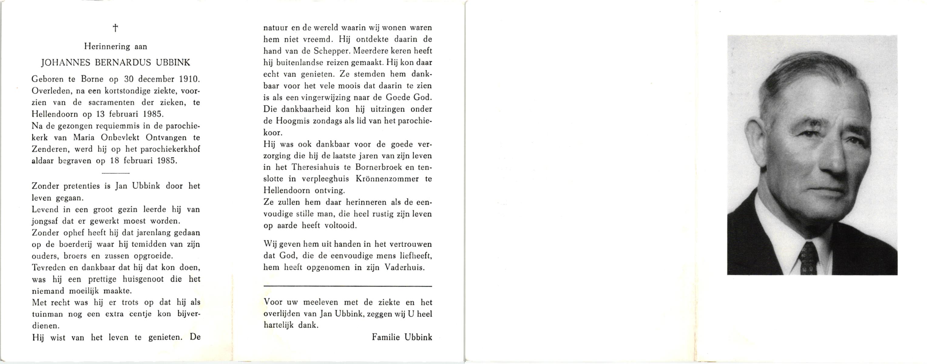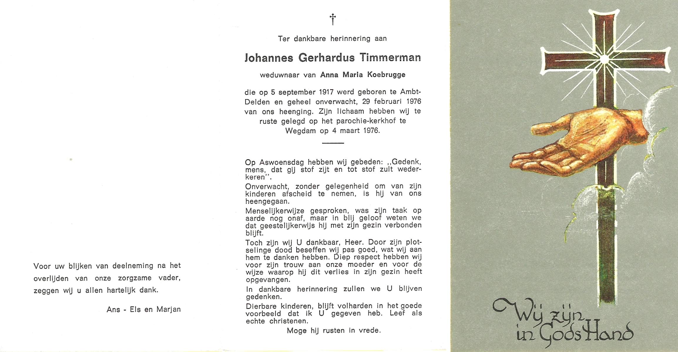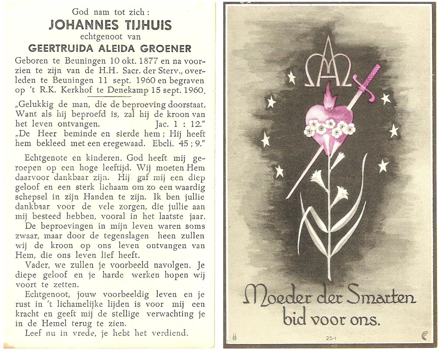 TIJHUIS, Johannes, geboren op 10-10-1877 te Beuningen (Ov.), overleden op 11-9-1960 te Beuningen op 82-jarige leeftijd, begraven op 15-9-1960 te Beuningen R.K.kerkhof.