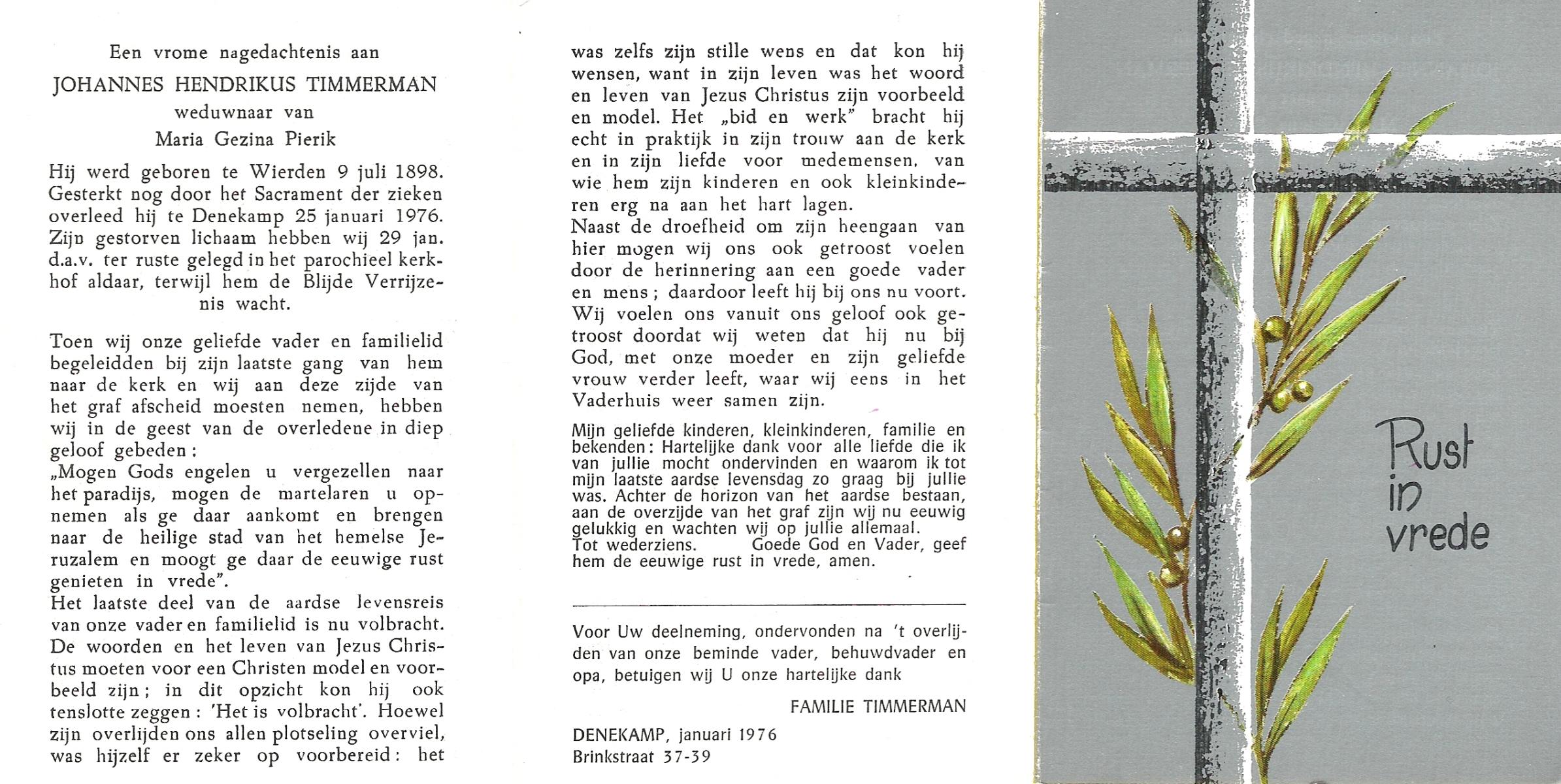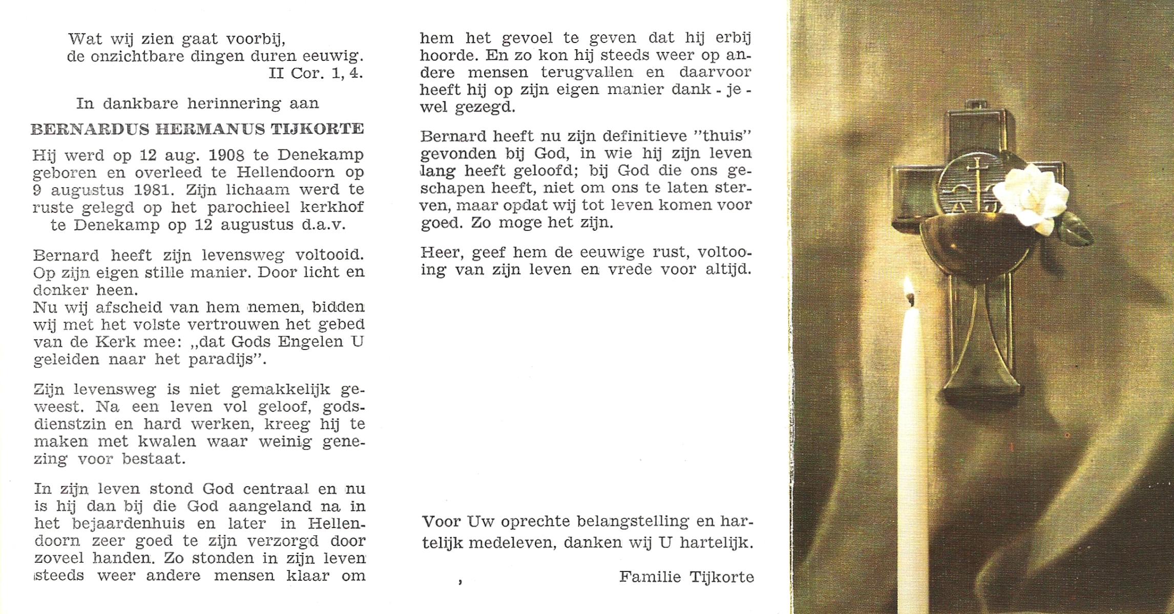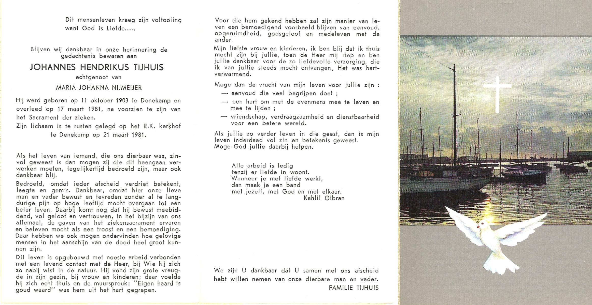 TIJHUIS, Johannes Hendrikus, geboren op 11-10-1903 te Denekamp, overleden op 17-3-1981 op 77-jarige leeftijd, begraven op 21-3-1981 te Denekamp R.K.kerkhof.