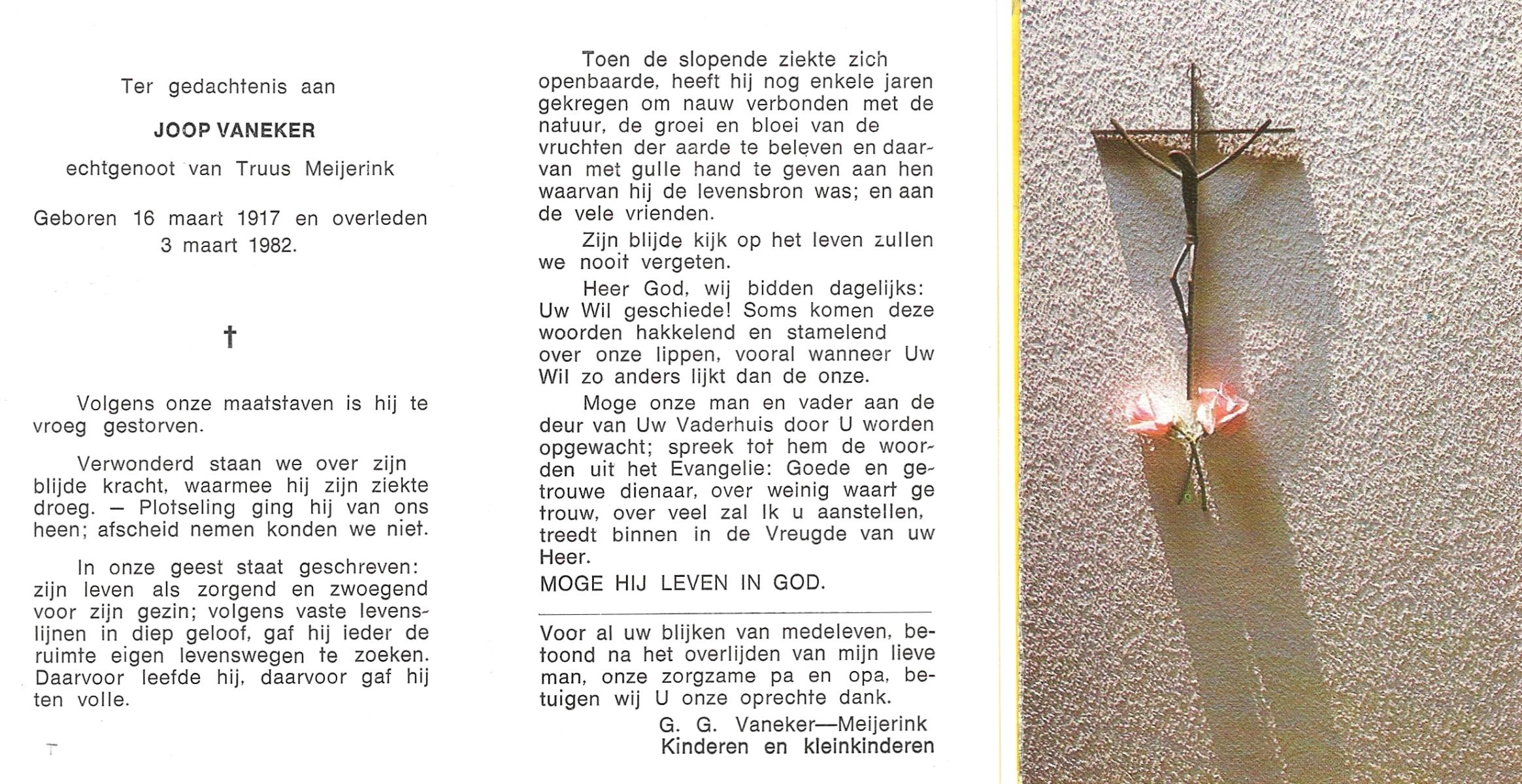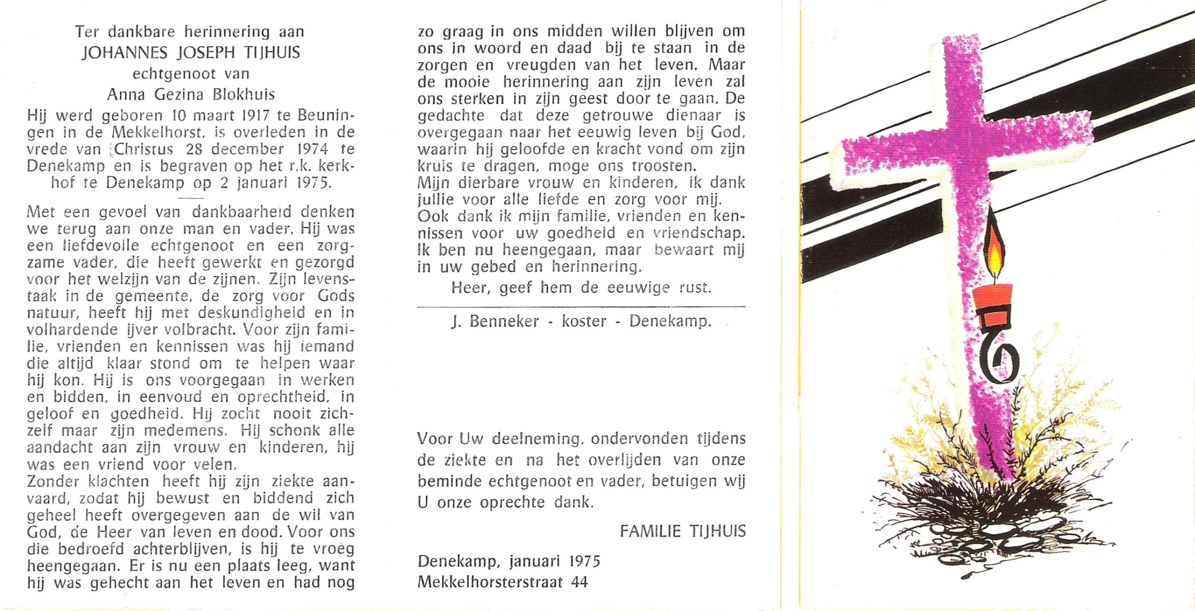 TIJHUIS, Johannes Joseph, geboren op 10-3-1917 te Beuningen (Ov.), overleden op 28-12-1974 te Denekamp op 57-jarige leeftijd, begraven op 2-1-1975 te Denekamp R.K.kerkhof.
