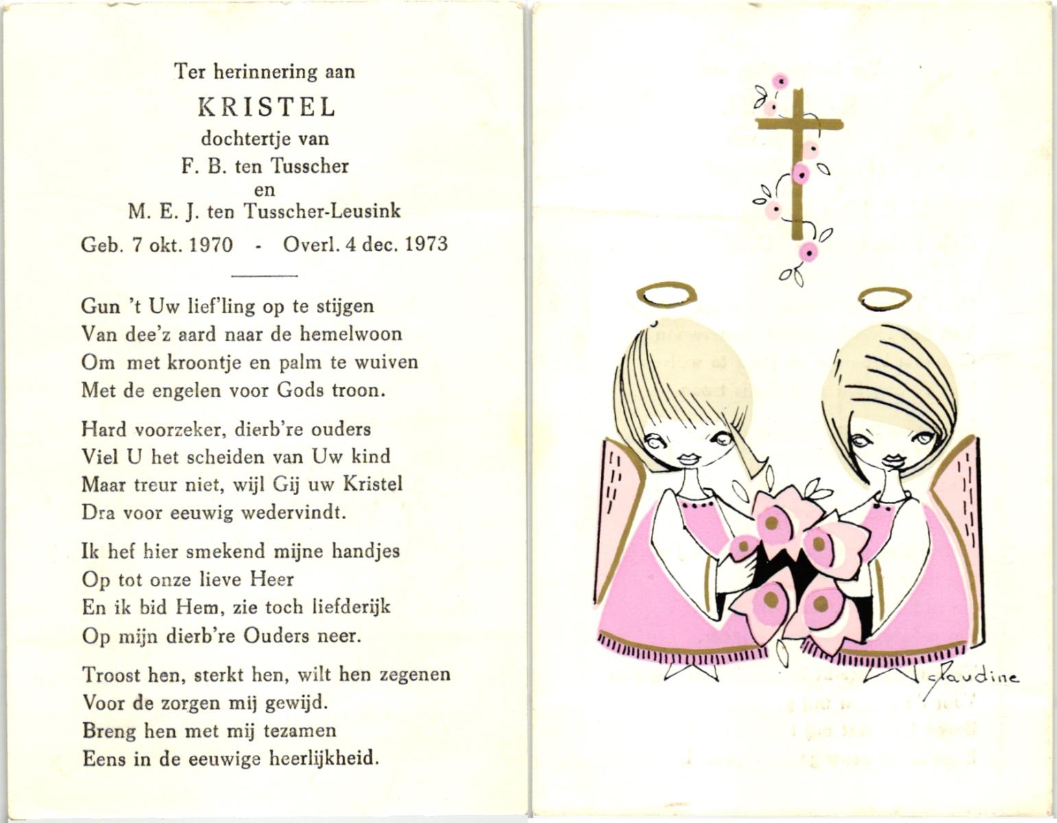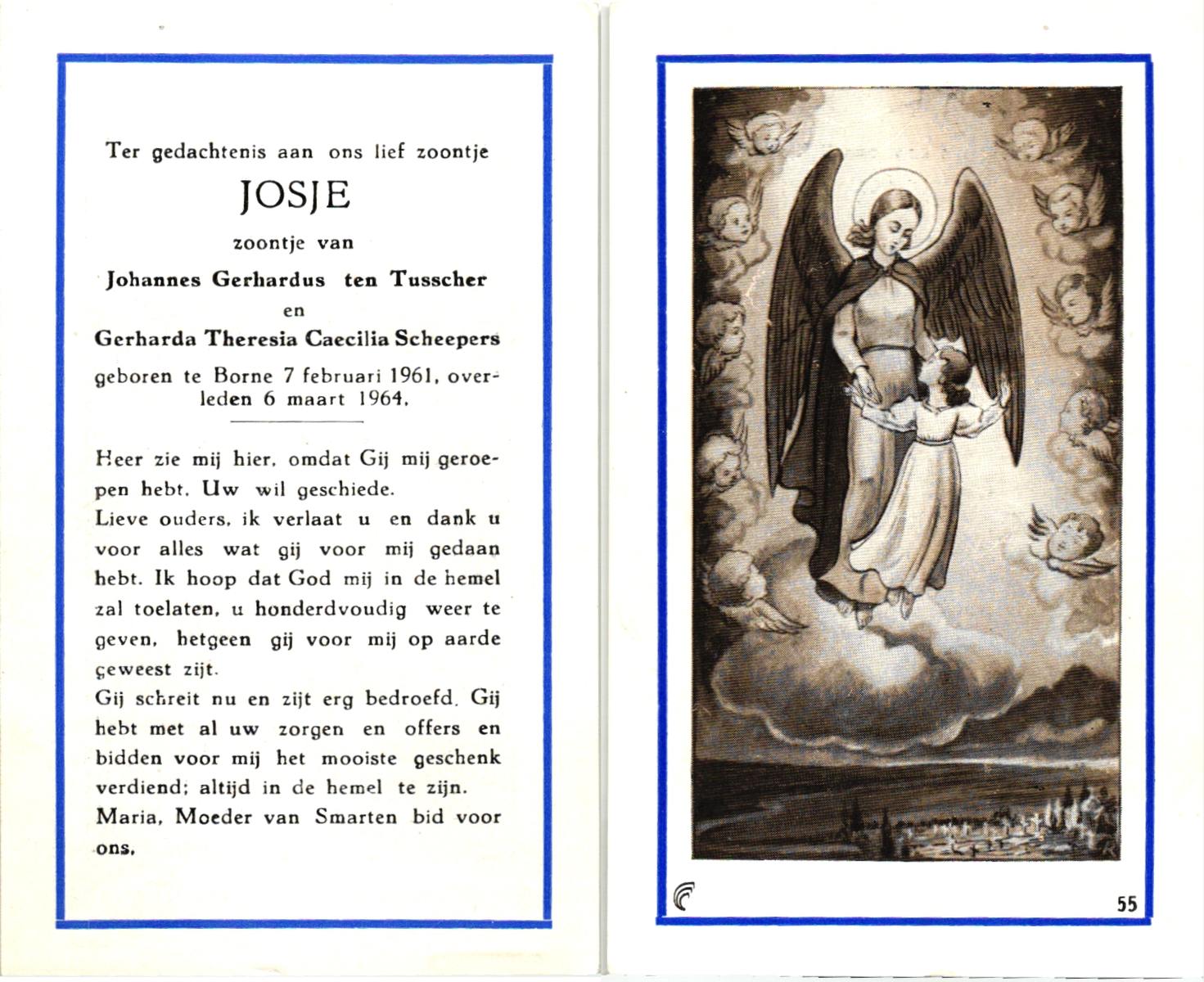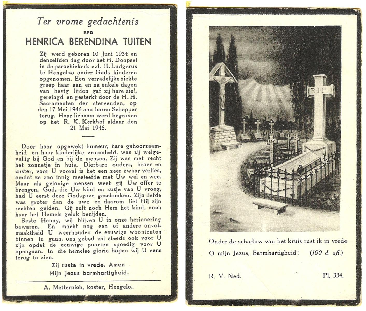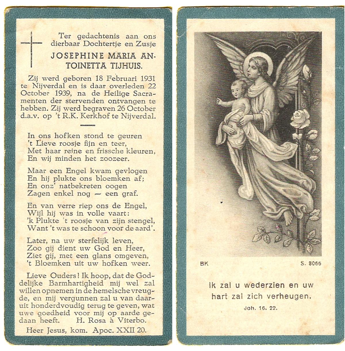 TIJHUIS, Josephine Maria Antoinetta, geboren op 18-2-1931 te Hellendoorn, Nijverdal, overleden op 22-10-1939 te Hellendoorn, Nijverdal op 8-jarige leeftijd, begraven op 26-10-1939 te Hellendoorn, Nijverdal.