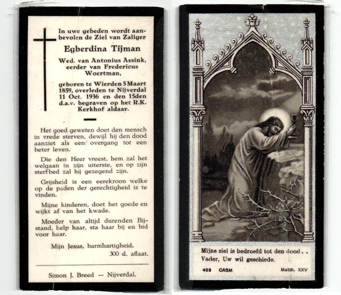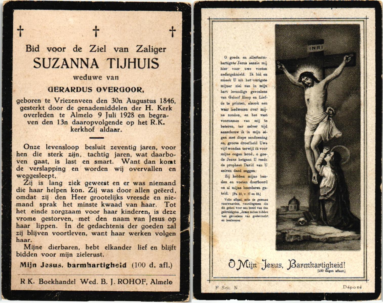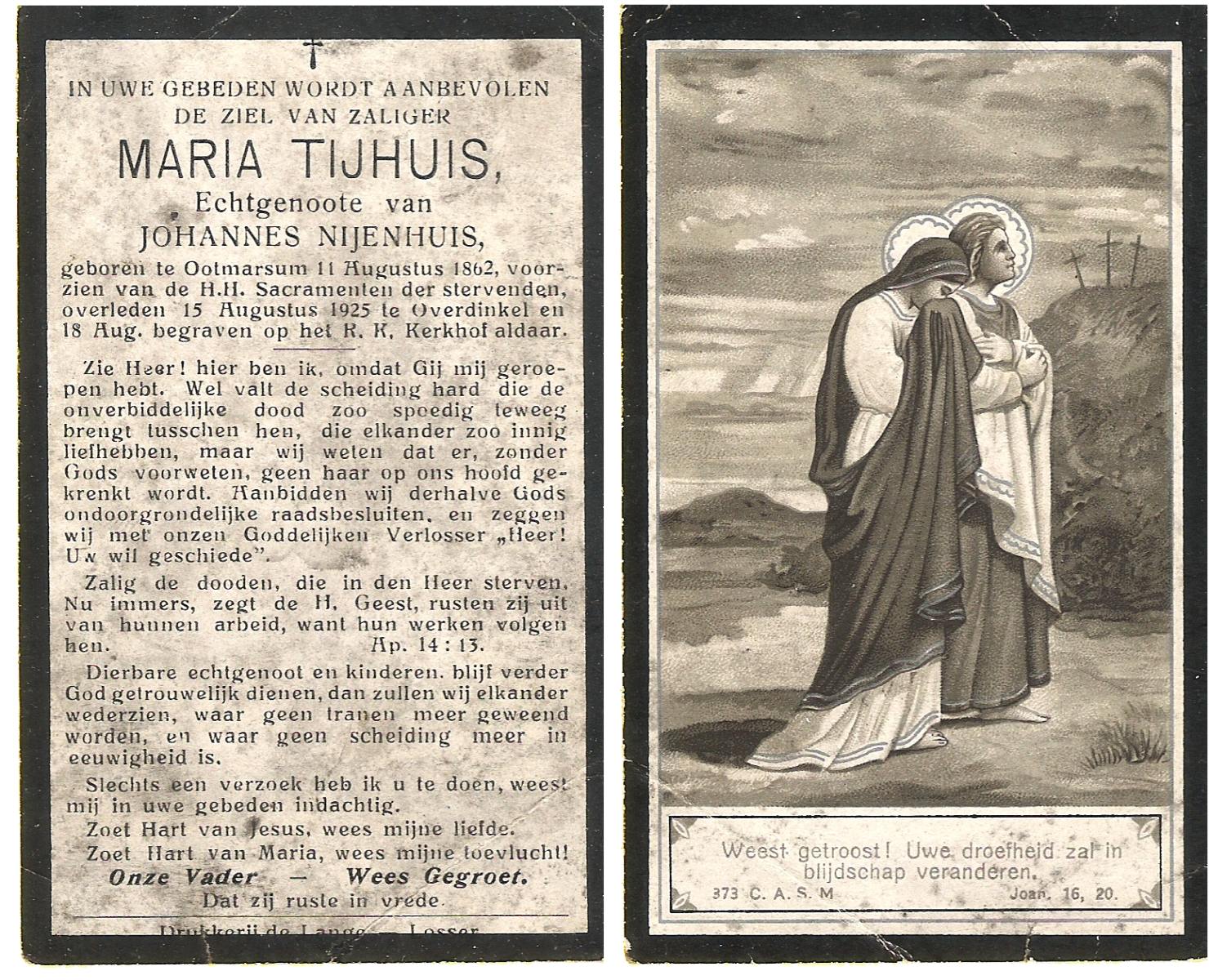 TIJHUIS, Maria, geboren op 11-08-1862 te Ootmarsum, overleden op 15-8-1925 te Overdinkel op 63-jarige leeftijd, begraven op 18-8-1925 te Overdinkel.