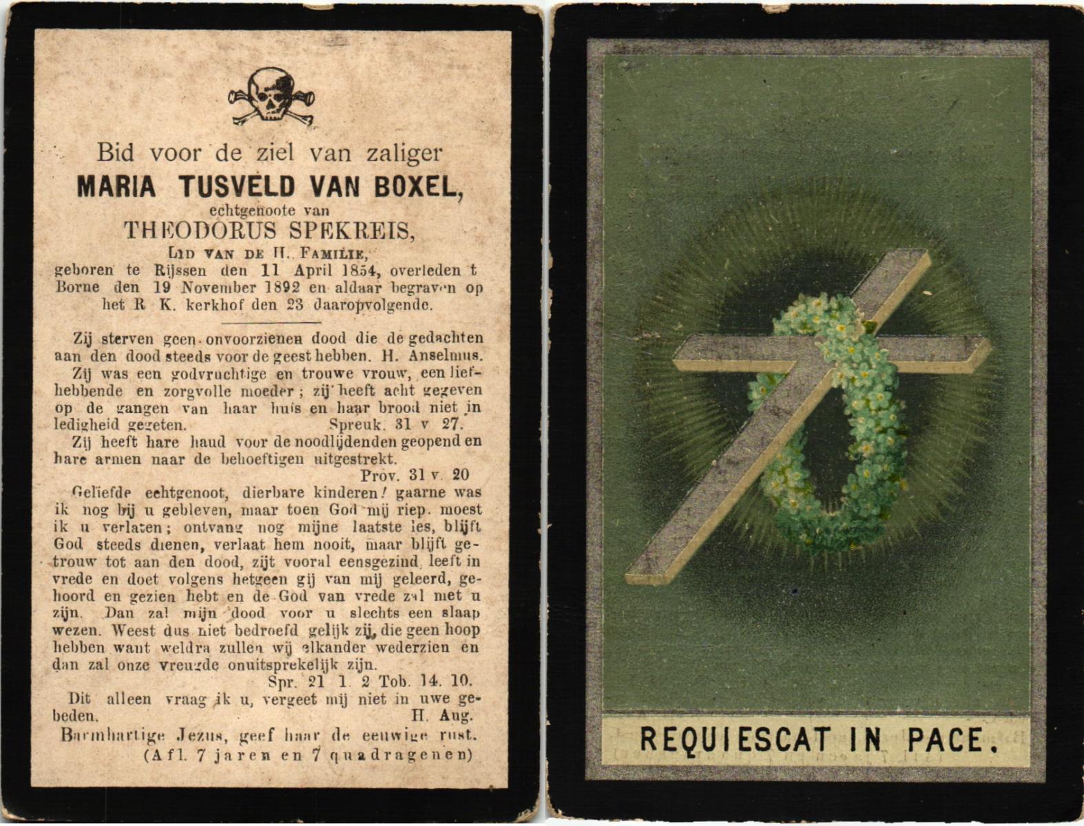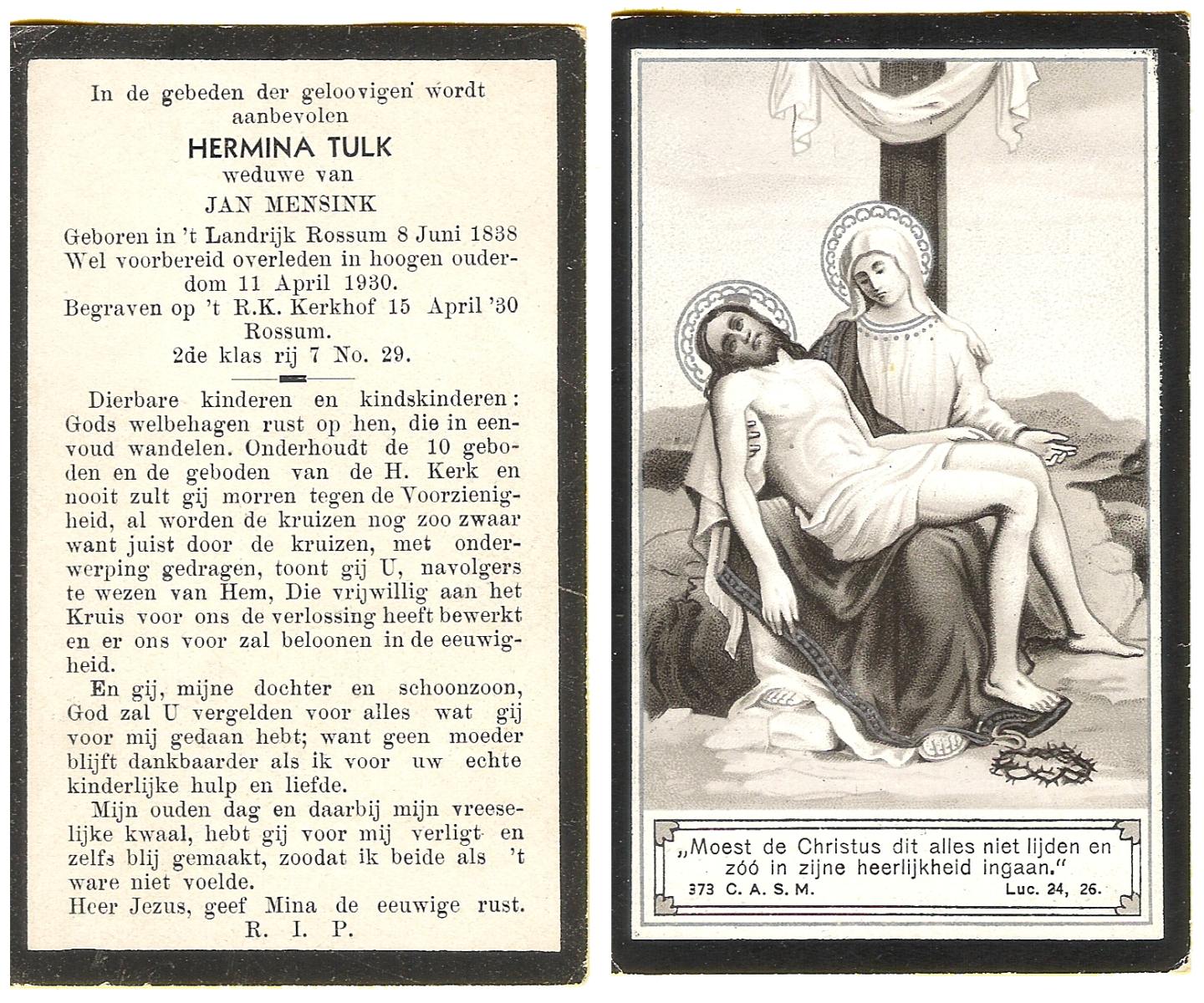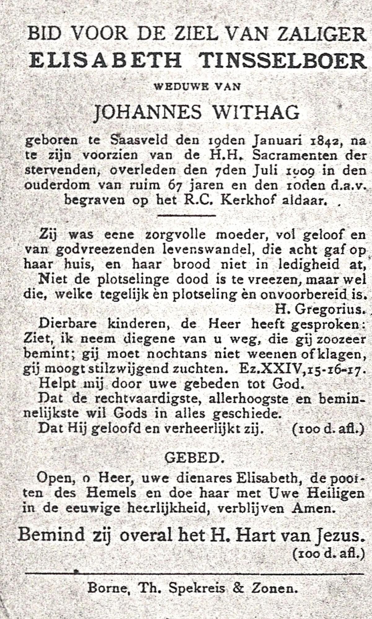 TIJHUIS, Maria, geboren op 11-08-1862 te Ootmarsum, overleden op 15-8-1925 te Overdinkel op 63-jarige leeftijd, begraven op 18-8-1925 te Overdinkel.