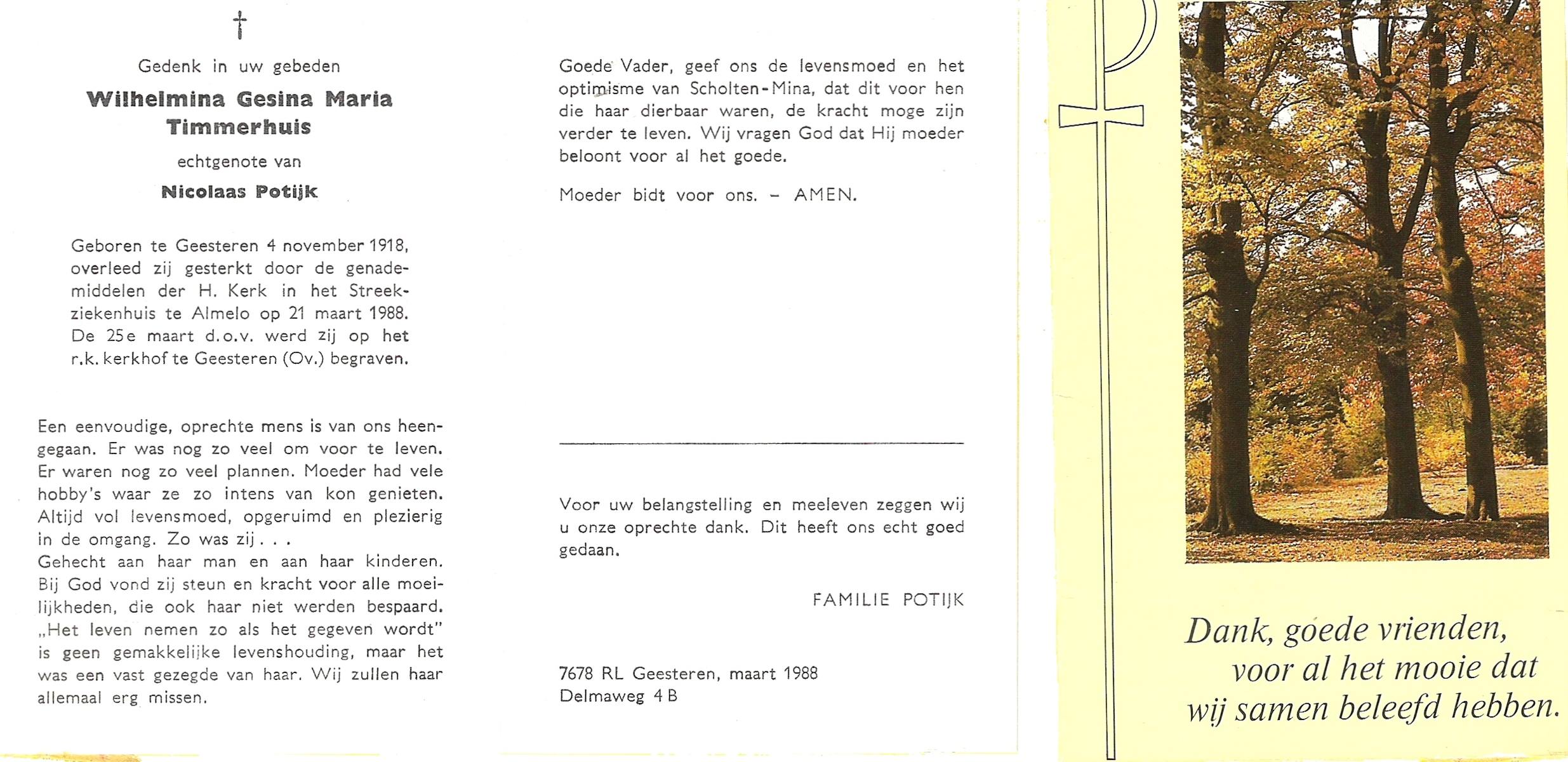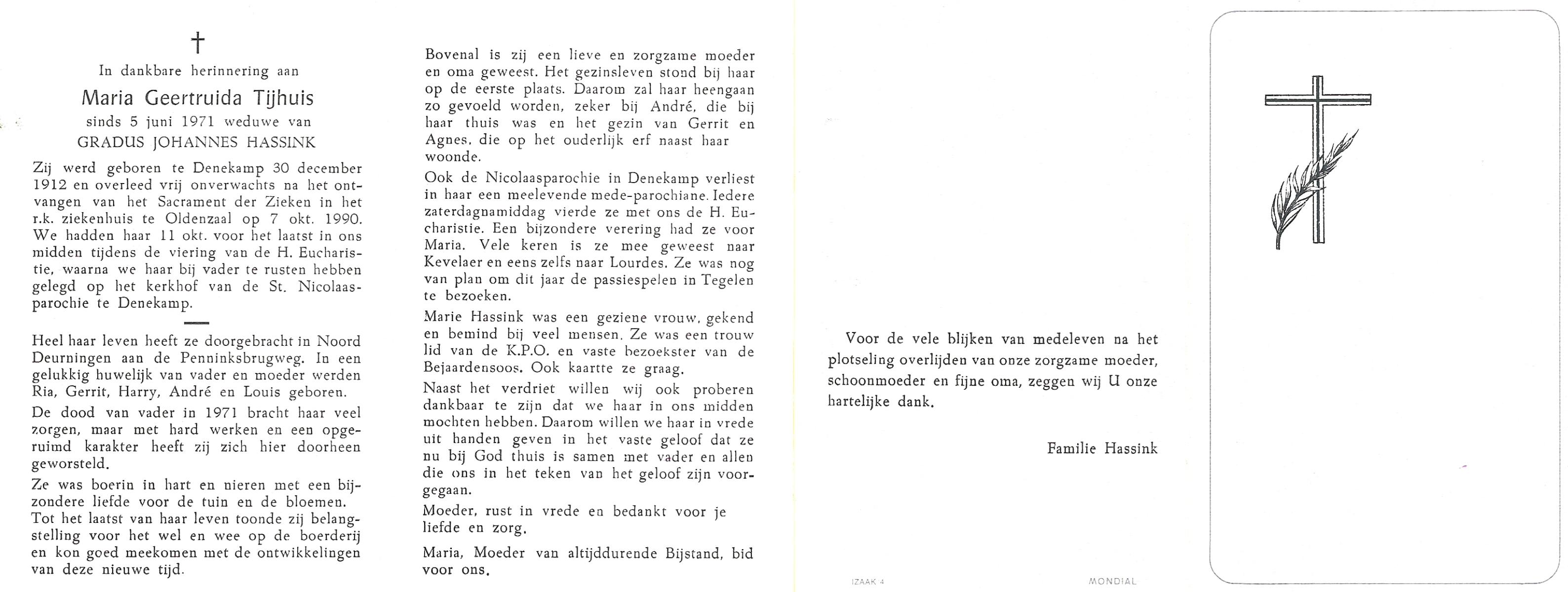 TIJHUIS, Maria Geertruida, geboren op 30-12-1912 te Denekamp, overleden op 7-10-1990 te Oldenzaal op 77-jarige leeftijd, begraven op 11-10-1990 te Denekamp kloosterkerkhof St.Nicalaasstichting.