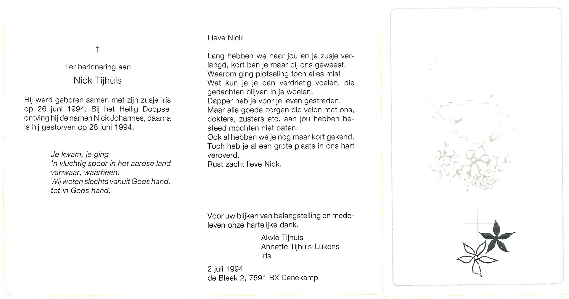 TIJHUIS, Nick, geboren op 26-6-1994 te Denekamp, overleden op 28-6-1994 te Denekamp op 0-jarige leeftijd.