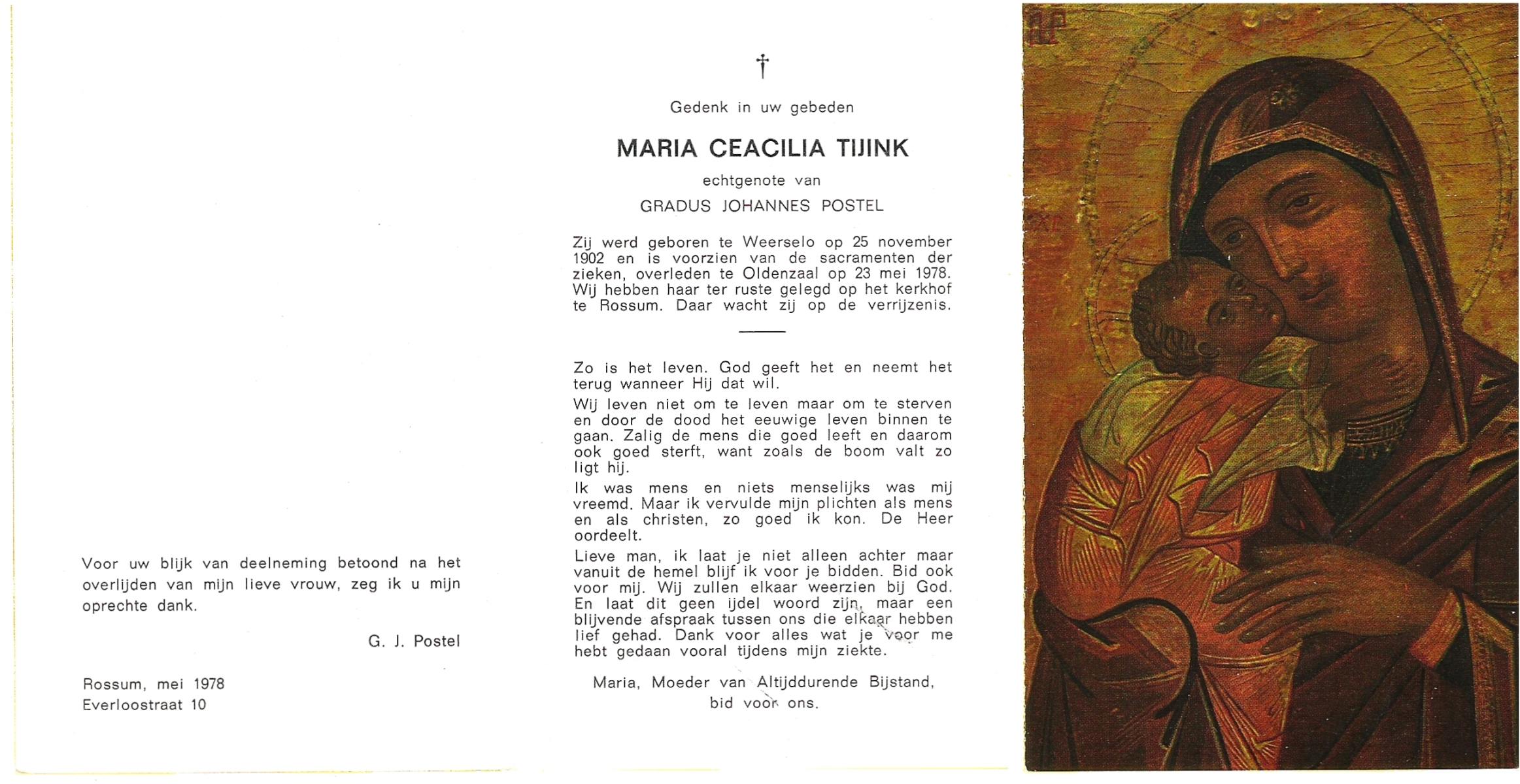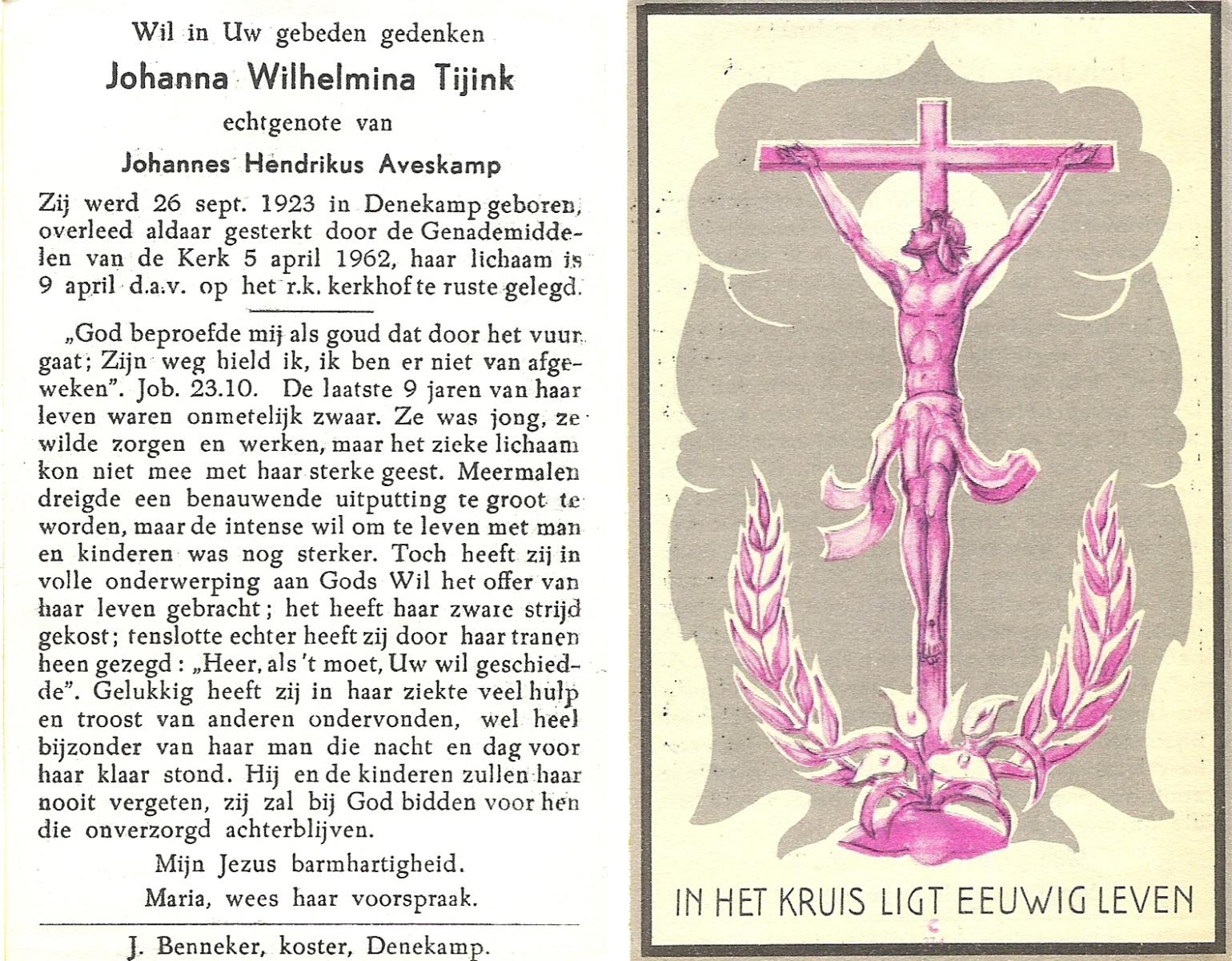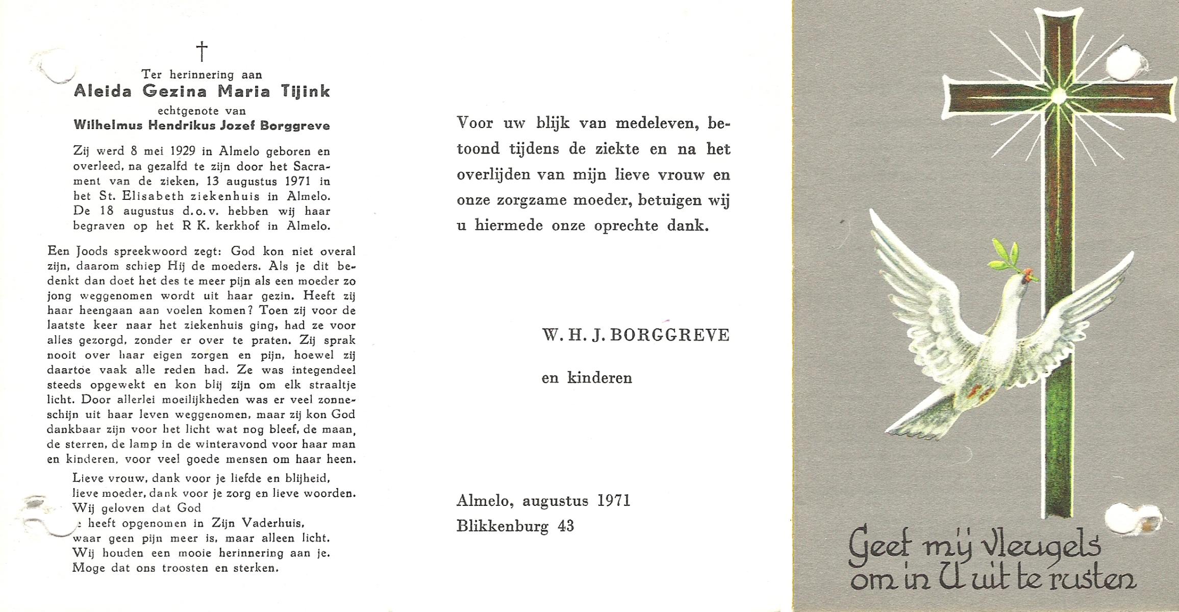 TIJINK, Aleida Gezina Maria, geboren op 8-5-1929 te Almelo, overleden op 13-8-1971 te Almelo op 42-jarige leeftijd, begraven op 18-8-1971 te Almelo.