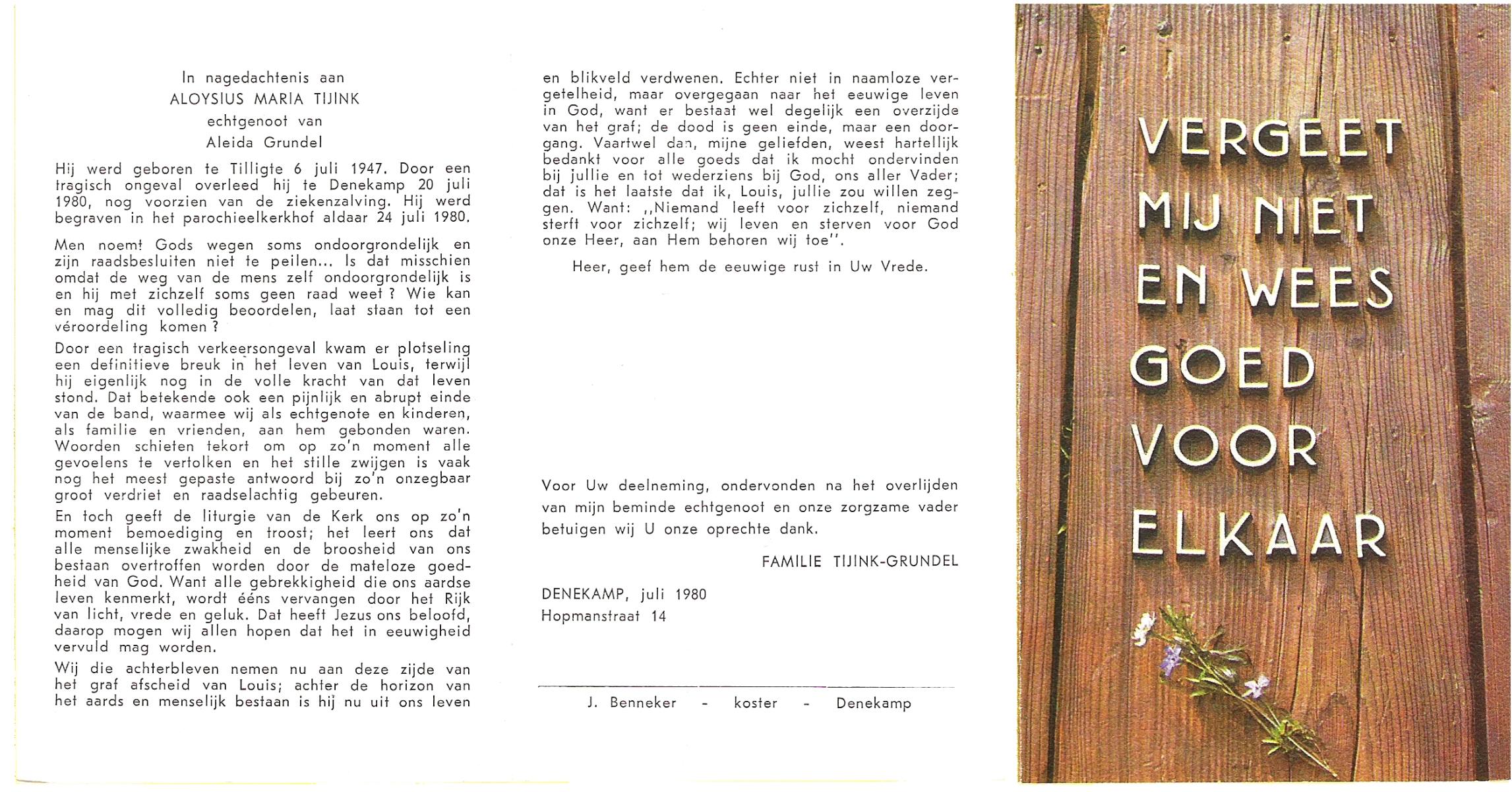 TIJINK, Aloysius Maria, geboren op 6-7-1947 te Tilligte, overleden op 20-7-1980 te Denekamp op 33-jarige leeftijd, begraven op 24-7-1980 te Denekamp R.K.kerkhof.