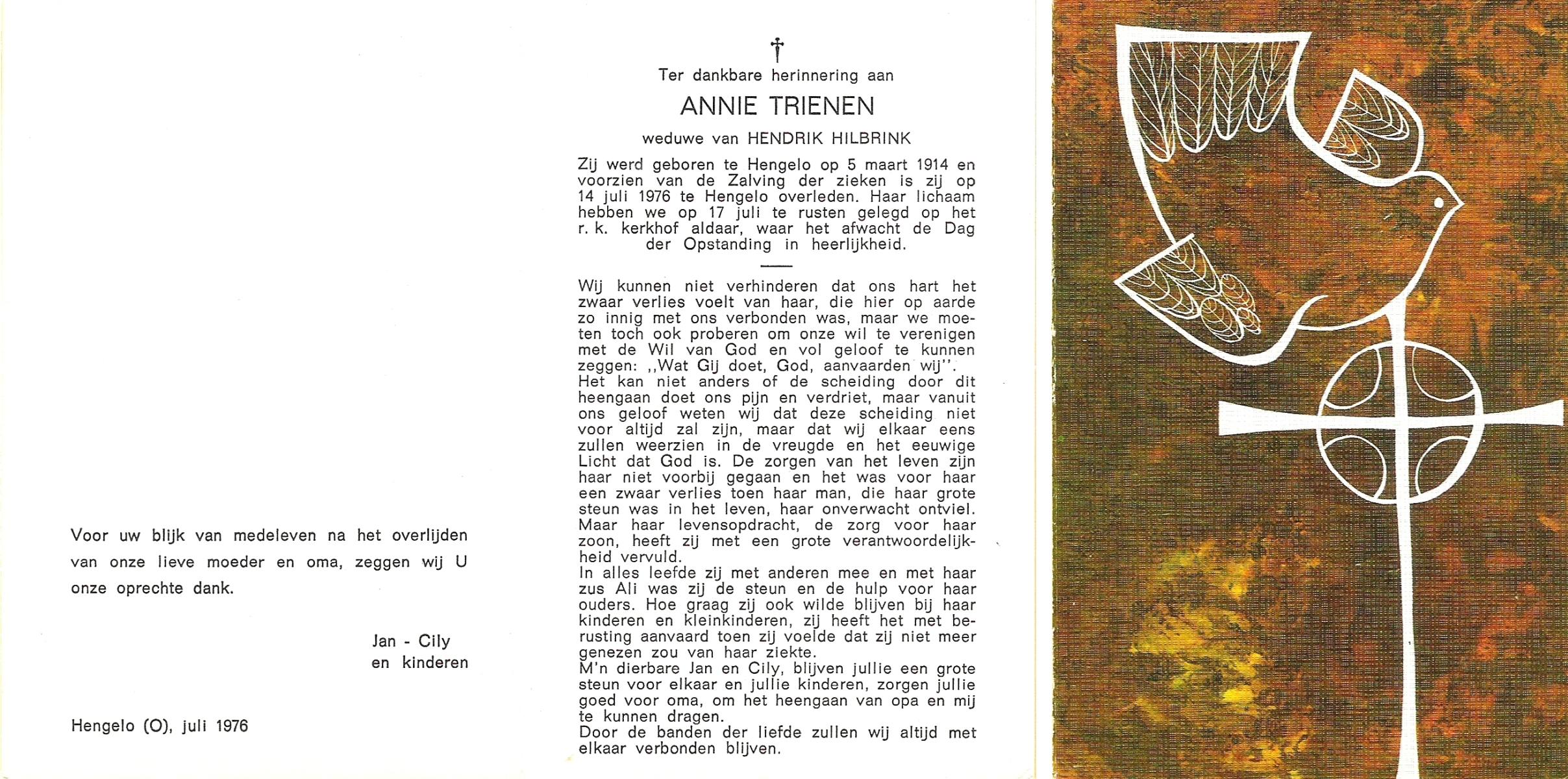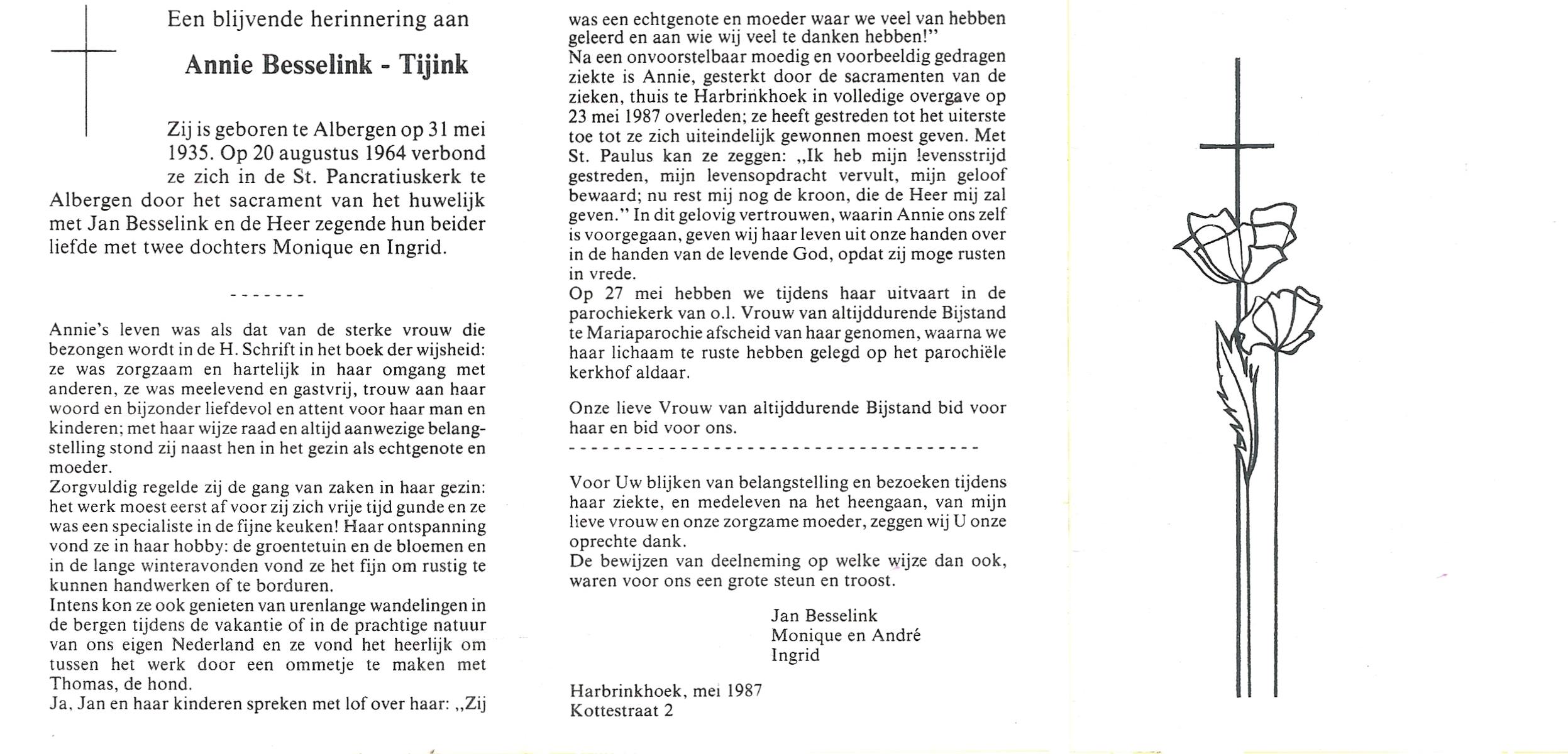 TIJINK, Annie, geboren op 31-5-1935 te Albergen, overleden op 23-5-1987 te Almelo, Harbrinkhoek op 51-jarige leeftijd, begraven op 27-5-1987 te Almelo.
