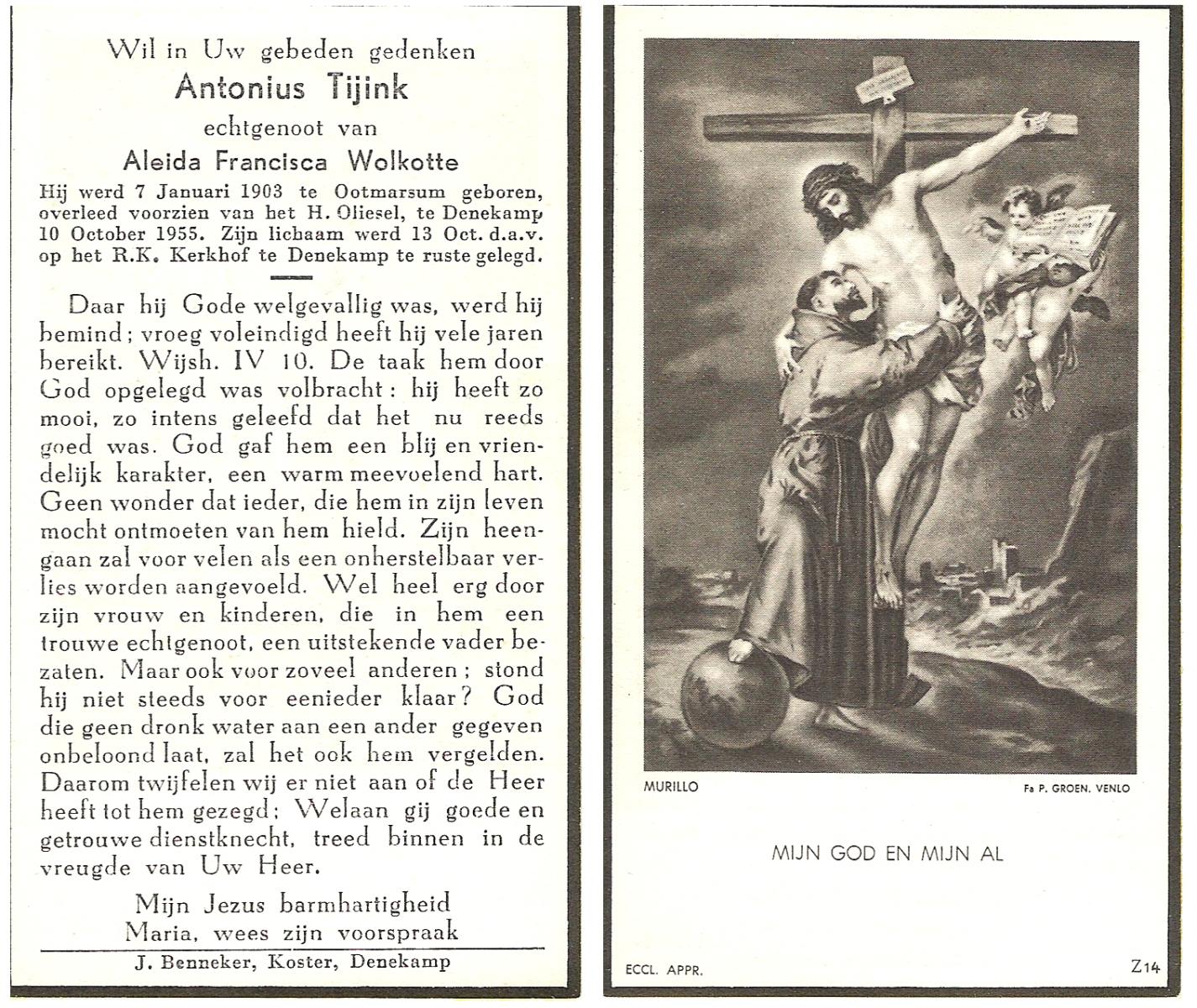 TIJINK, Antonius, geboren op 7-1-1903 te Ootmarsum, overleden op 10-10-1955 te Denekamp op 52-jarige leeftijd, begraven op 13-10-1955 te Denekamp R.K.kerkhof.