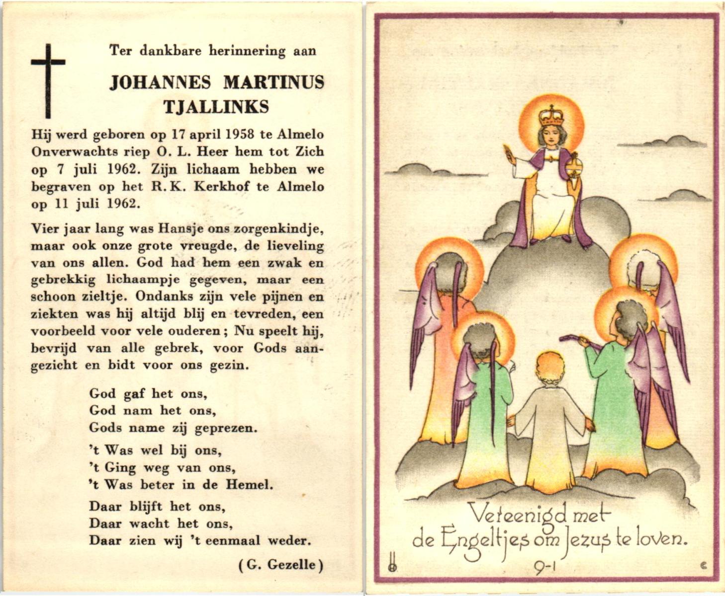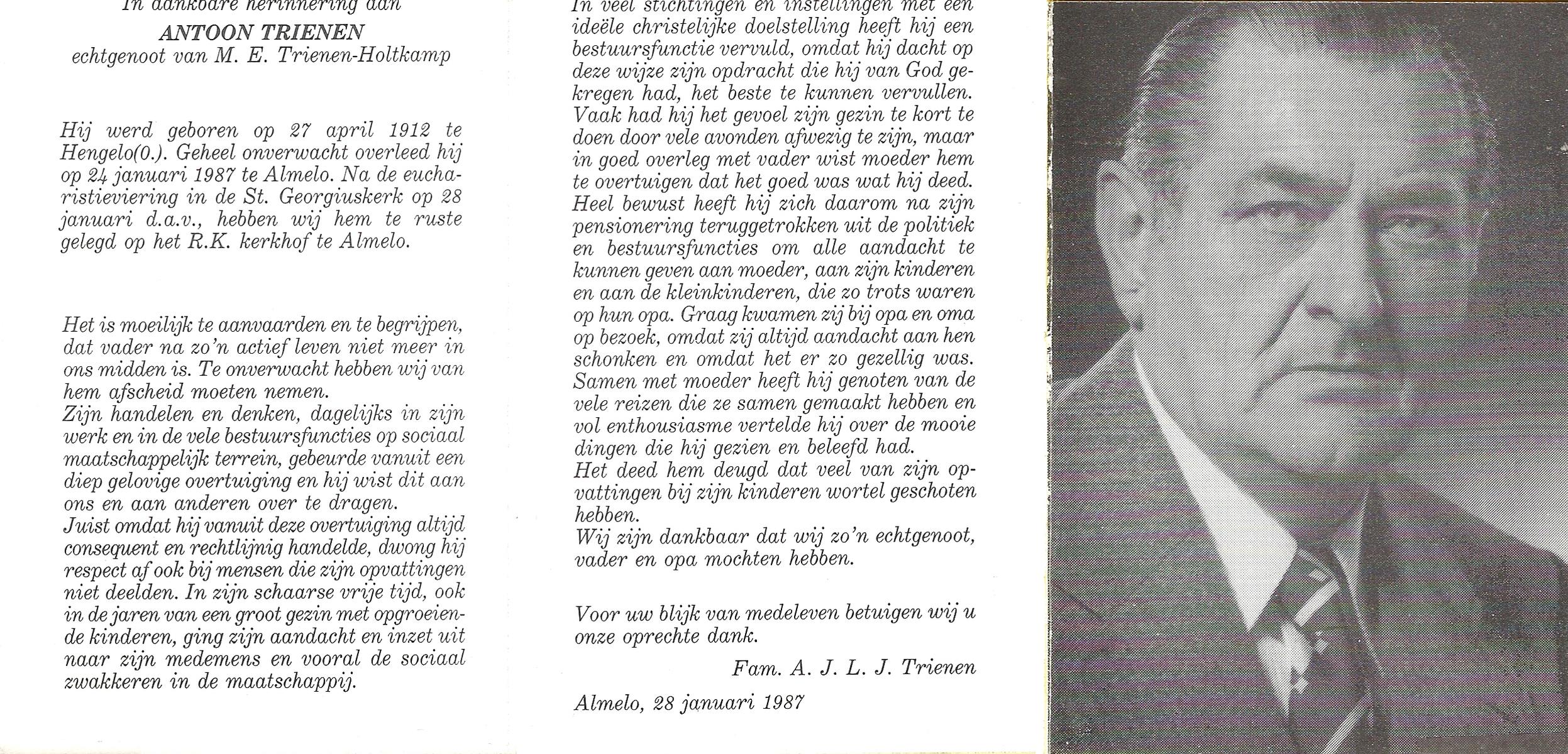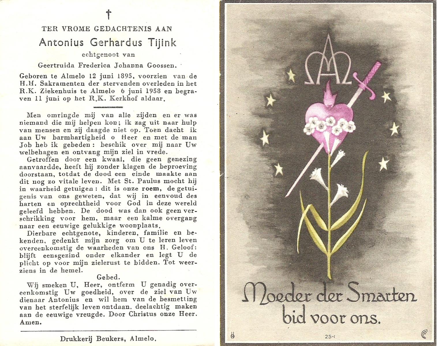 TIJINK, Antonius Gerhardus, geboren op 12-06-1895 te Almelo, overleden op 6-6-1958 te Almelo op 62-jarige leeftijd, begraven op 11-6-1958 te Almelo R.K.Kerkhof.