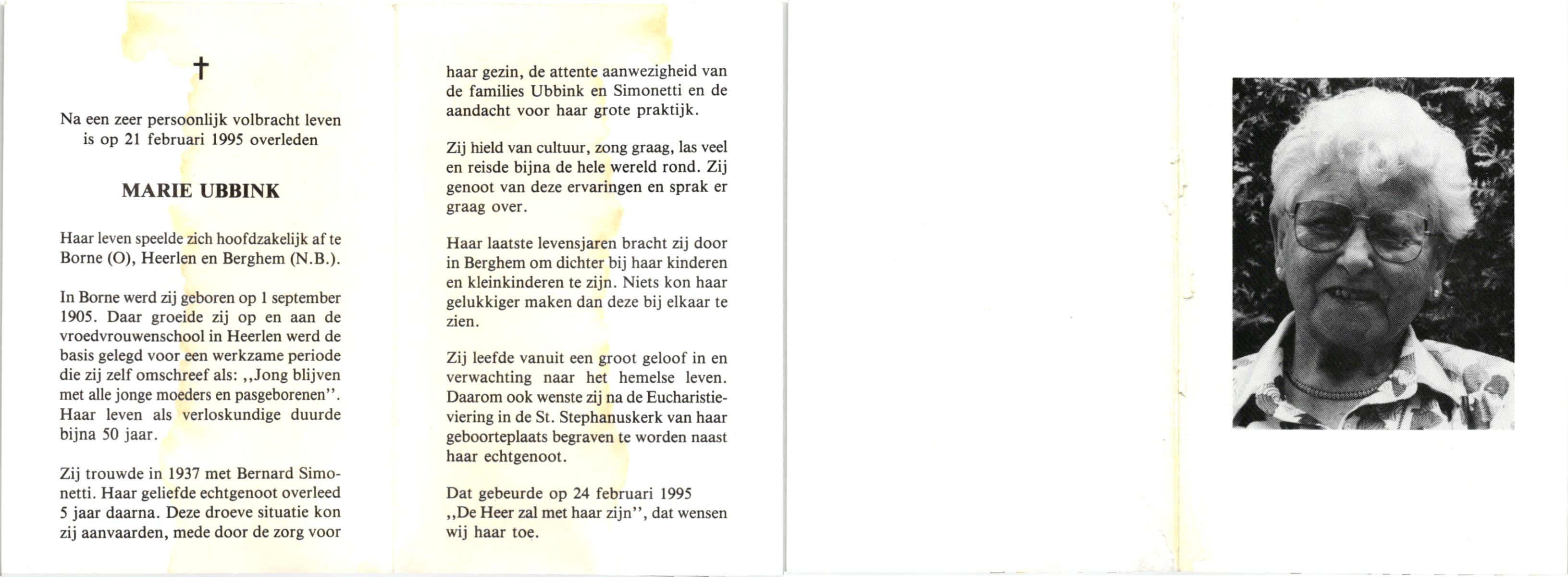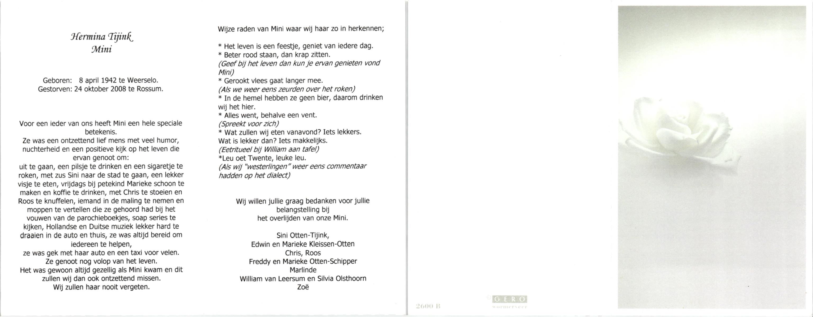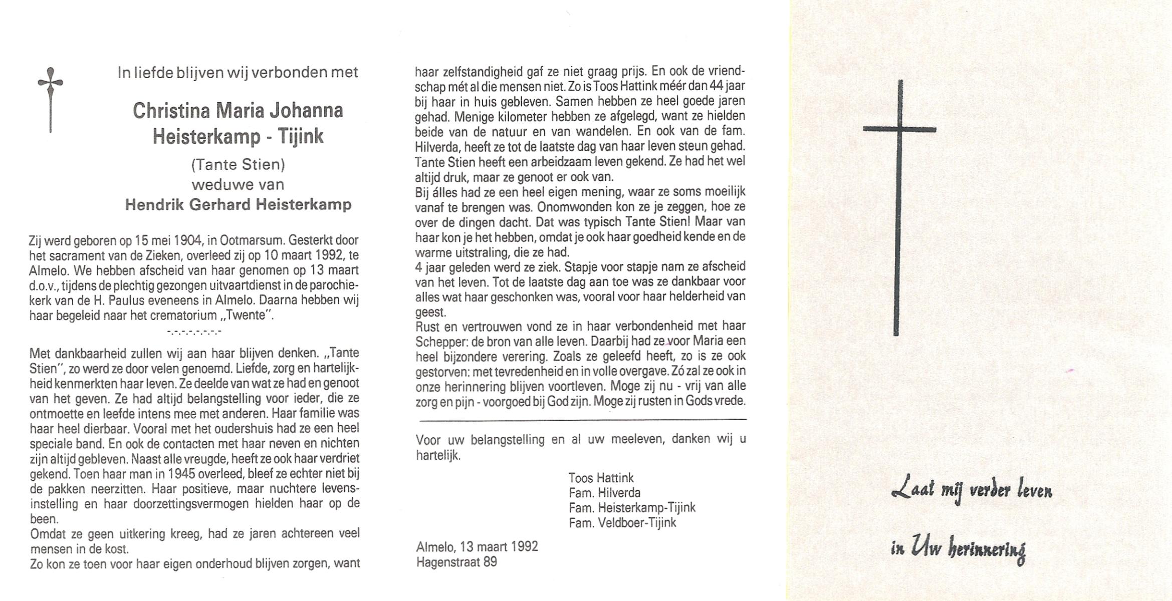 TIJINK, Christina Maria Johanna, geboren op 15-5-1904 te Ootmarsum, overleden op 10-3-1992 te Almelo op 87-jarige leeftijd, gecremeerd op 13-3-1992 te Almelo.