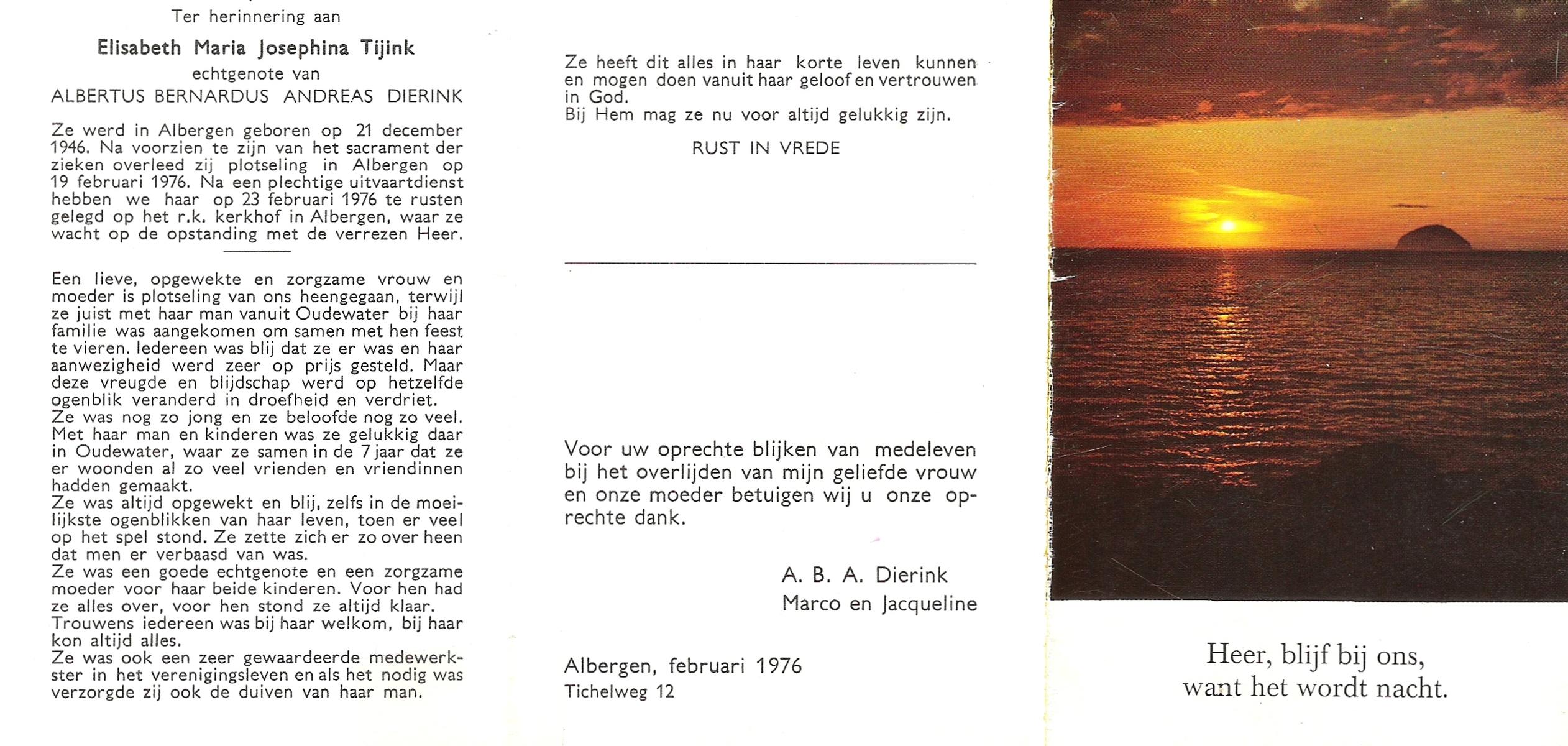 TIJINK, Elisabeth Maria Josephina, geboren op 21-12-1946 te Albergen, overleden op 19-2-1976 te Albergen op 29-jarige leeftijd, begraven op 23-2-1976 te Albergen.
