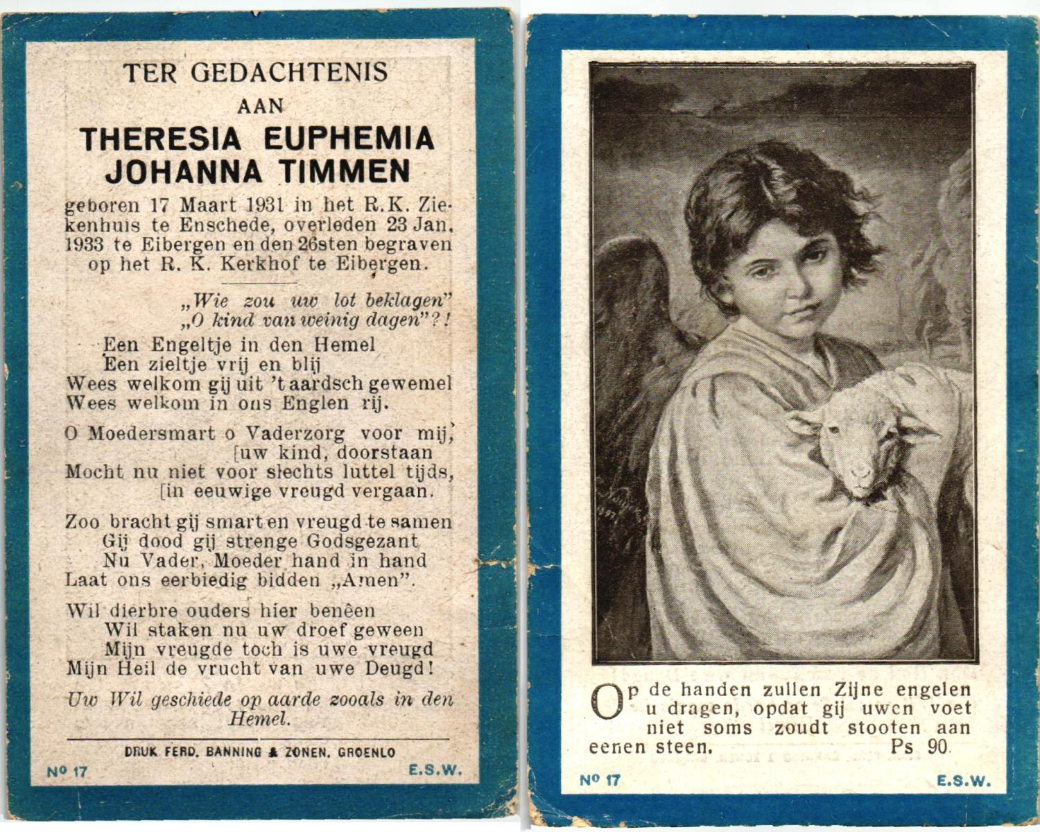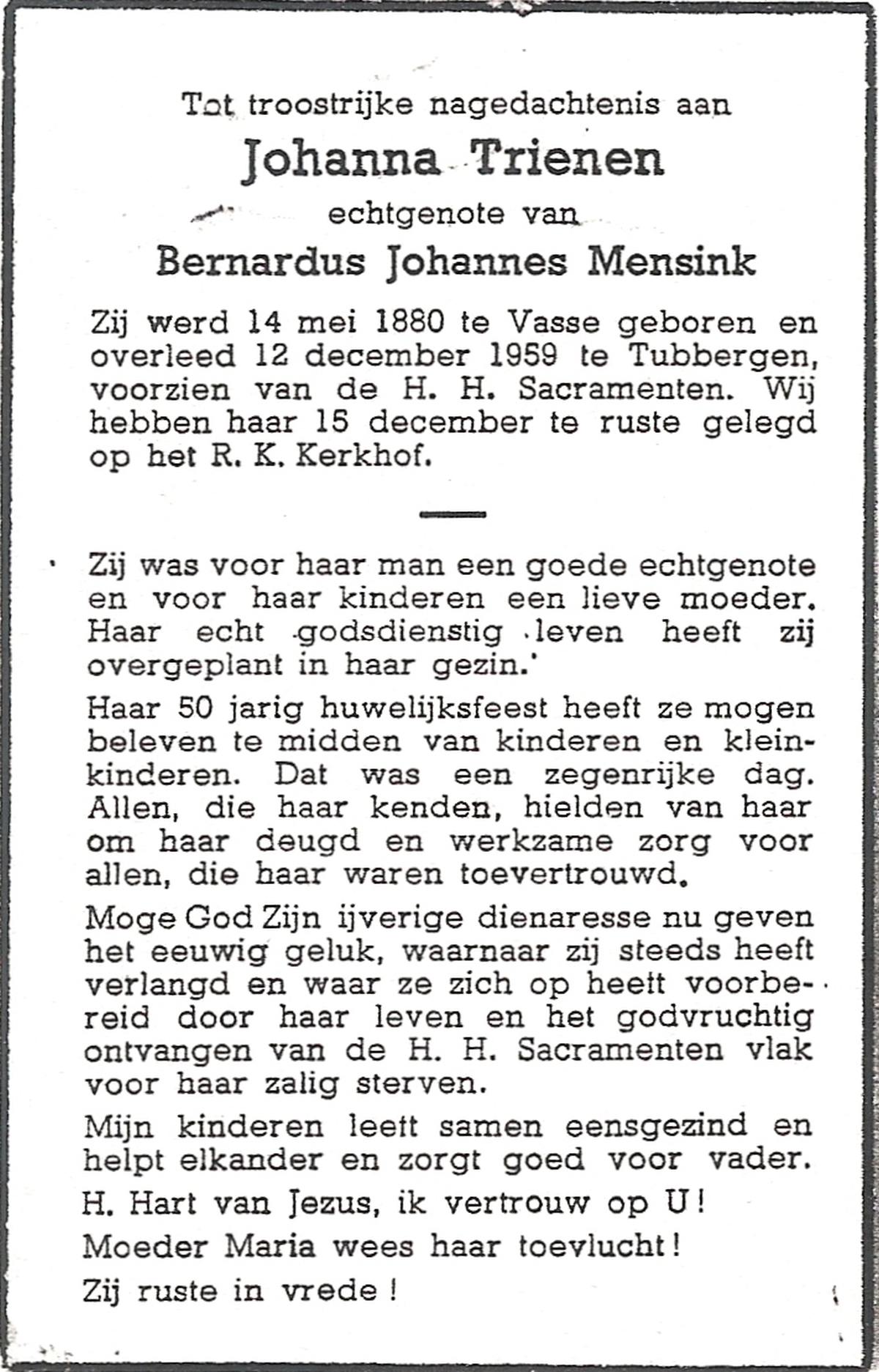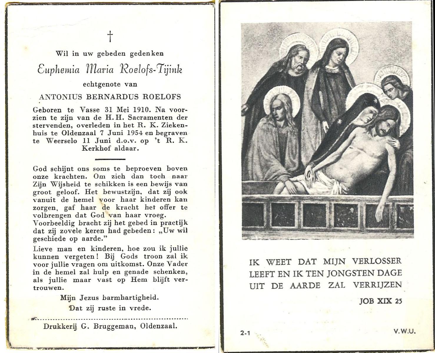 TIJINK, Euphemia Maria, geboren op 31-5-1910 te Vasse, overleden op 7-6-1954 te Oldenzaal op 44-jarige leeftijd, begraven op 11-6-1954 te Weerselo.