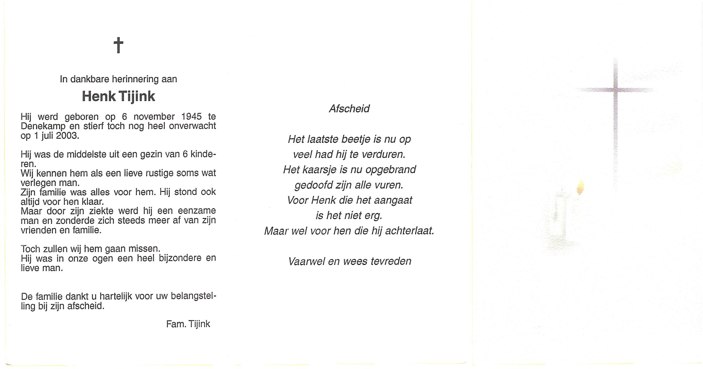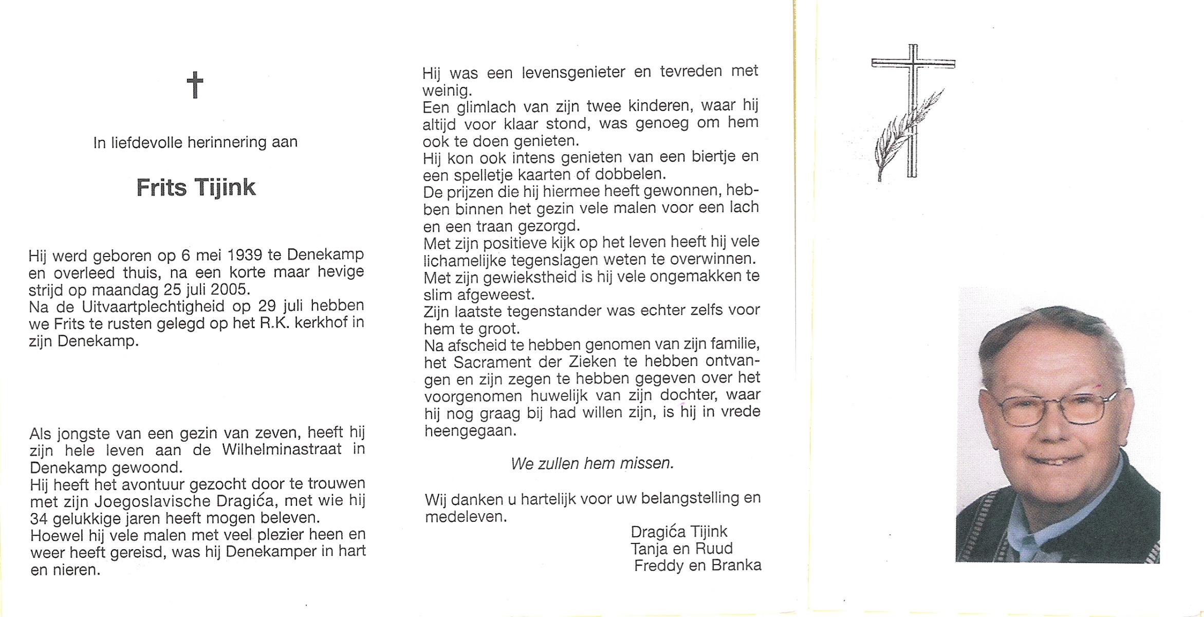 TIJINK, Frits, geboren op 6-5-1939 te Denekamp, overleden op 25-7-2005 te Denekamp op 66-jarige leeftijd, begraven op 29-7-2005 te Denekamp.
