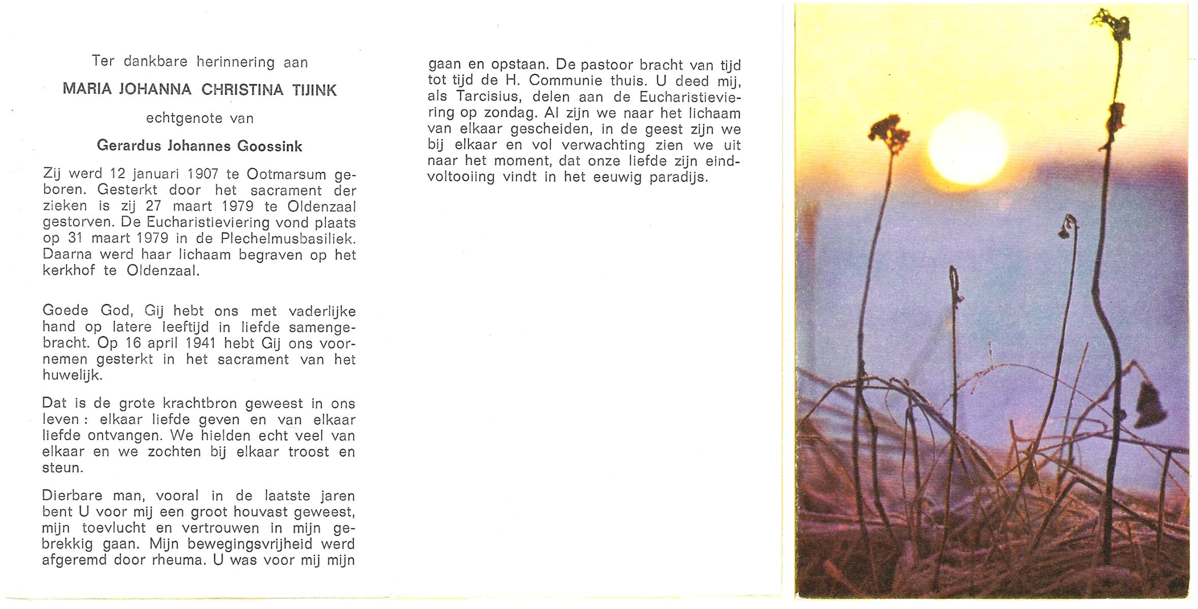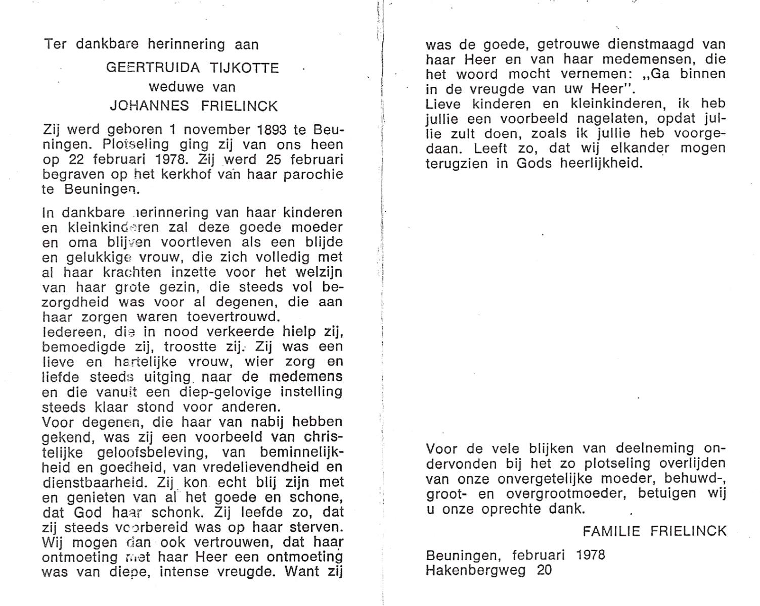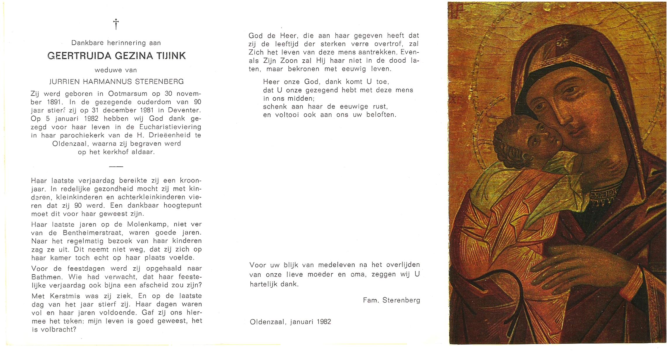 TIJINK, Geertruida Gezina, geboren op 30-11-1891 te Ootmarsum, overleden op 31-12-1981 te Deventer op 90-jarige leeftijd, begraven op 5-1-1982 te Oldenzaal.