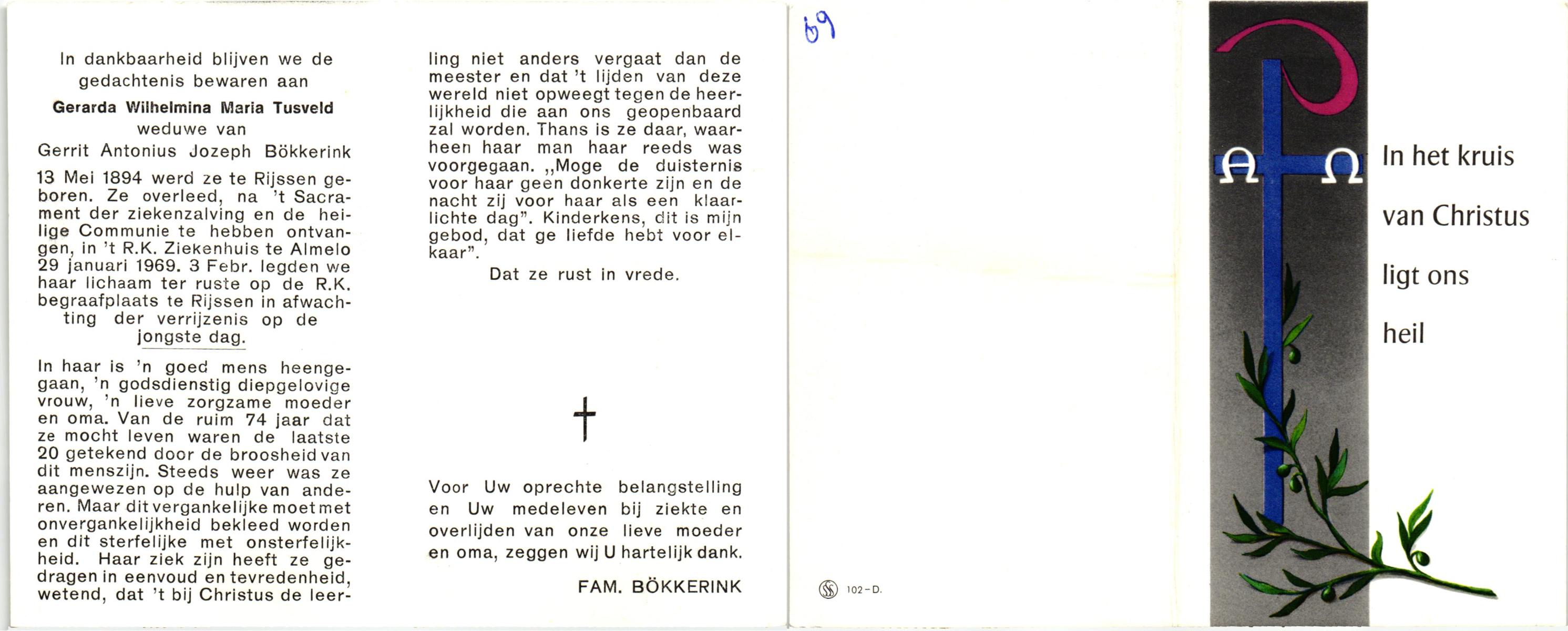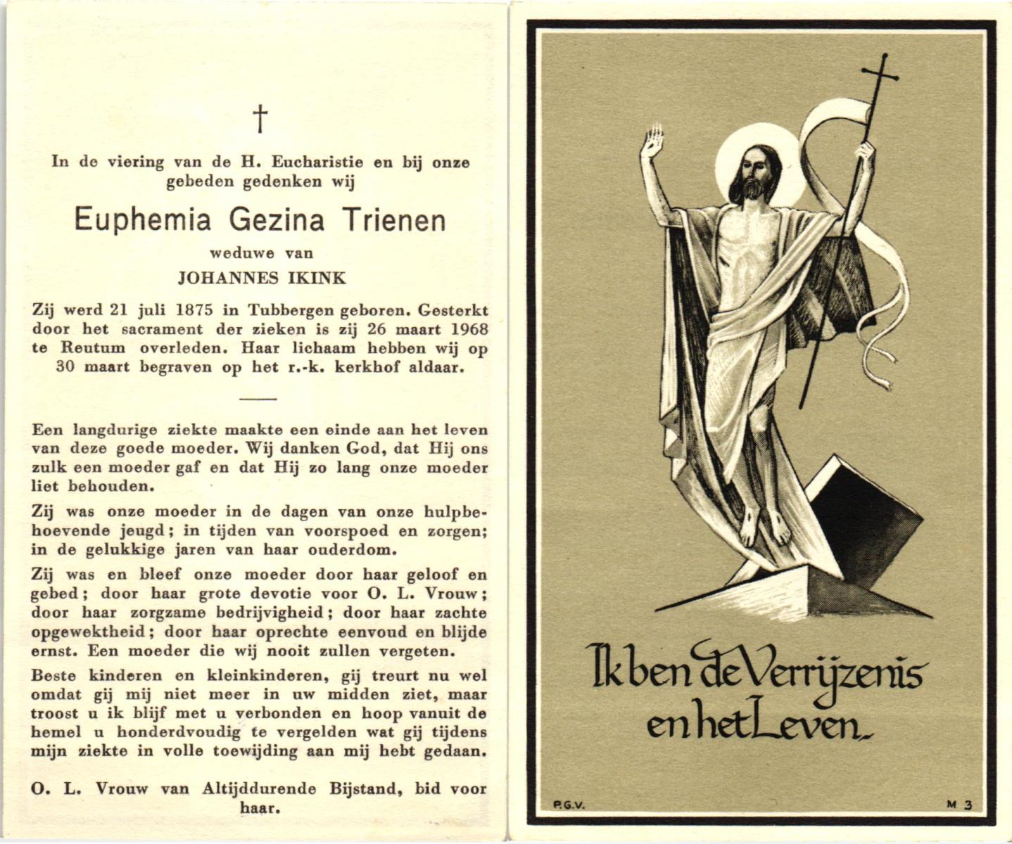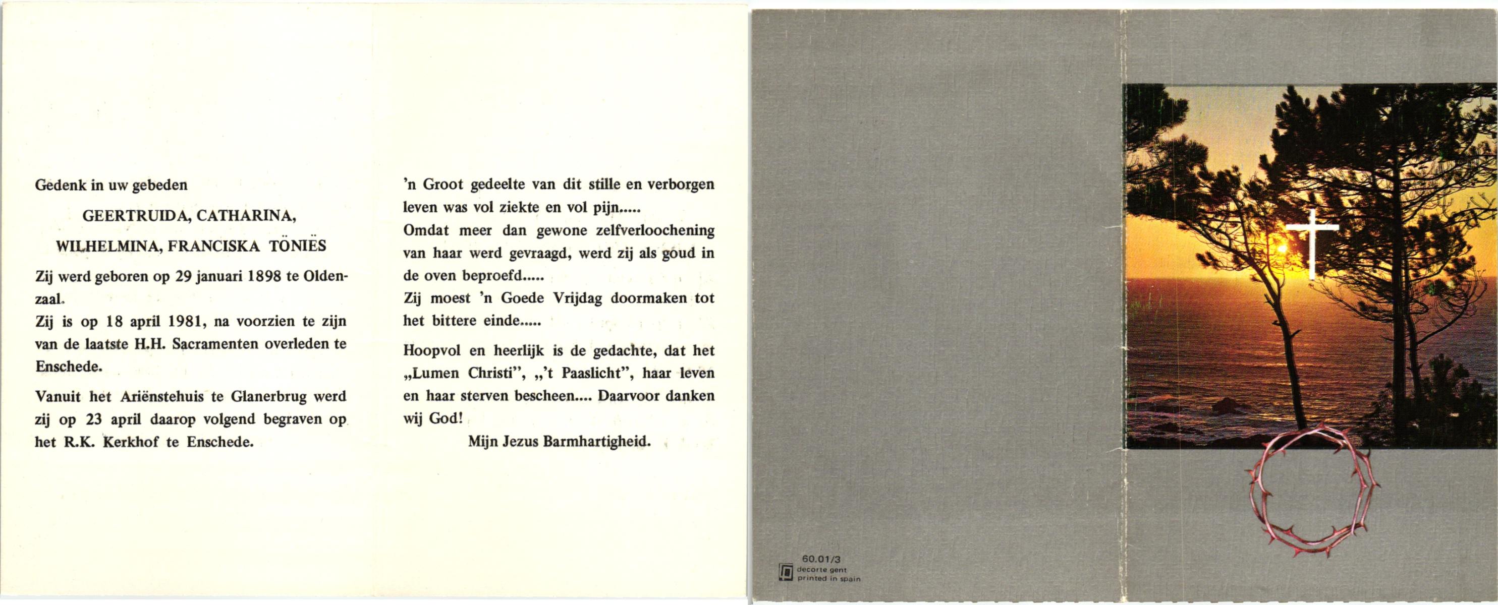 TIJINK, Geertruida Gezina, geboren op 30-11-1891 te Ootmarsum, overleden op 31-12-1981 te Deventer op 90-jarige leeftijd, begraven op 5-1-1982 te Oldenzaal.