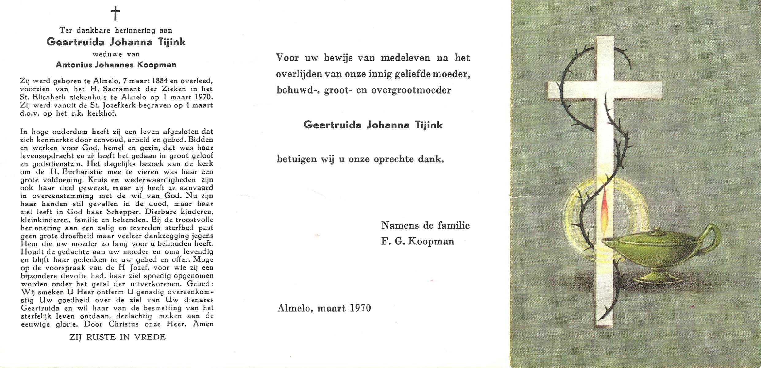 TIJINK, Geertruida Johanna, geboren op 07-03-1884 te Almelo, overleden op 1-3-1970 te Almelo op 85-jarige leeftijd, begraven op 4-3-1970 te Almelo.