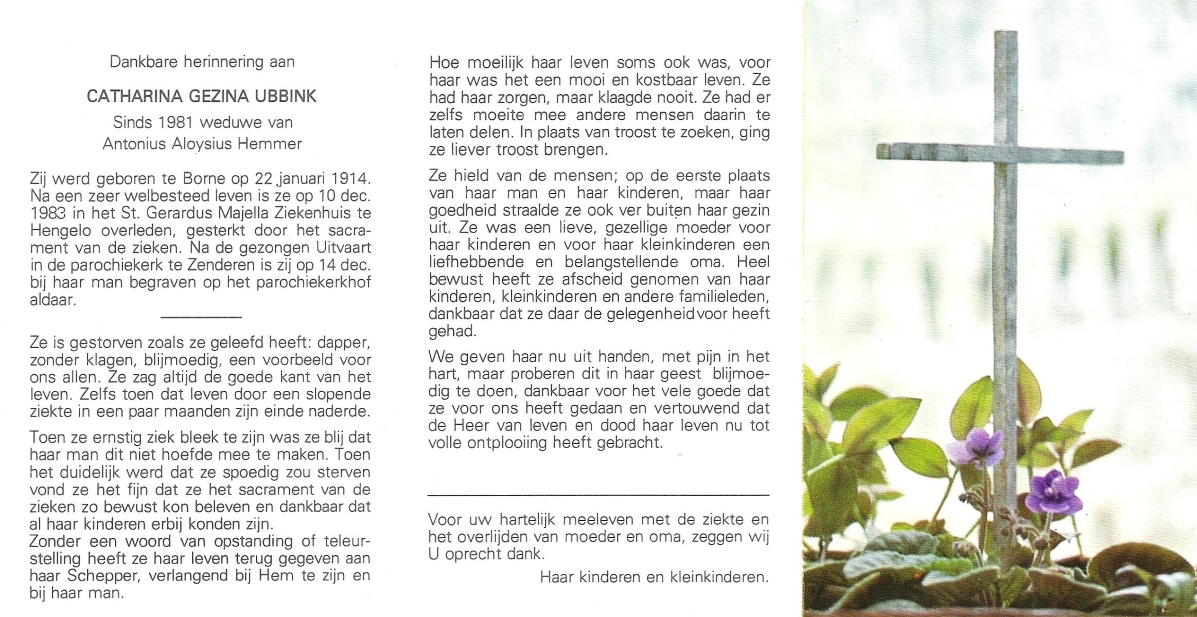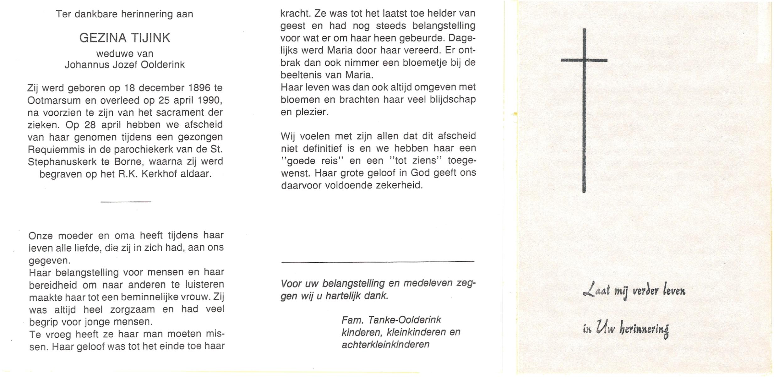 TIJINK, Gezina, geboren op 18-12-1896 te Ootmarsum, overleden op 25-4-1990 op 93-jarige leeftijd, begraven op 28-4-1990 te Borne.