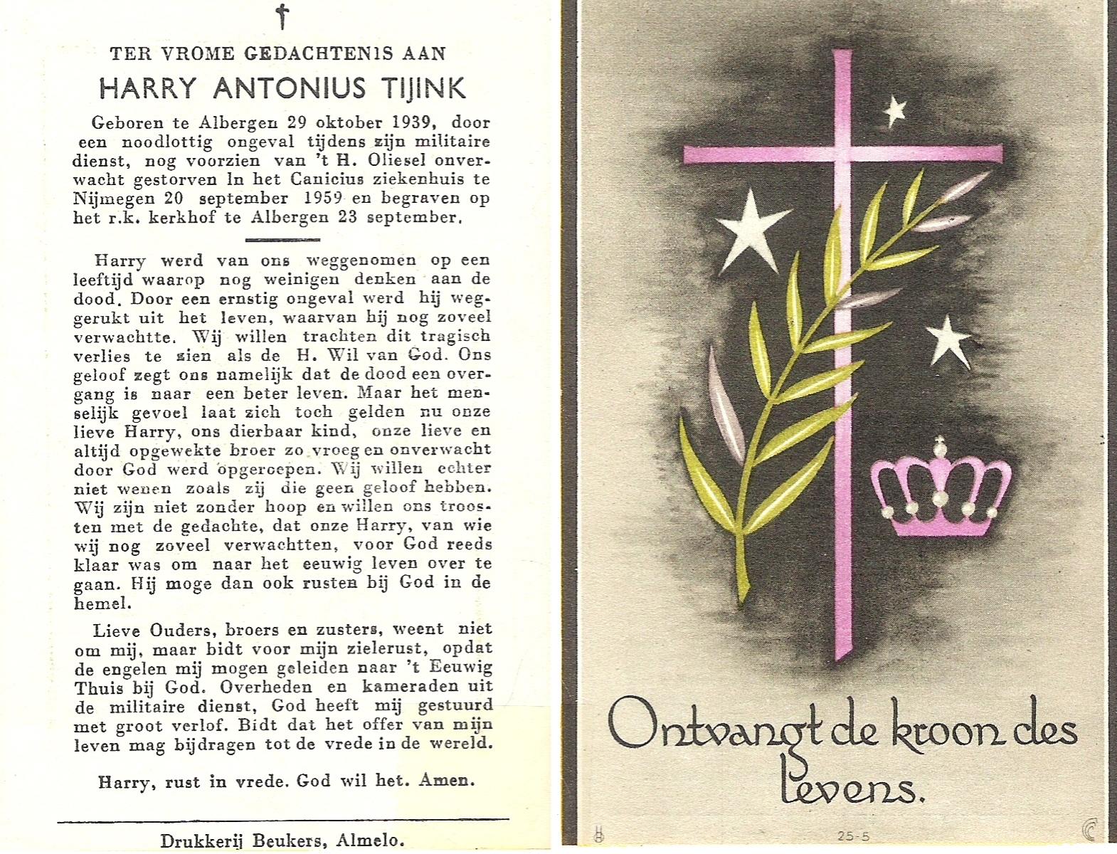 TIJINK, Harry Antonius, geboren op 29-10-1939 te Albergen, overleden op 20-9-1959 te Nijmegen op 19-jarige leeftijd, begraven op 23-9-1959 te Albergen.