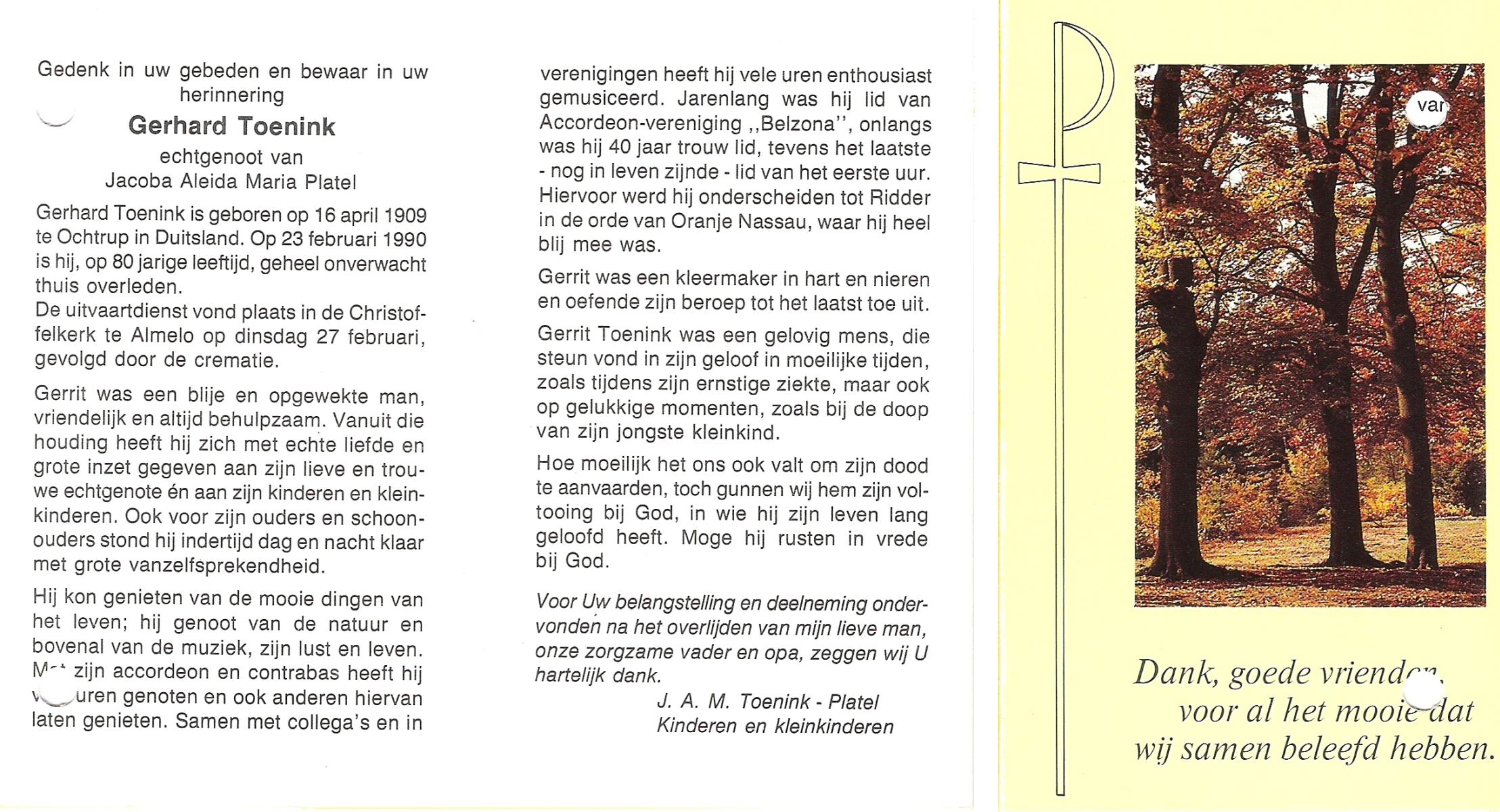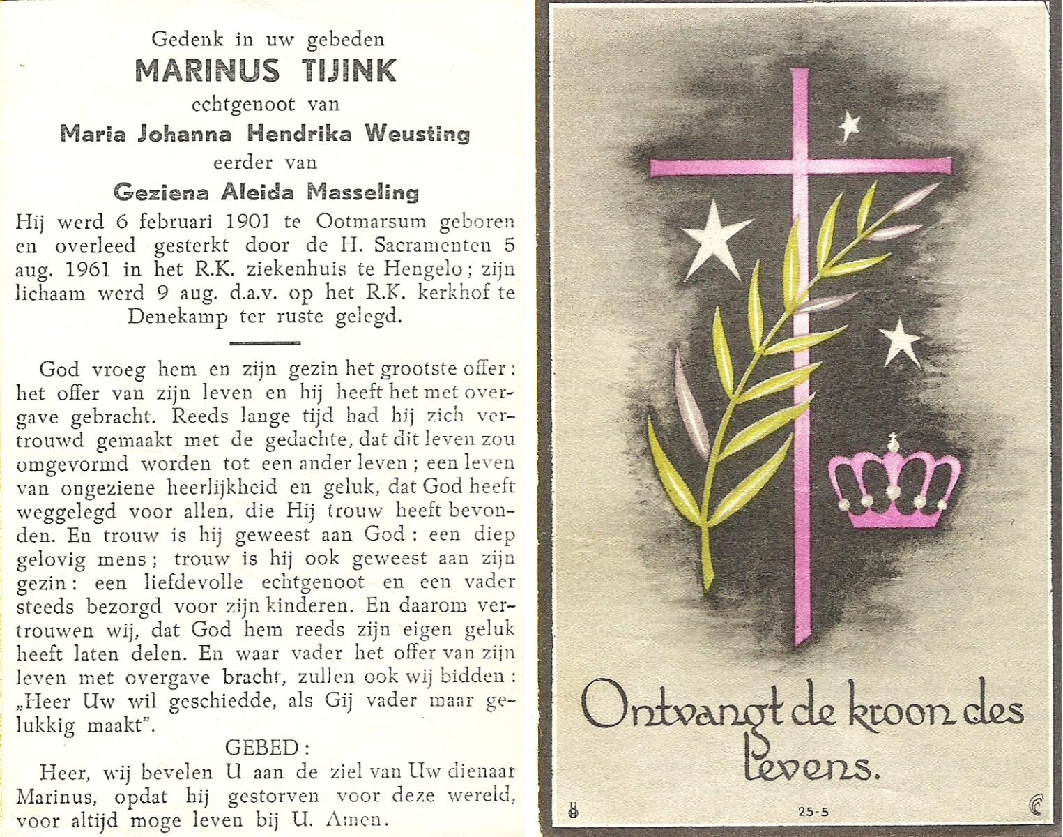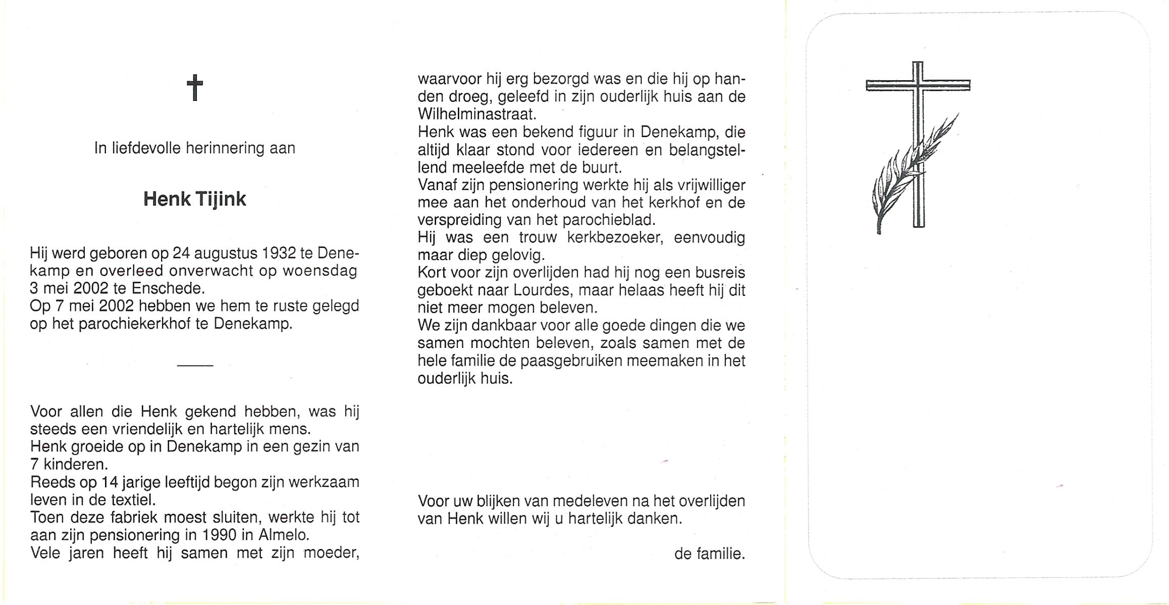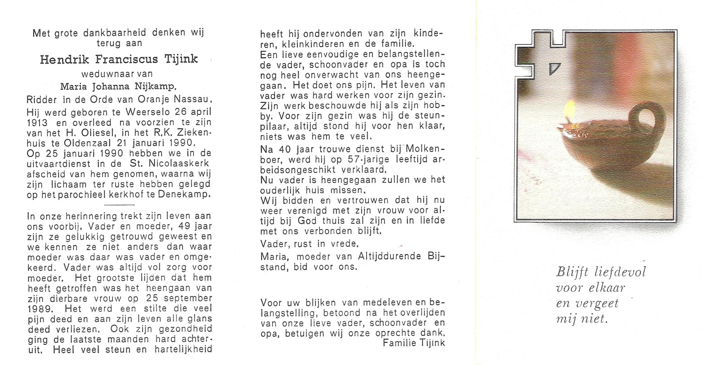 TIJINK, Hendrik Franciscus, geboren op 26-4-1913 te Weerselo, overleden op 21-1-1990 te Oldenzaal op 76-jarige leeftijd, begraven op 25-1-1990 te Denekamp R.K.kerkhof.