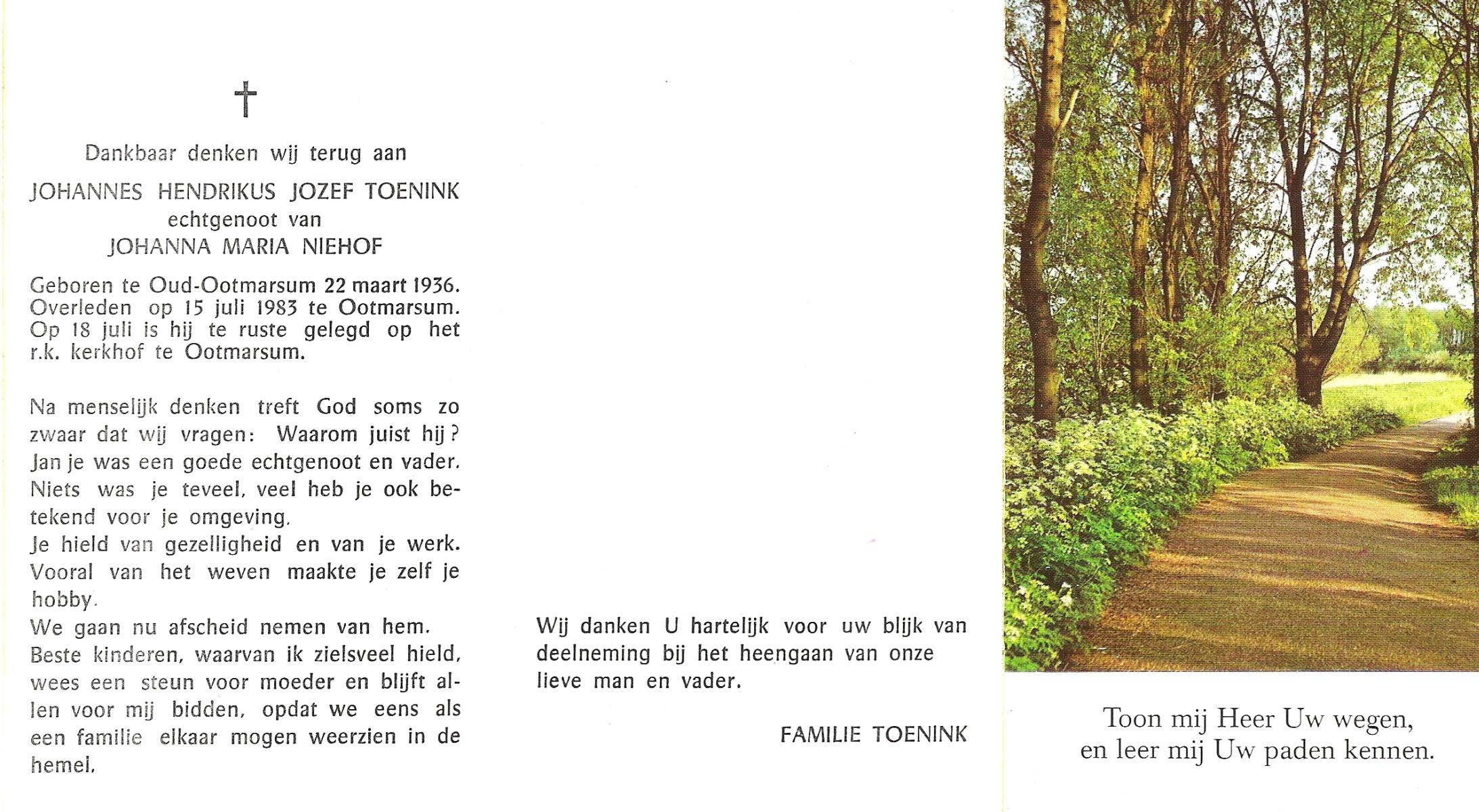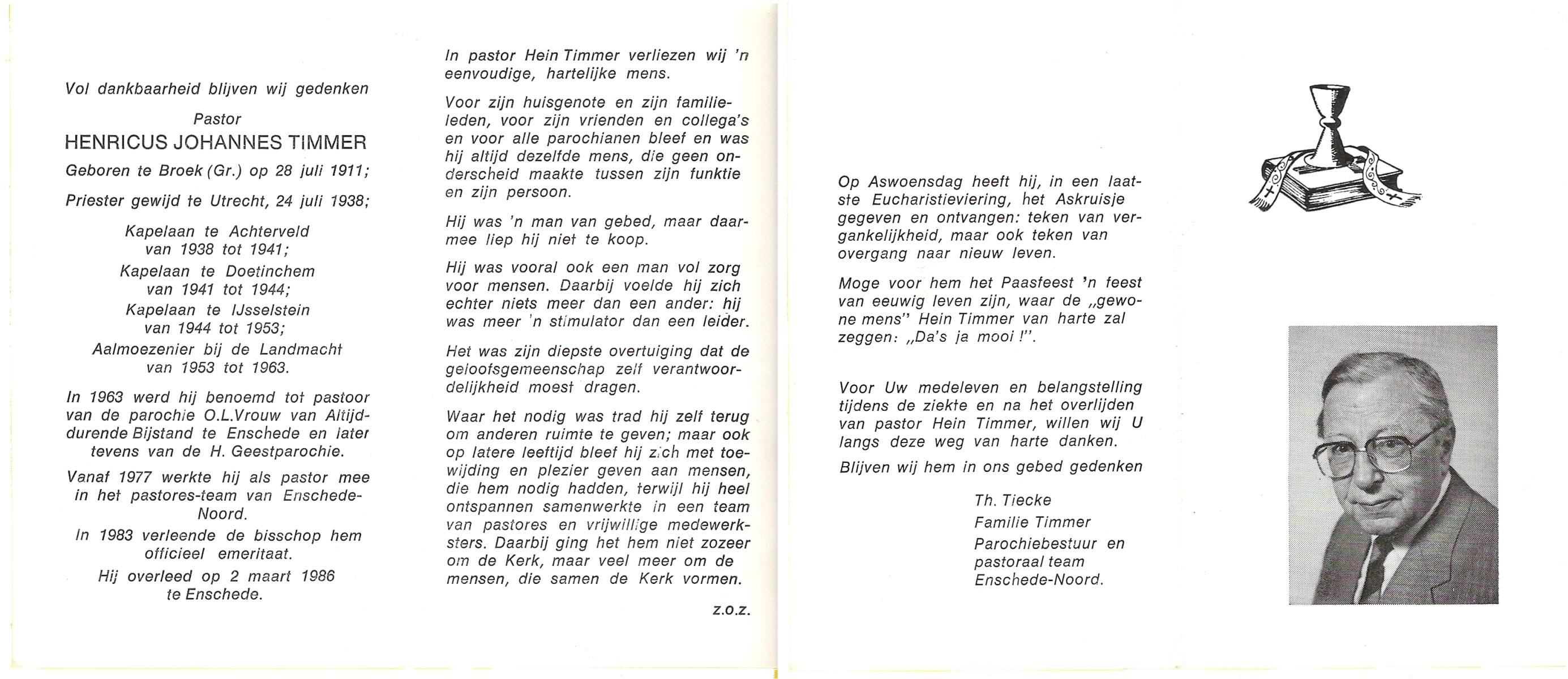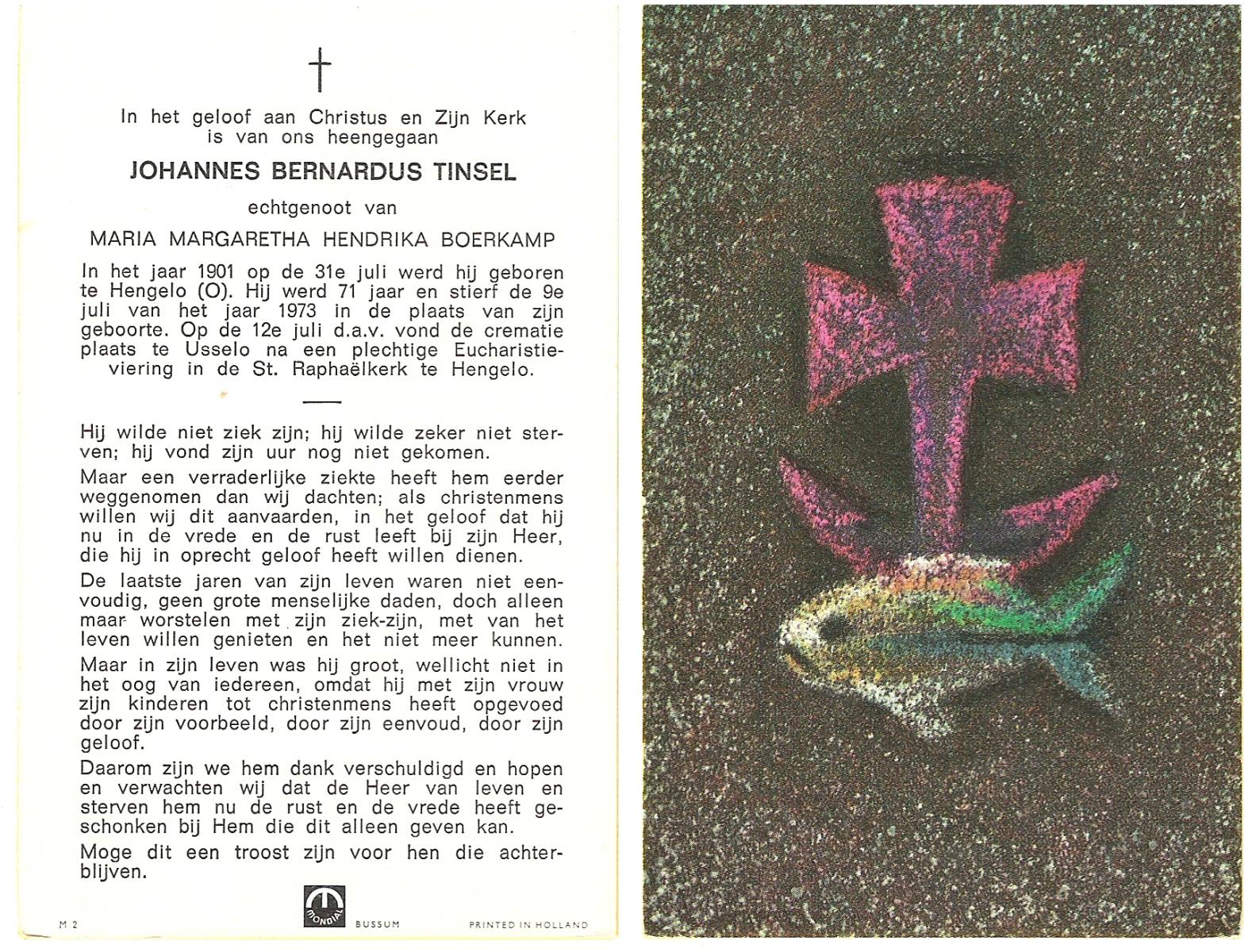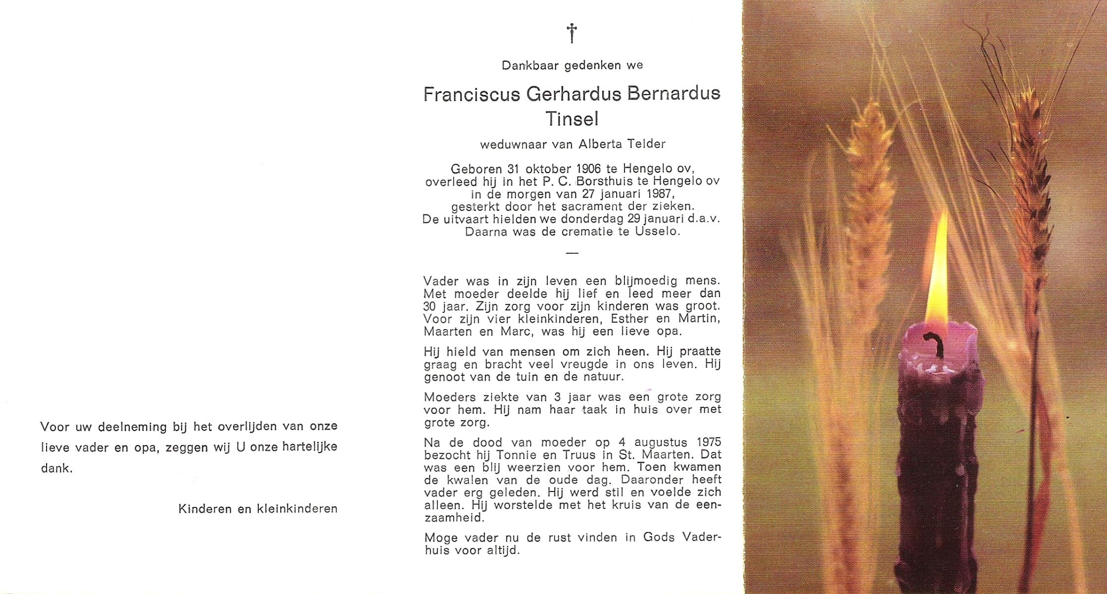 TIJINK, Hendrik Franciscus, geboren op 26-4-1913 te Weerselo, overleden op 21-1-1990 te Oldenzaal op 76-jarige leeftijd, begraven op 25-1-1990 te Denekamp R.K.kerkhof.