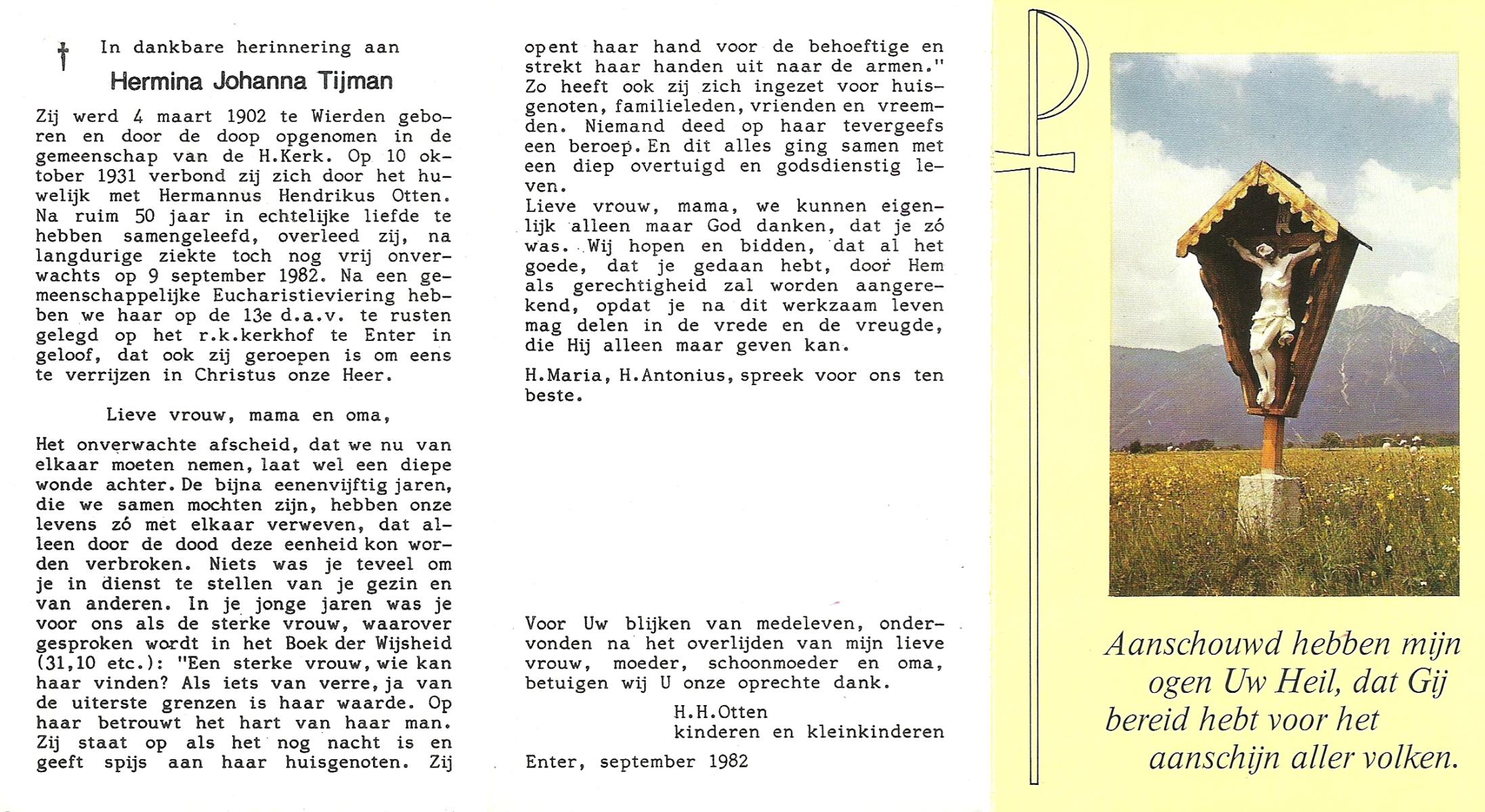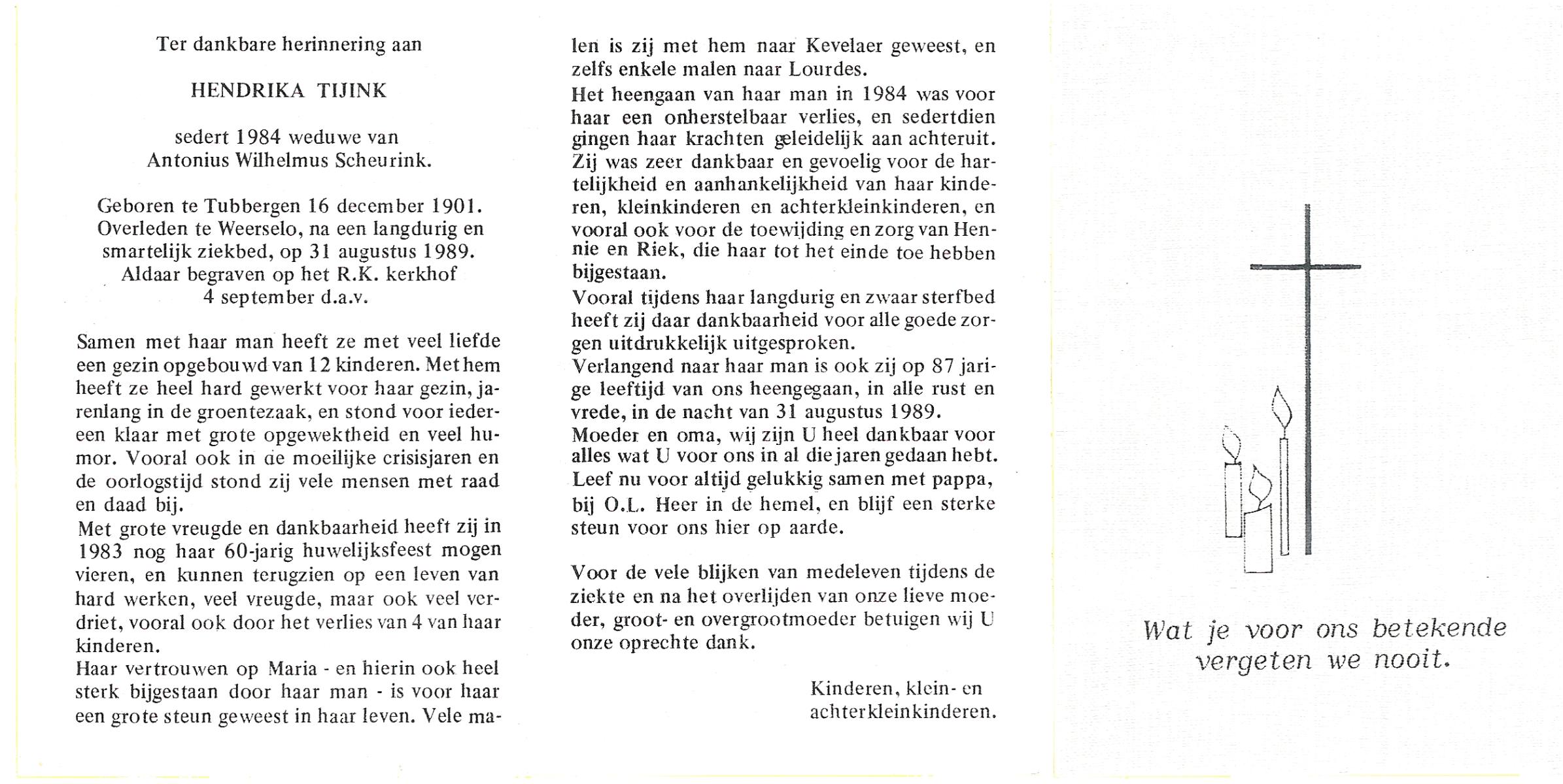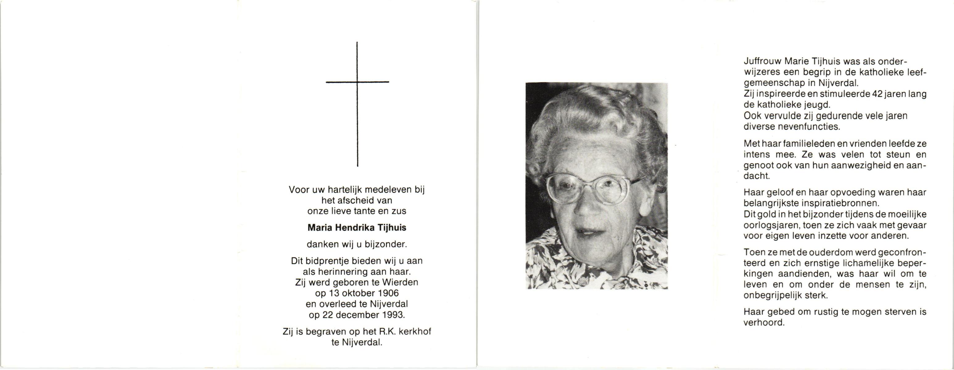 TIJHUIS, Maria Hendrika, geboren op 13-10-1906 te Wierden, overleden op 22-12-1993 te Hellendoorn, Nijverdal op 87-jarige leeftijd, begraven te Hellendoorn, Nijverdal.