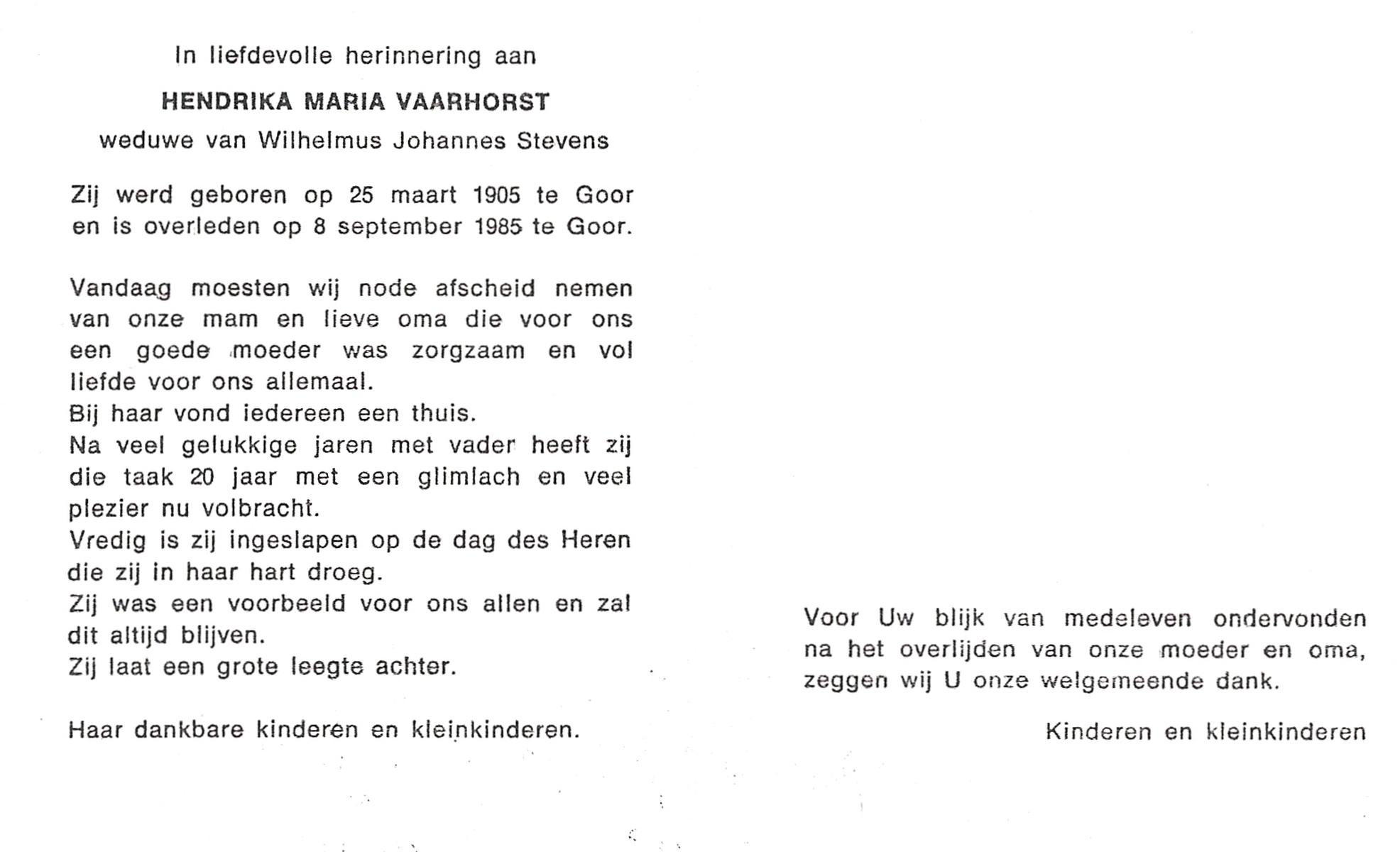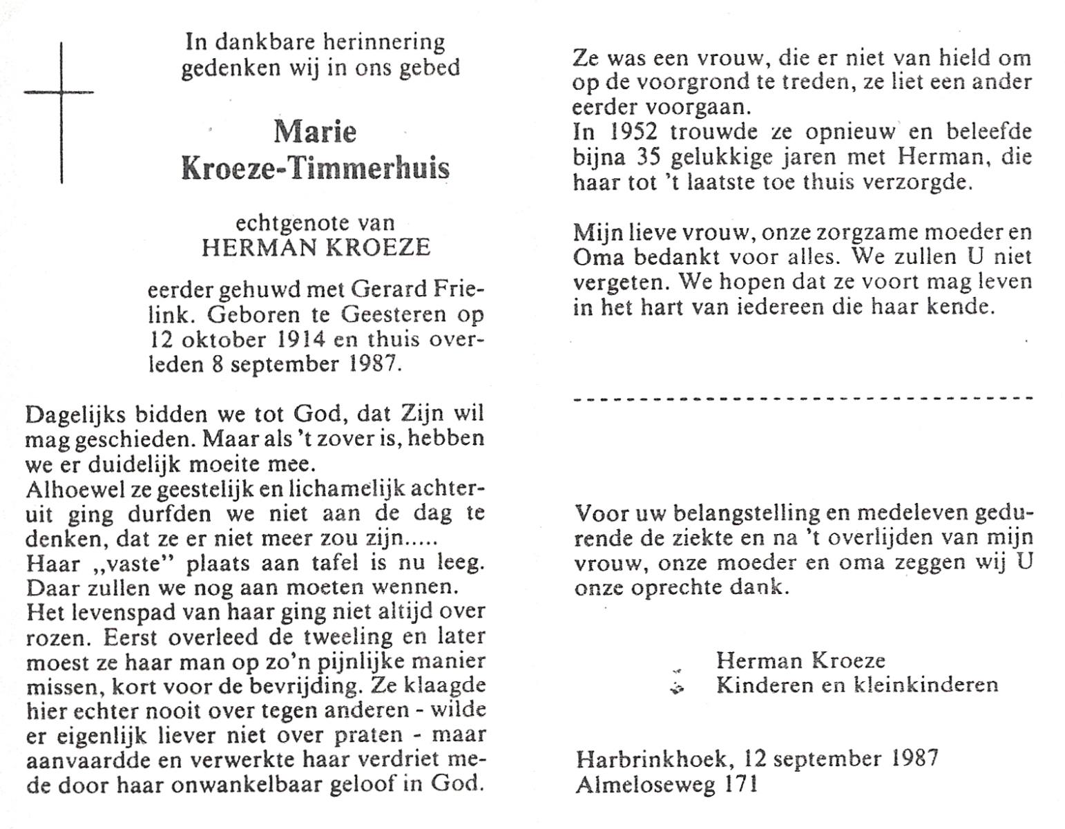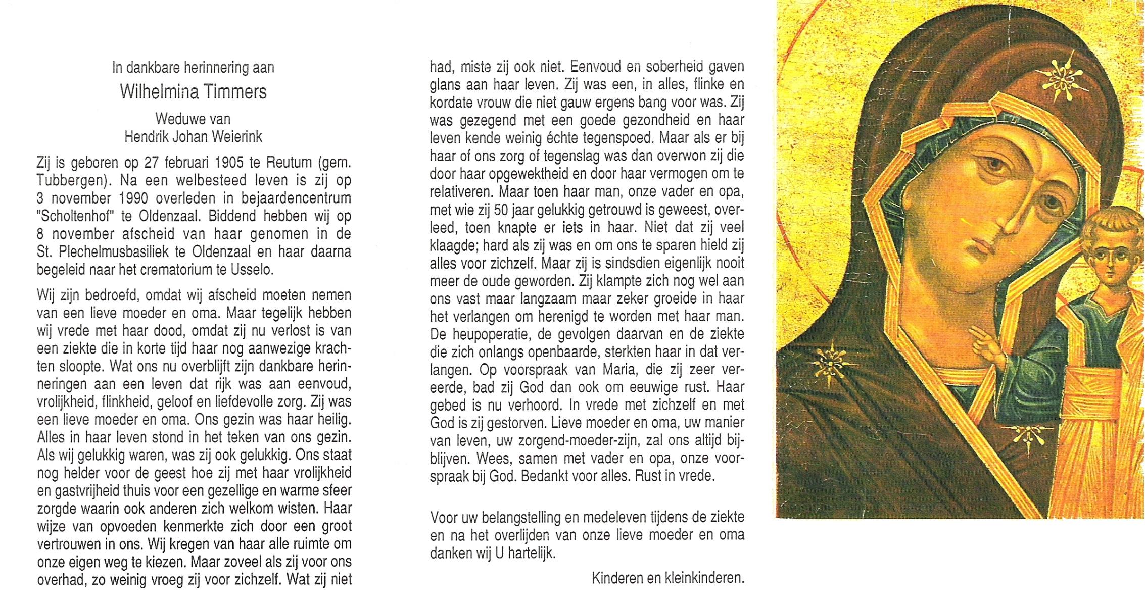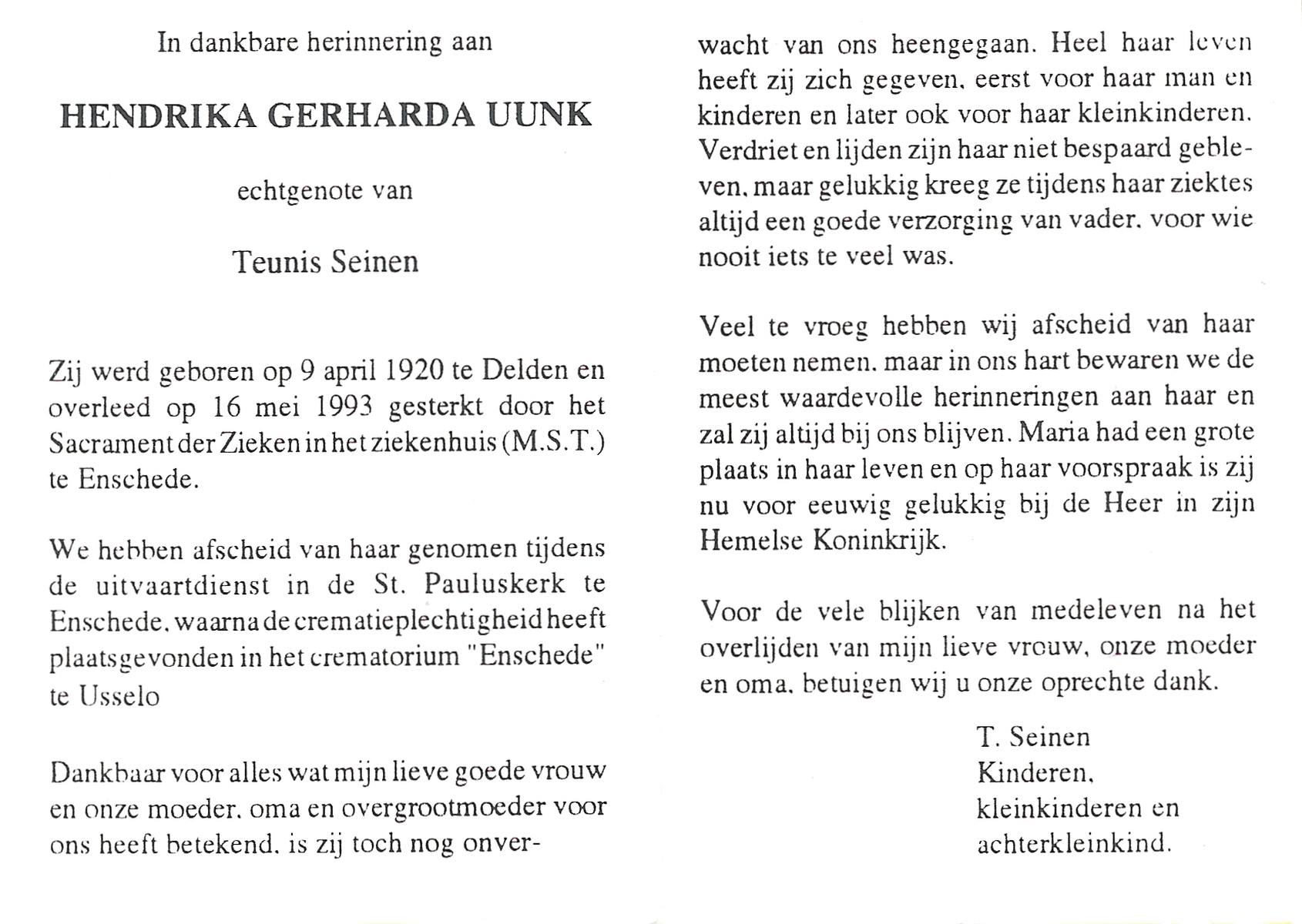 TIJHUIS, Maria Hendrika, geboren op 13-10-1906 te Wierden, overleden op 22-12-1993 te Hellendoorn, Nijverdal op 87-jarige leeftijd, begraven te Hellendoorn, Nijverdal.