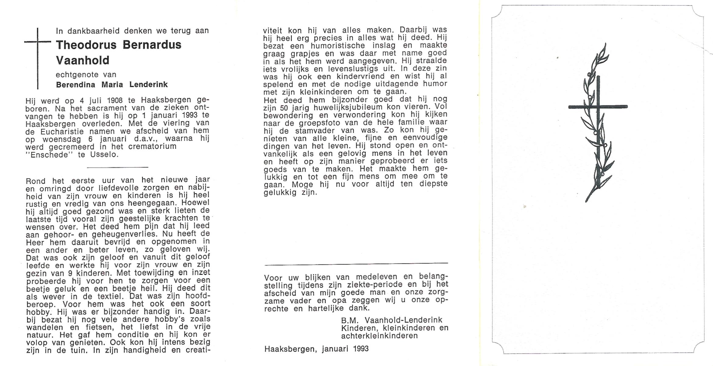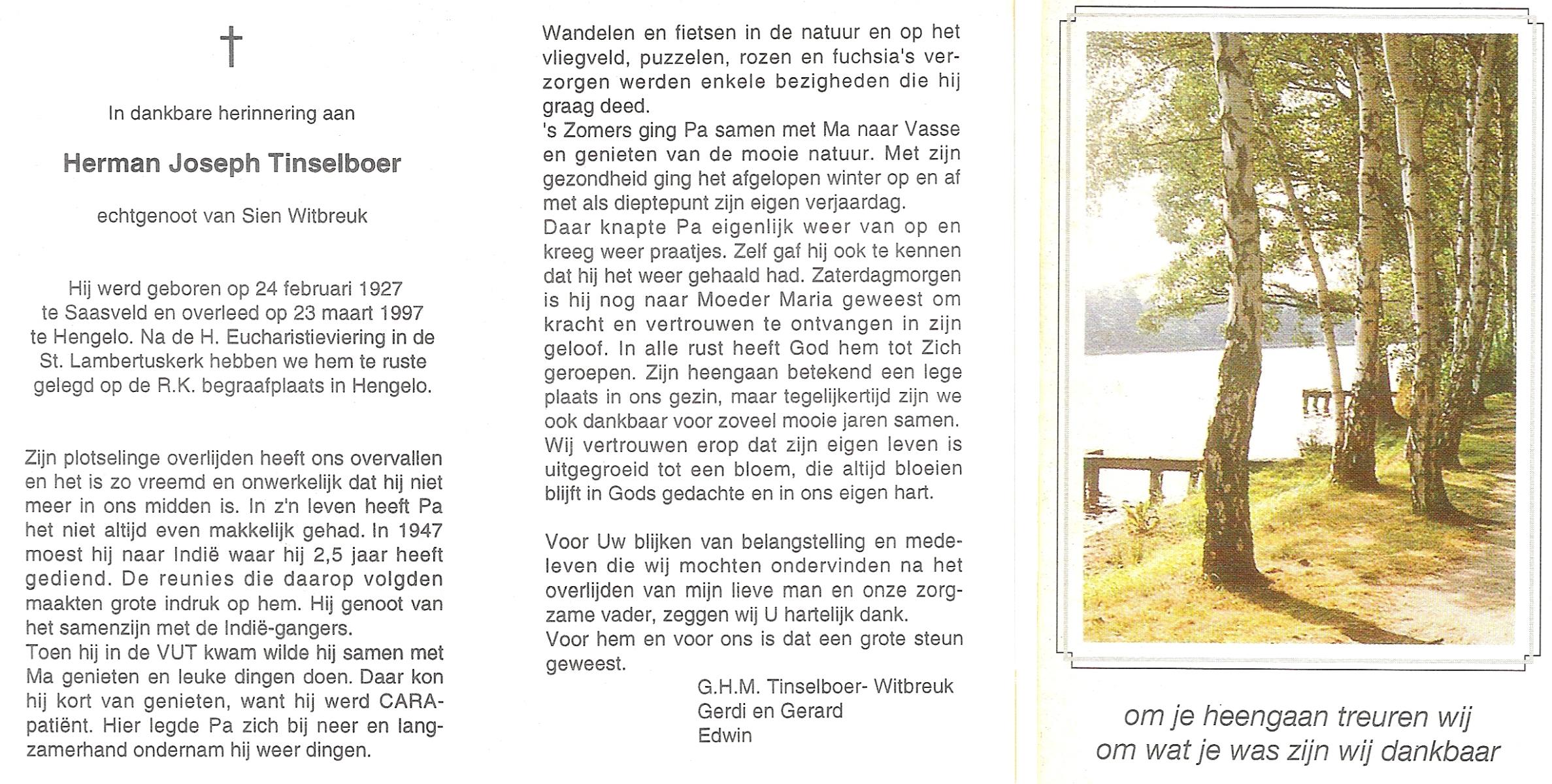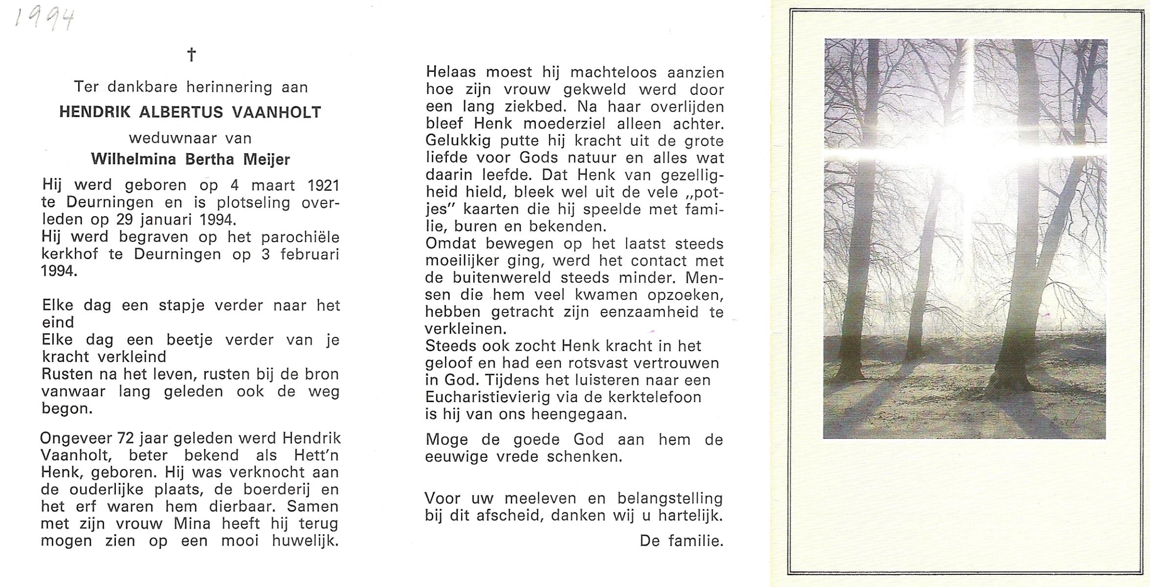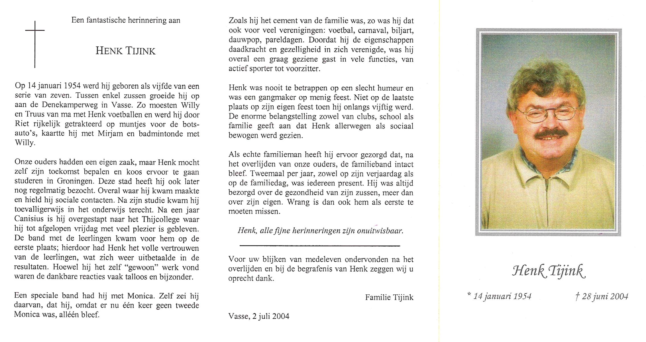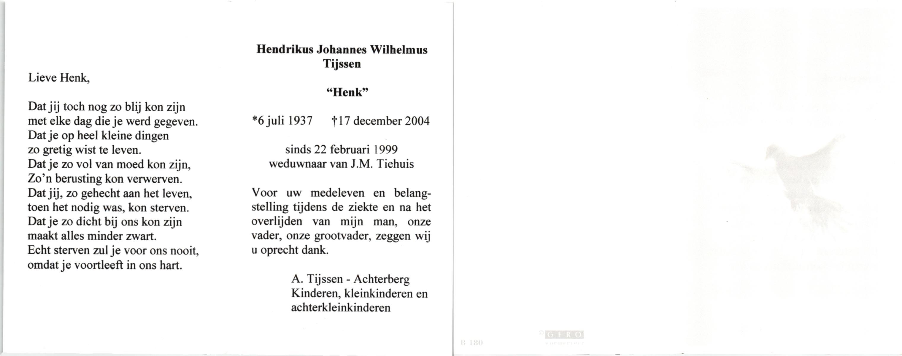 TIJHUIS, Hendrik (Hendrikus Jozef), geboren op 6-2-1933 te Saasveld, overleden op 4-2-1994 te Saasveld op 60-jarige leeftijd, begraven op 8-2-1994 te Saasveld.