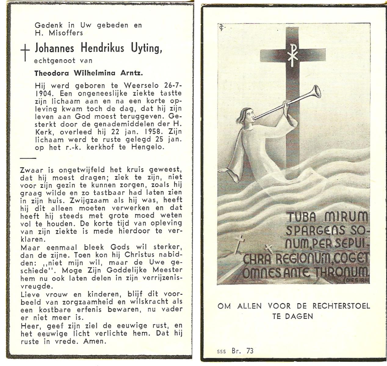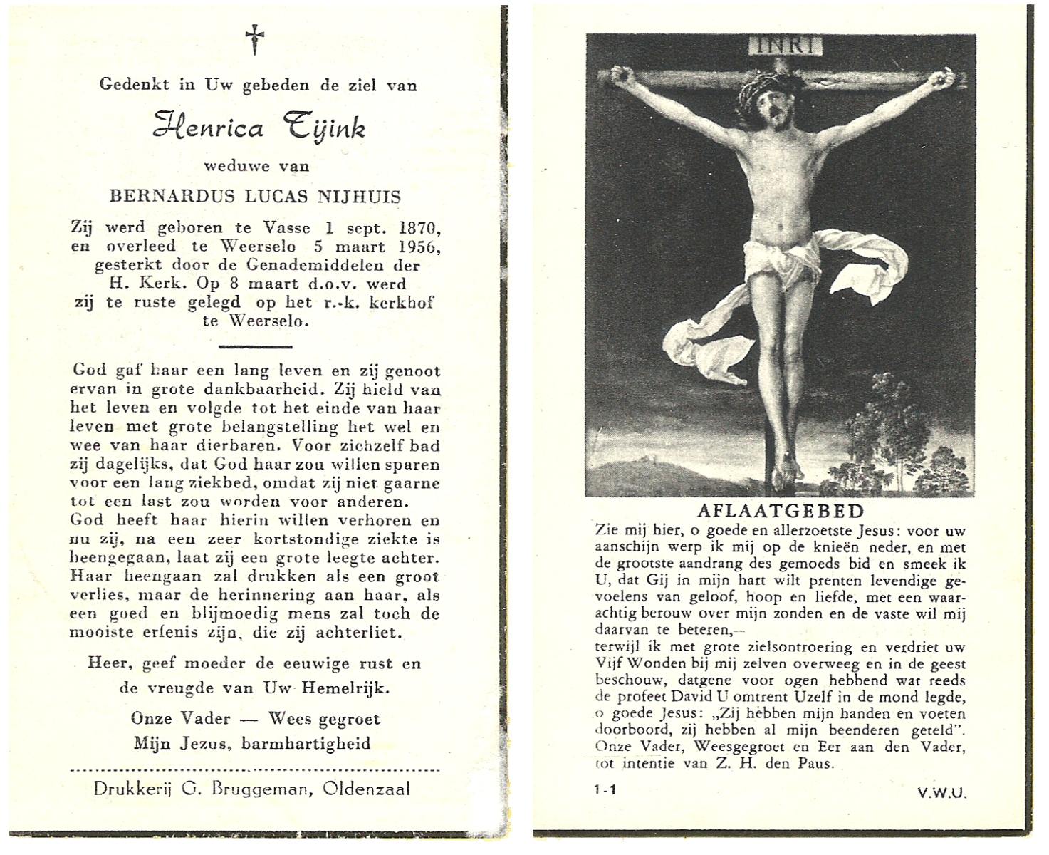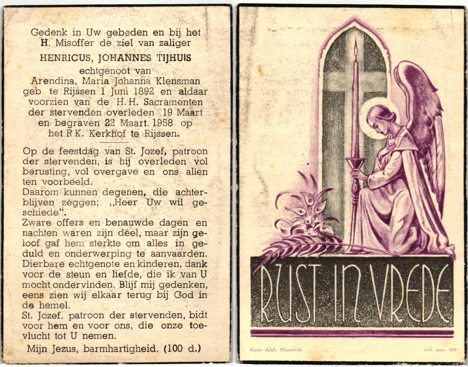 TIJHUIS, Henricus Johannes, geboren op 01-06-1892 te Rijssen, overleden op 19-3-1958 te Rijssen op 65-jarige leeftijd, begraven op 22-3-1958 te Rijssen.