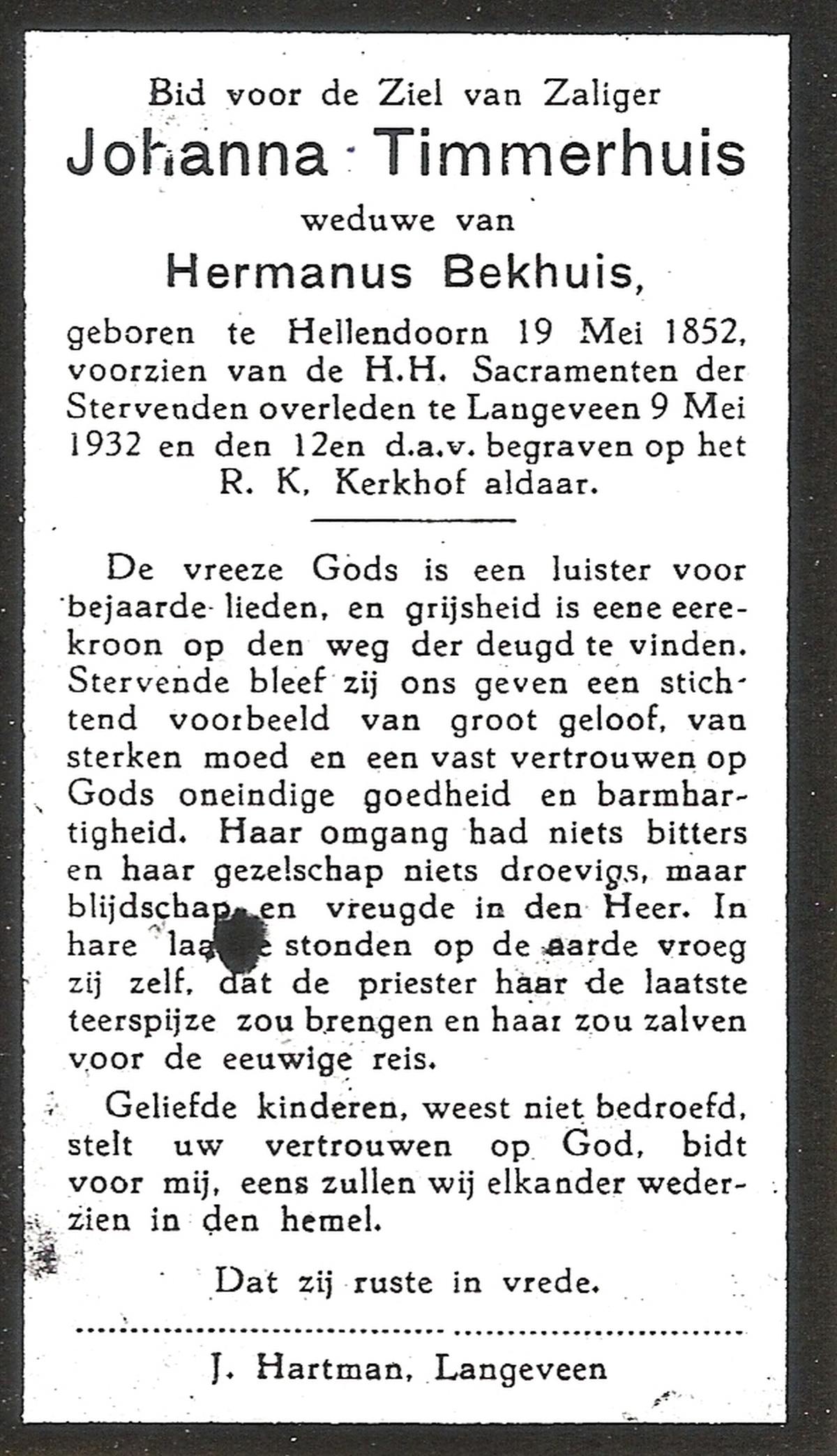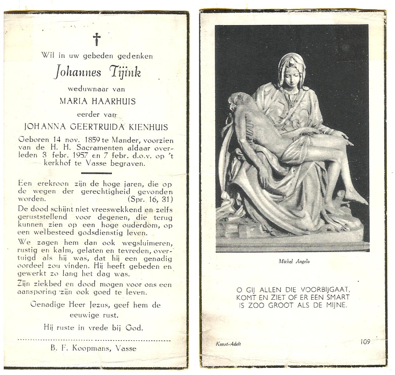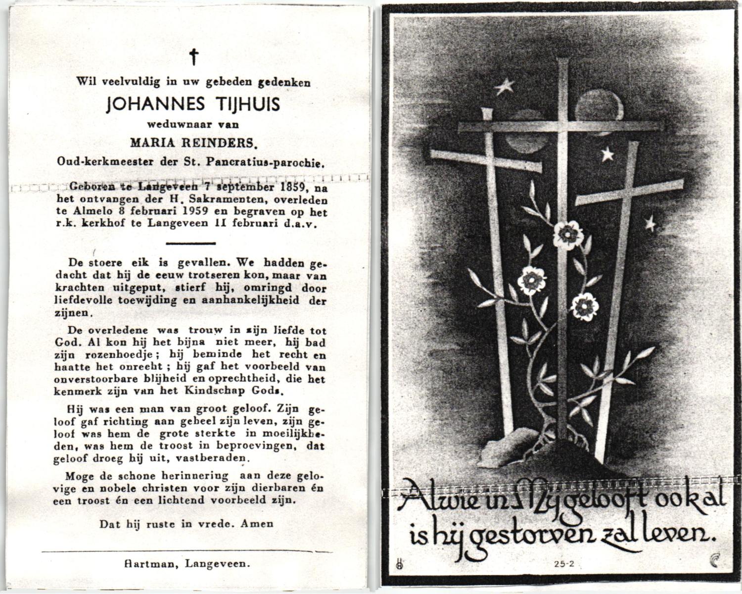 TIJHUIS, Johannes, geboren op 07-09-1859 te Langeveen, overleden op 8-2-1959 te Almelo op 99-jarige leeftijd, begraven op 11-2-1959 te Langeveen.