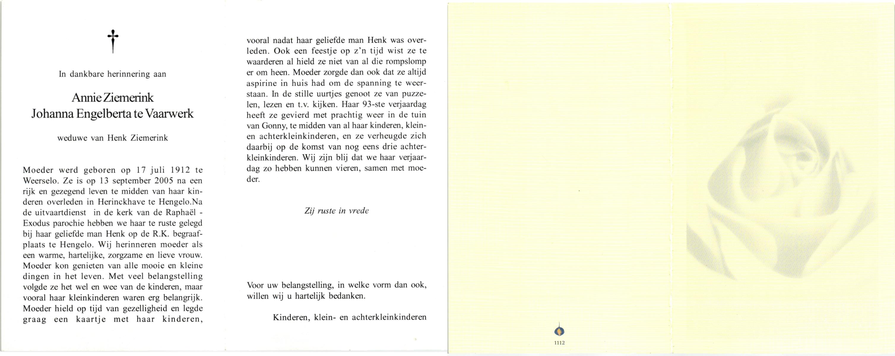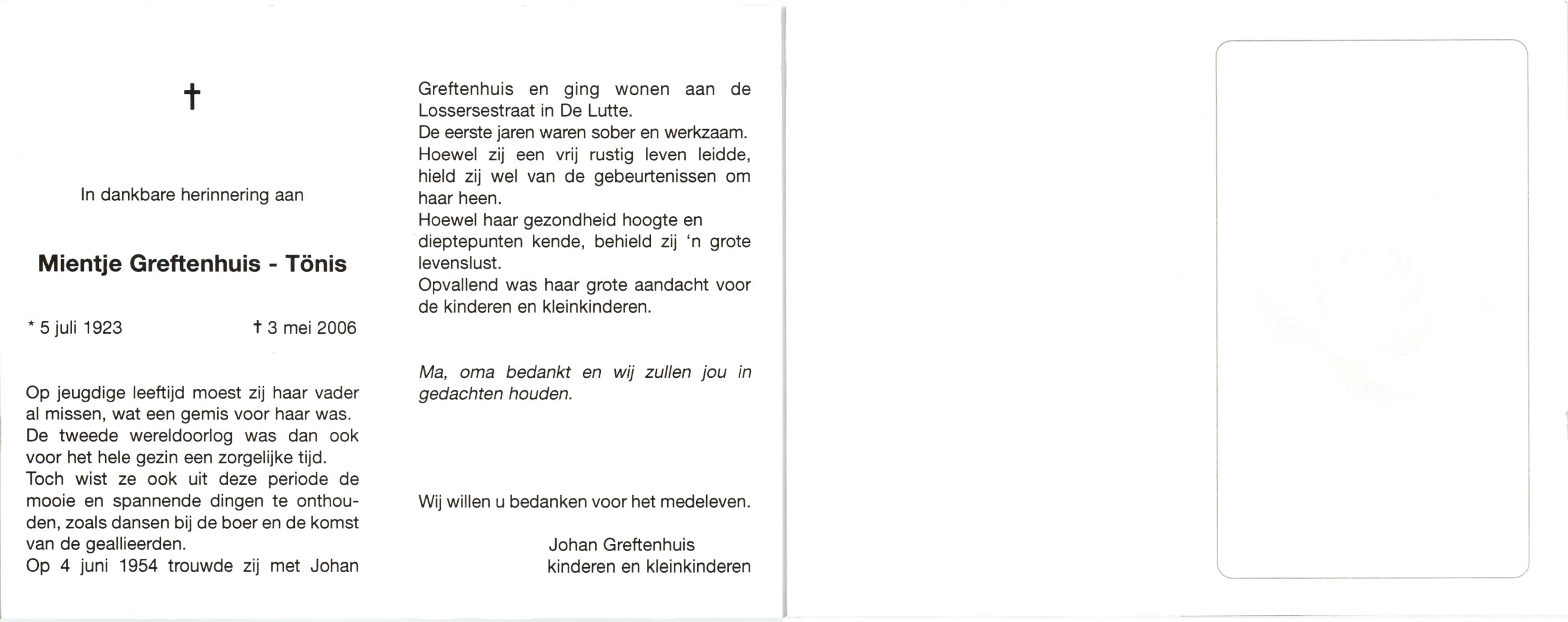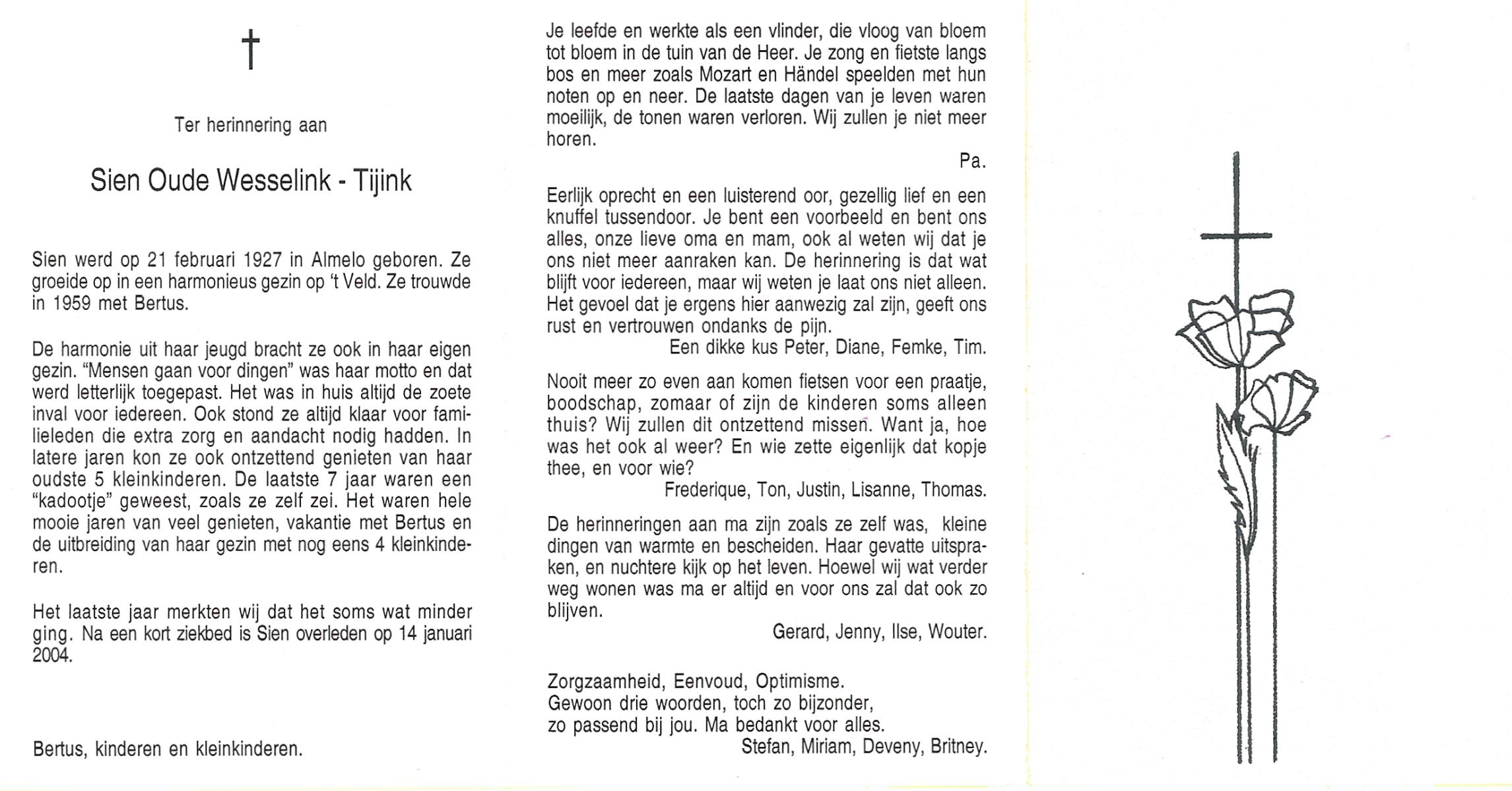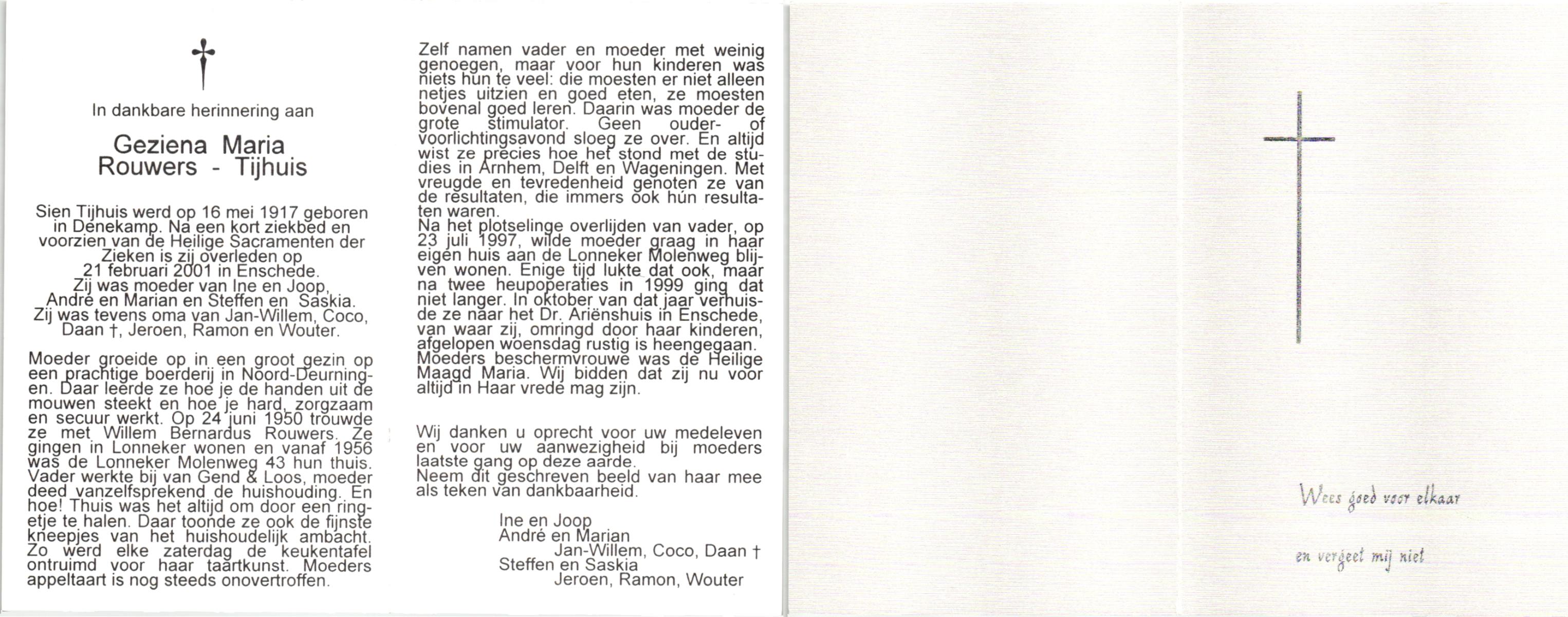 TIJHUIS, , Geziena Maria, geboren op 16-5-1917 te Denekamp, overleden op 21-2-2001 te Enschede op 83-jarige leeftijd.