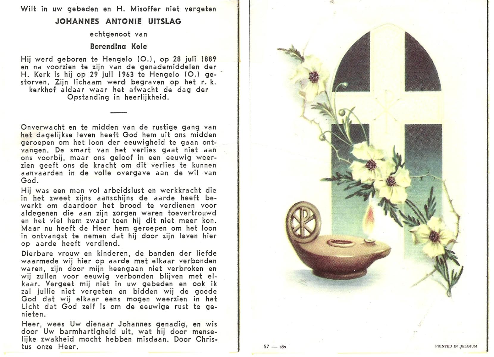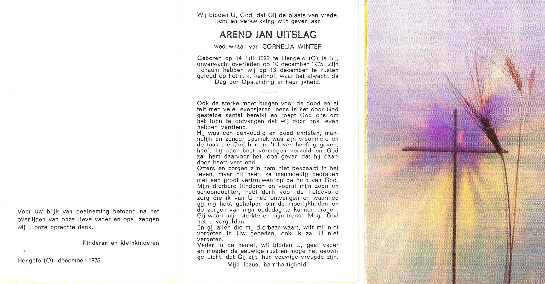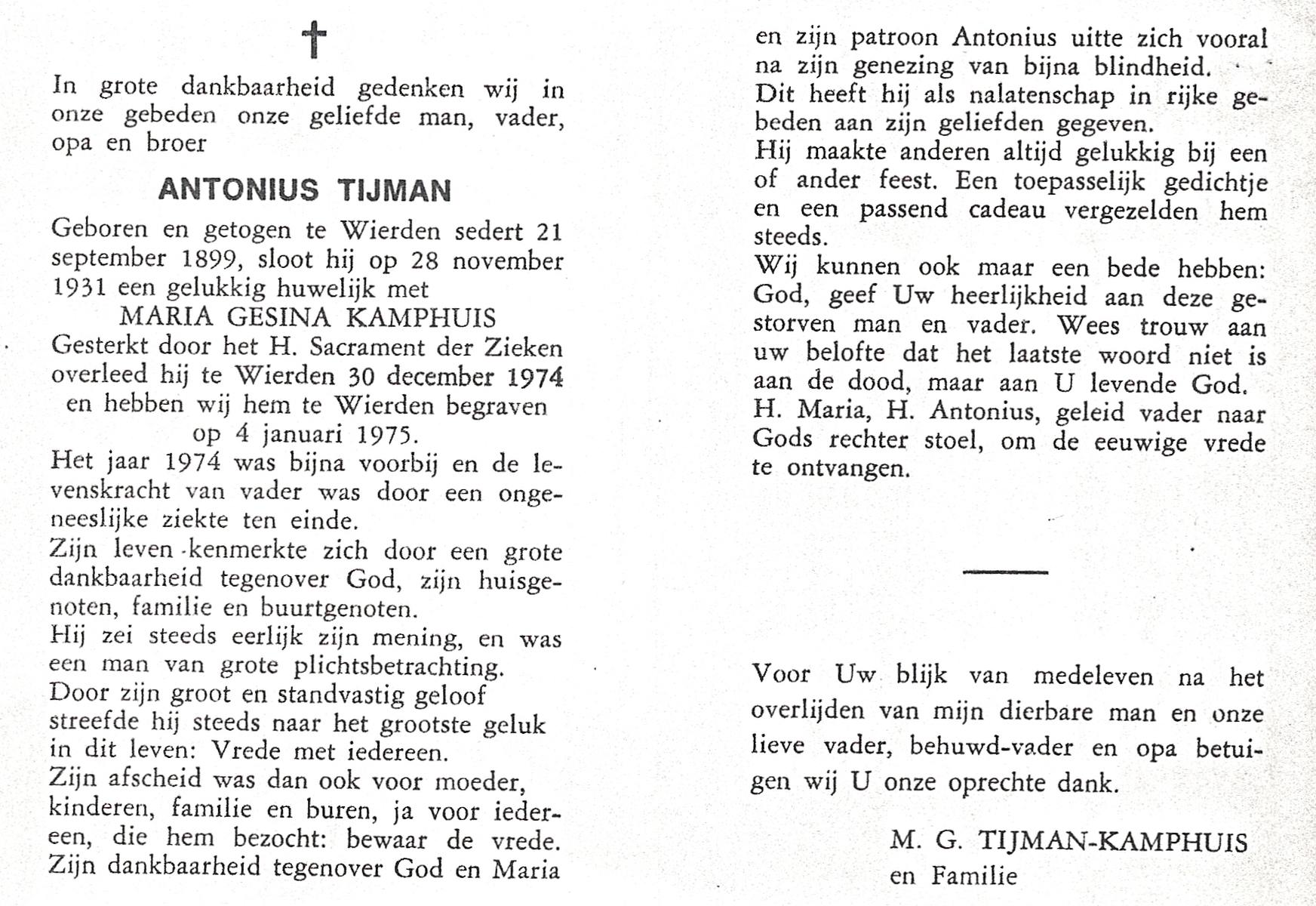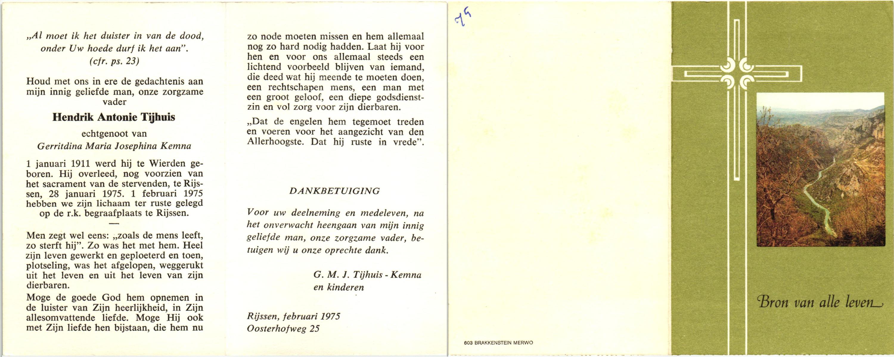 TIJHUIS, Hendrik Antonie, geboren op 1-1-1911 te Wierden, overleden op 28-1-1975 te Rijssen op 64-jarige leeftijd, begraven op 1-2-1975 te Rijssen.