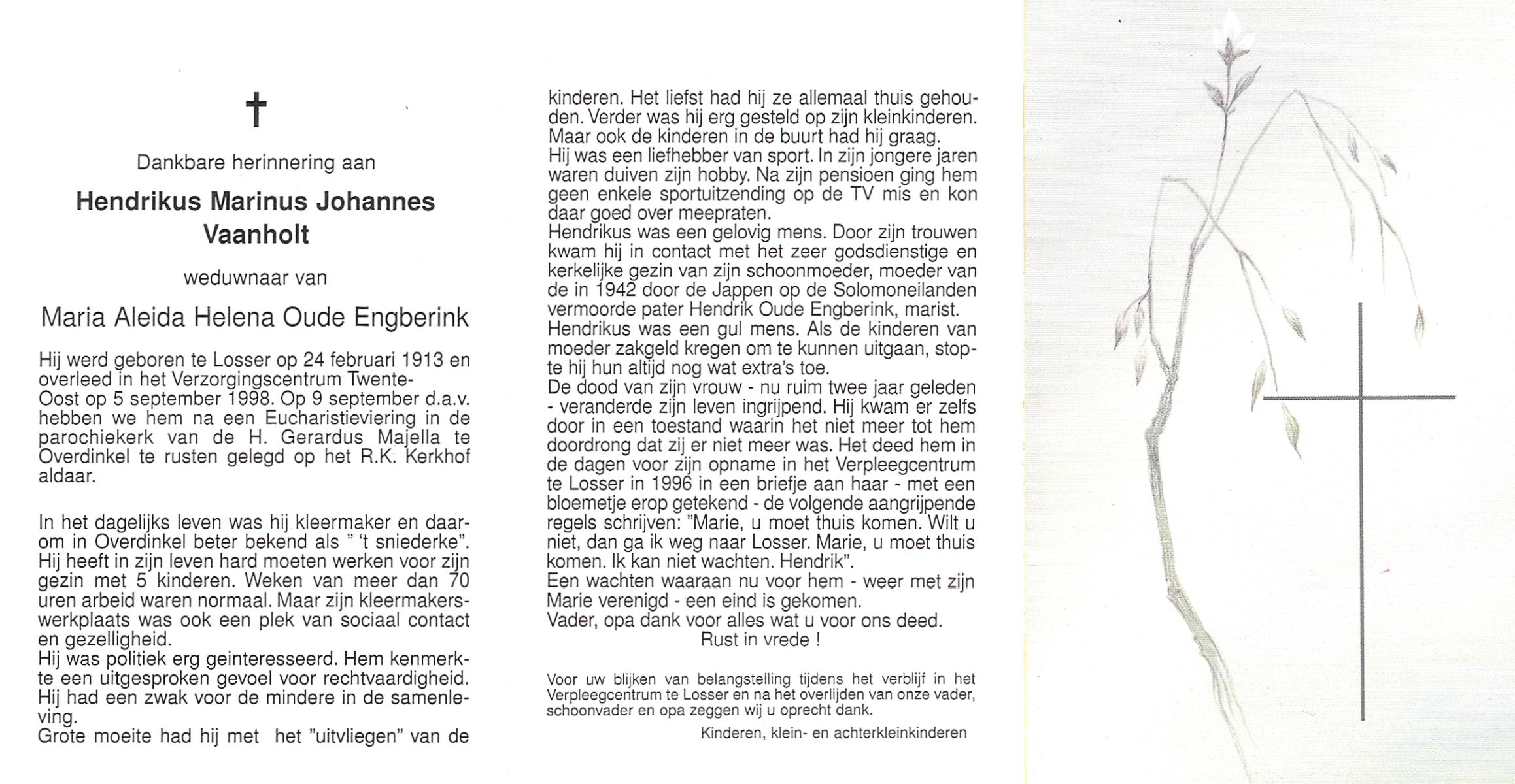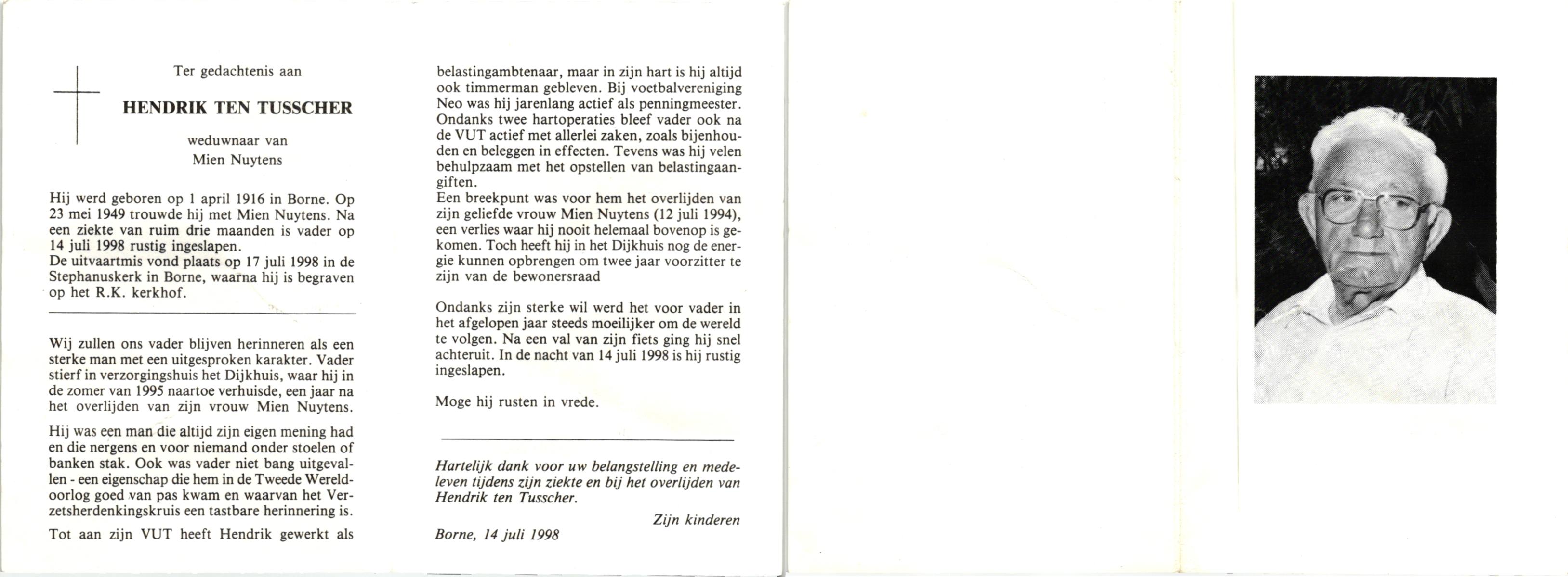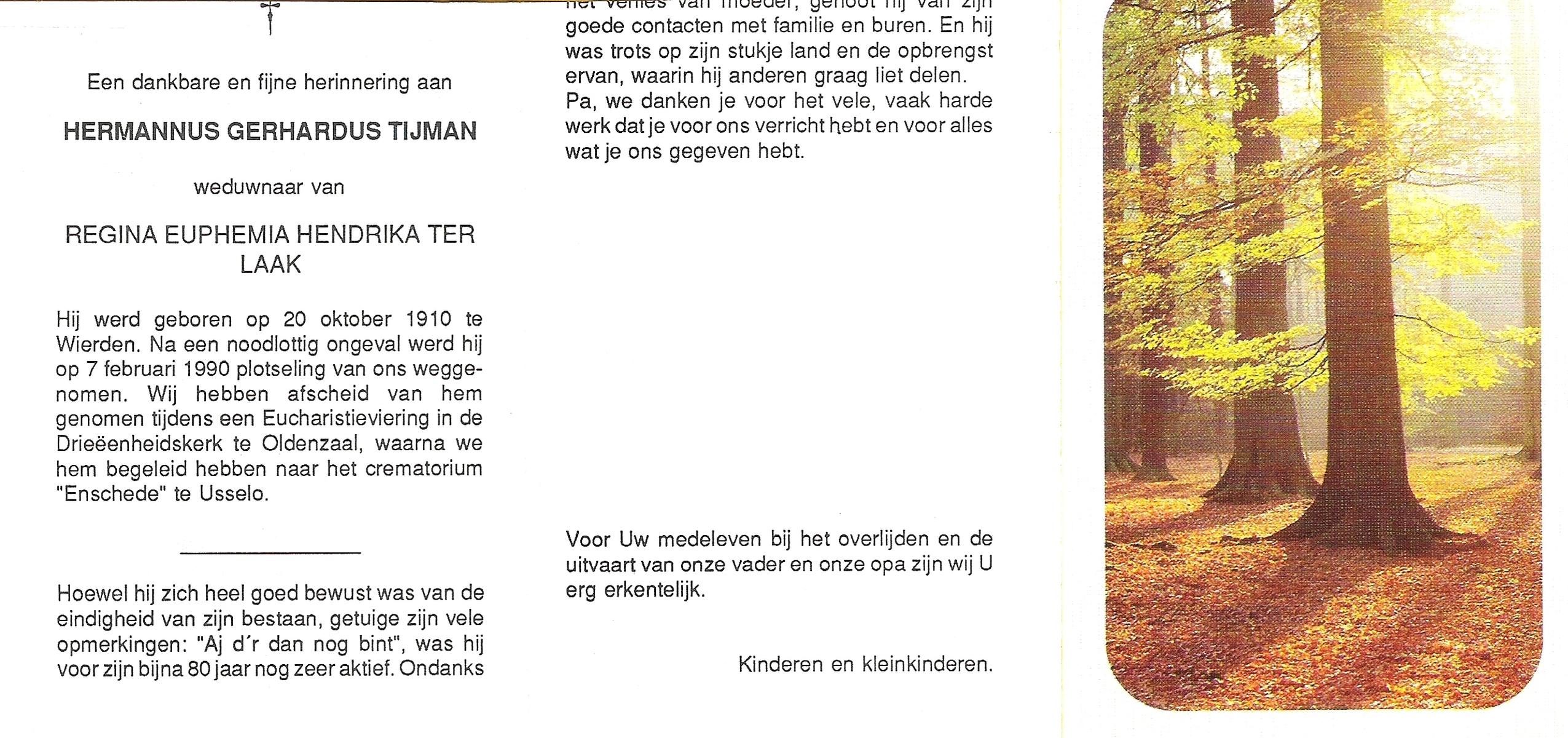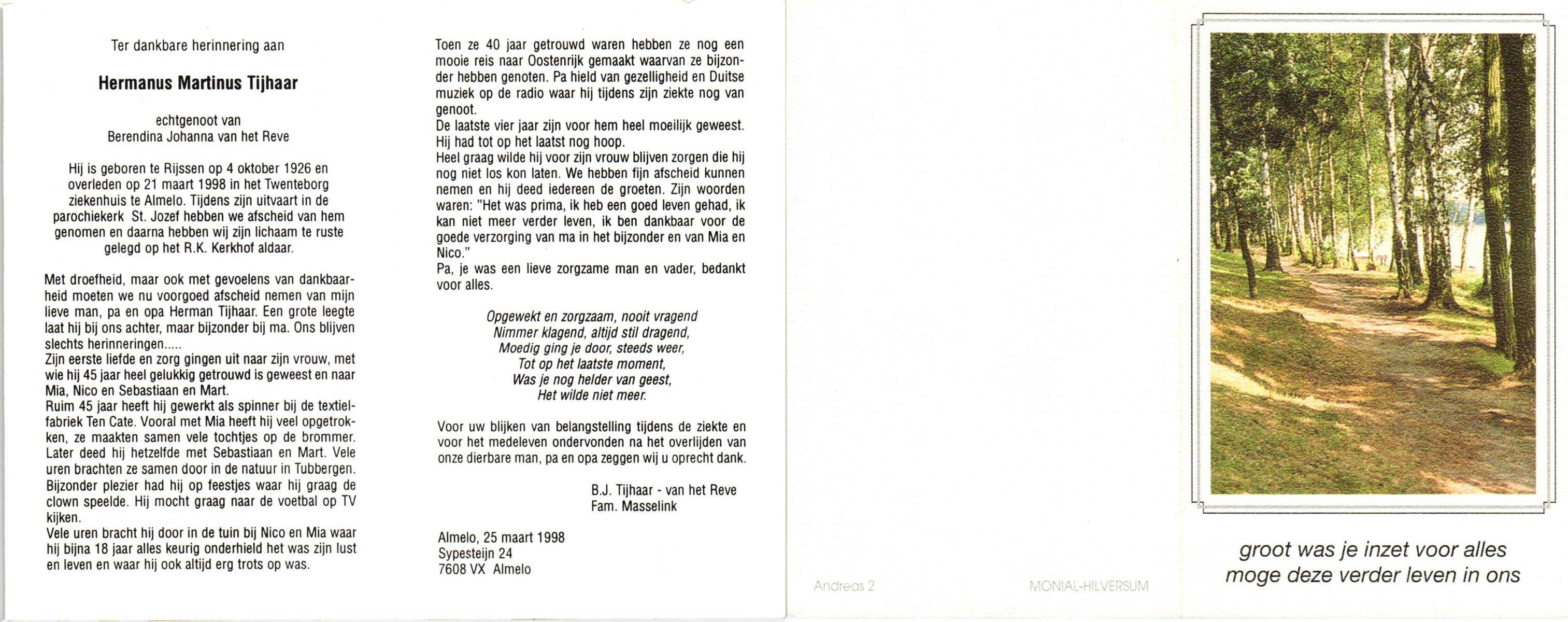 TIJHAAR, Hermanus Martinus, geboren op 4-10-1926 te Rijssen, overleden op 21-3-1998 te Almelo, ziekenhuis op 71-jarige leeftijd, begraven te Almelo.