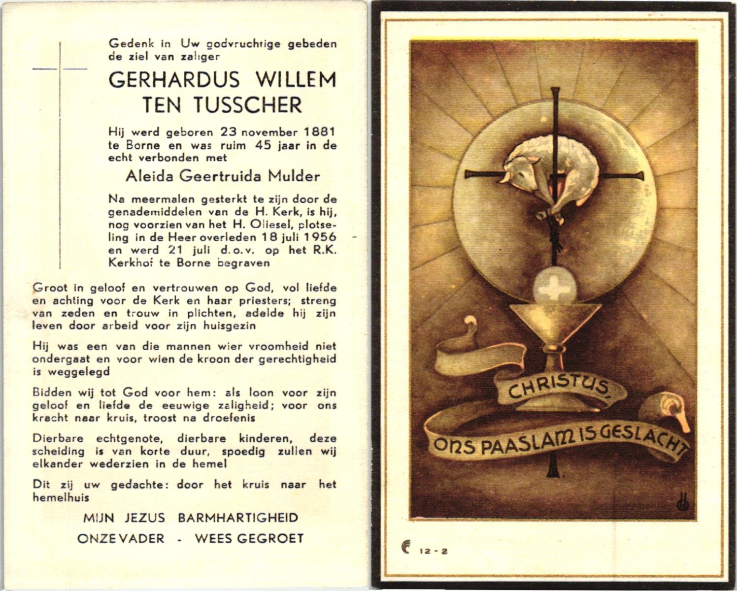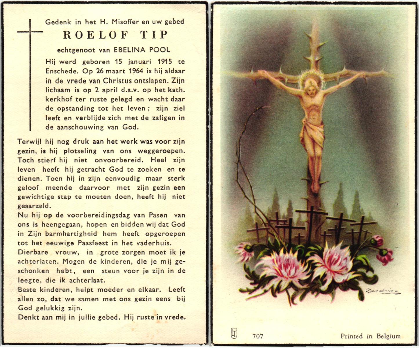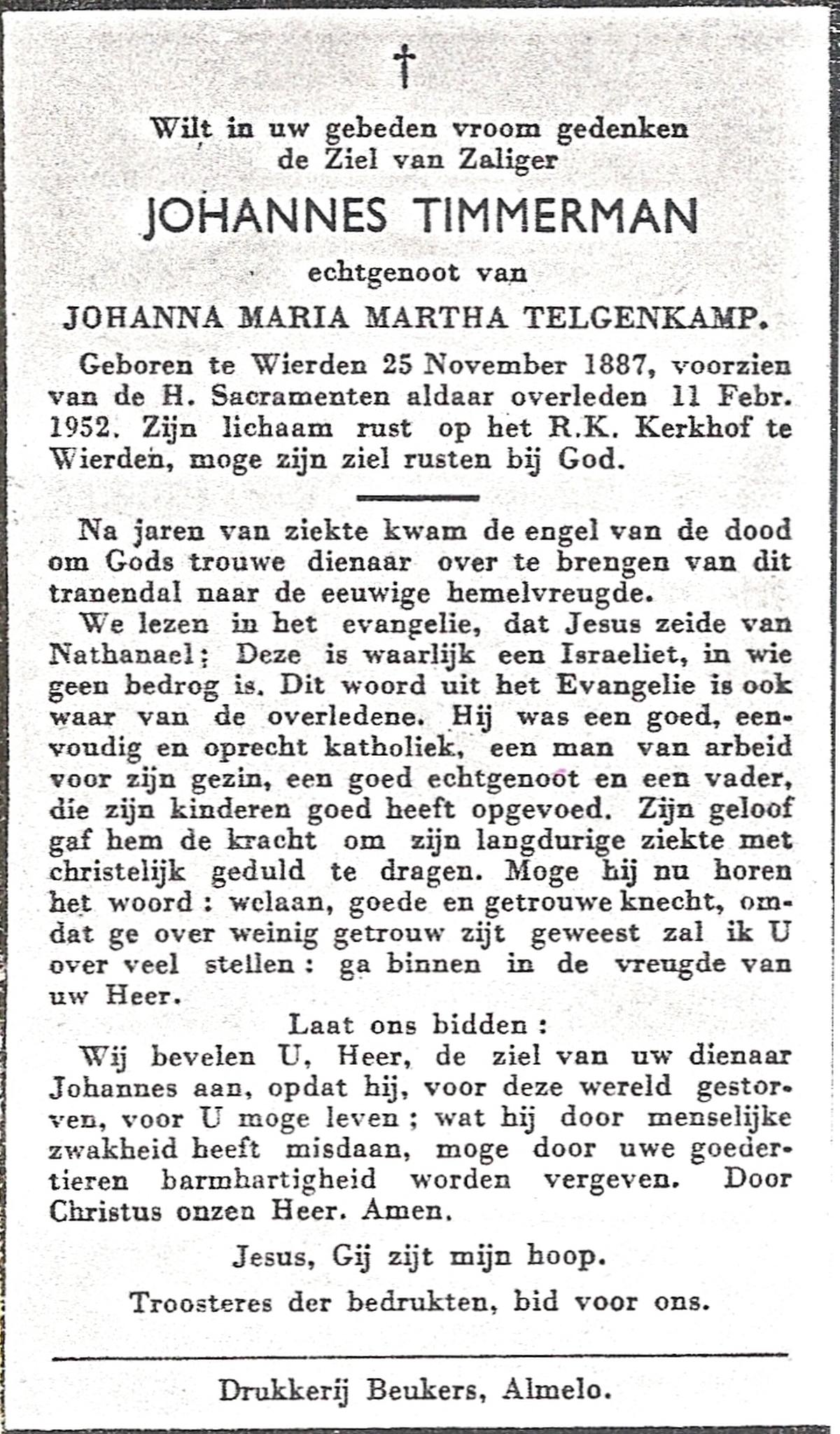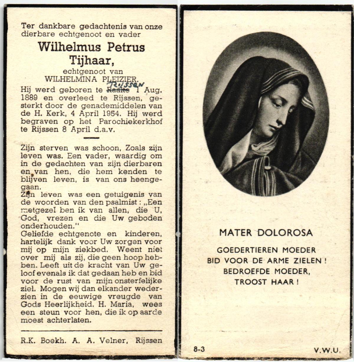 TIJHAAR, Wilhelmus Petrus, geboren op 01-08-1889 te Rijssen, overleden op 4-4-1954 te Rijssen op 64-jarige leeftijd, begraven op 8-4-1954 te Rijssen.
