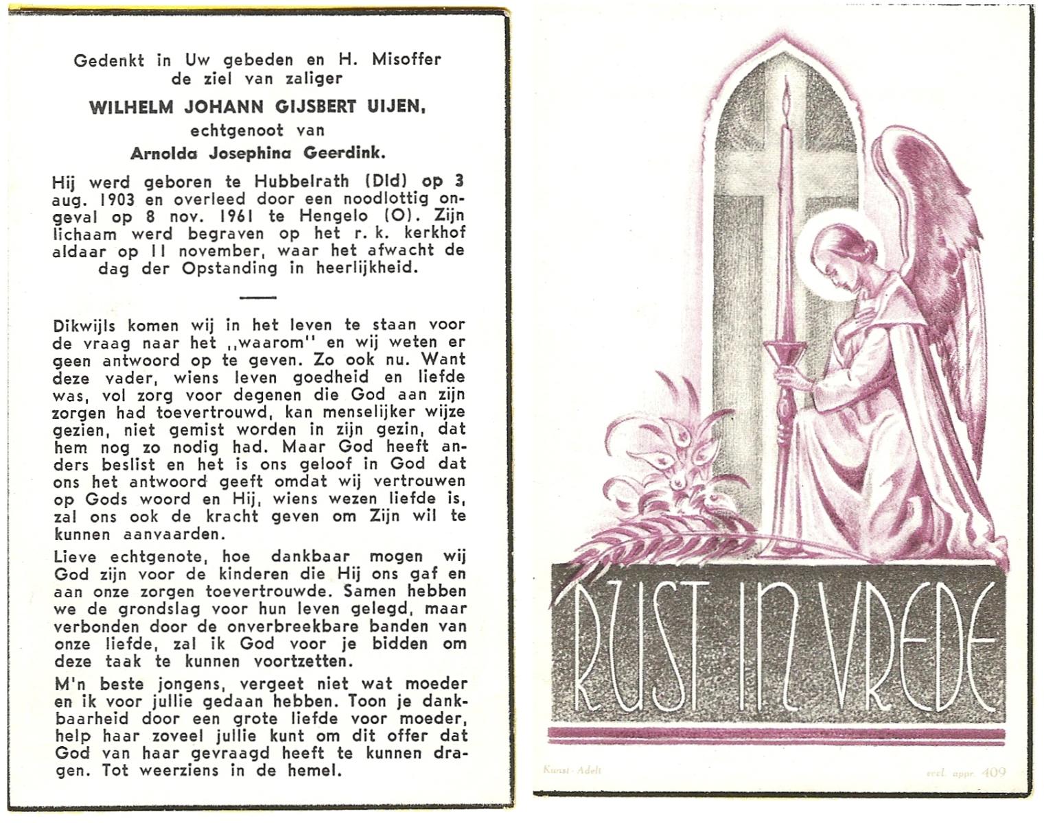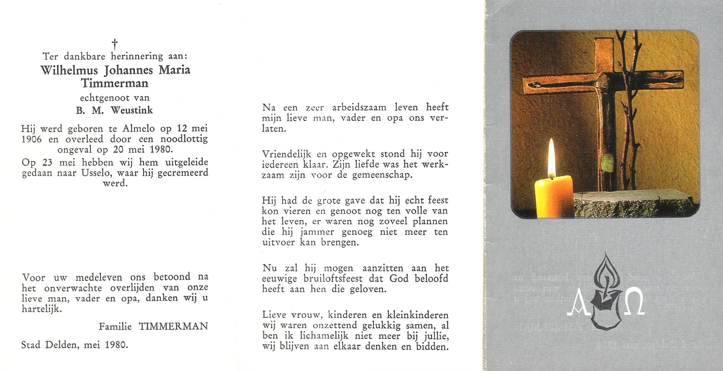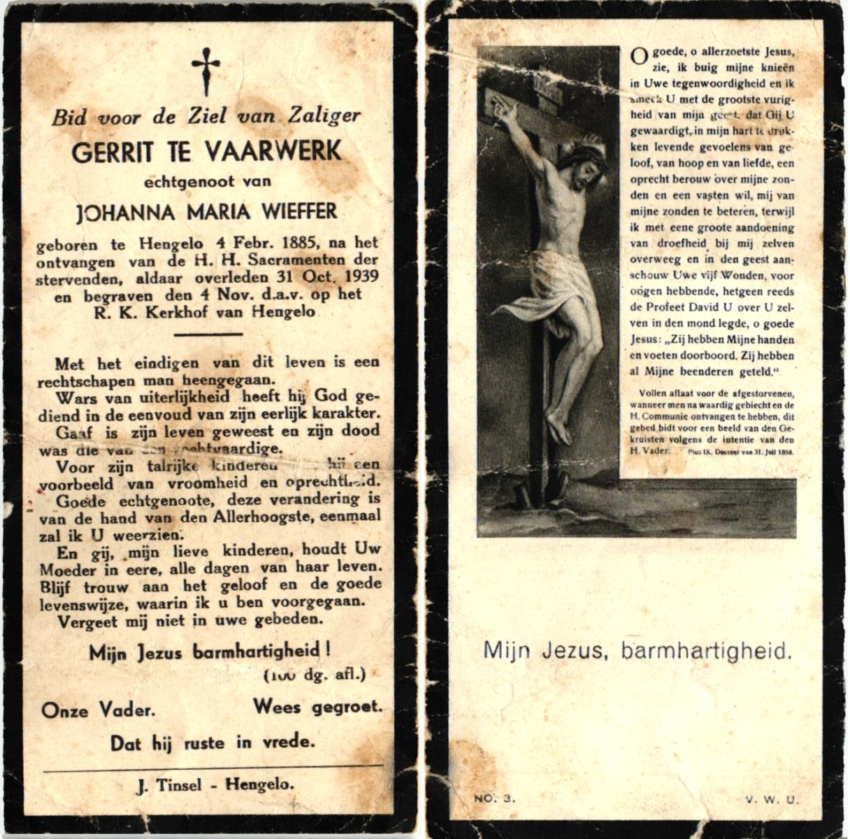 TIJHAAR, Wilhelmus Petrus, geboren op 01-08-1889 te Rijssen, overleden op 4-4-1954 te Rijssen op 64-jarige leeftijd, begraven op 8-4-1954 te Rijssen.