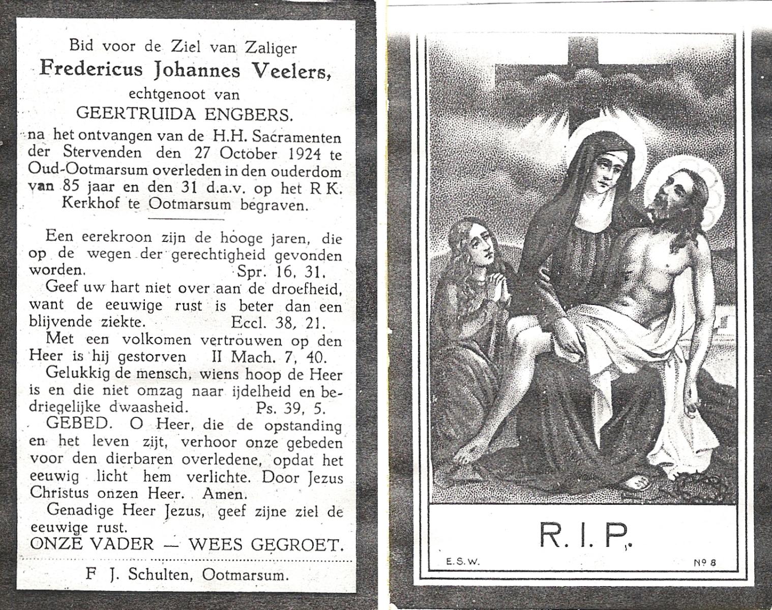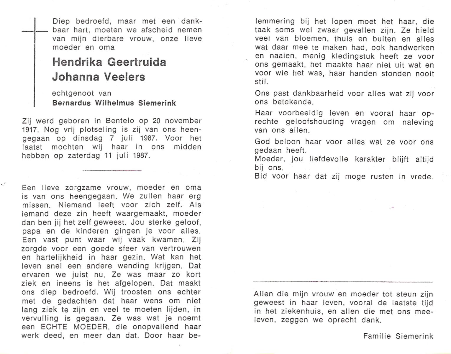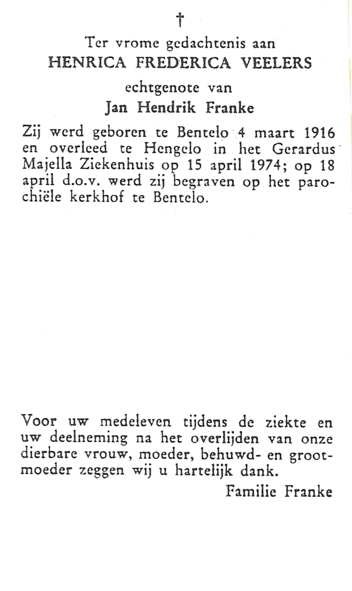 VEELERS, Henrica Frederica, geboren op 4-3-1916 te Bentelo, overleden op 15-4-1974 te Hengelo (Ov.) op 58-jarige leeftijd, begraven op 18-4-1974 te Bentelo.