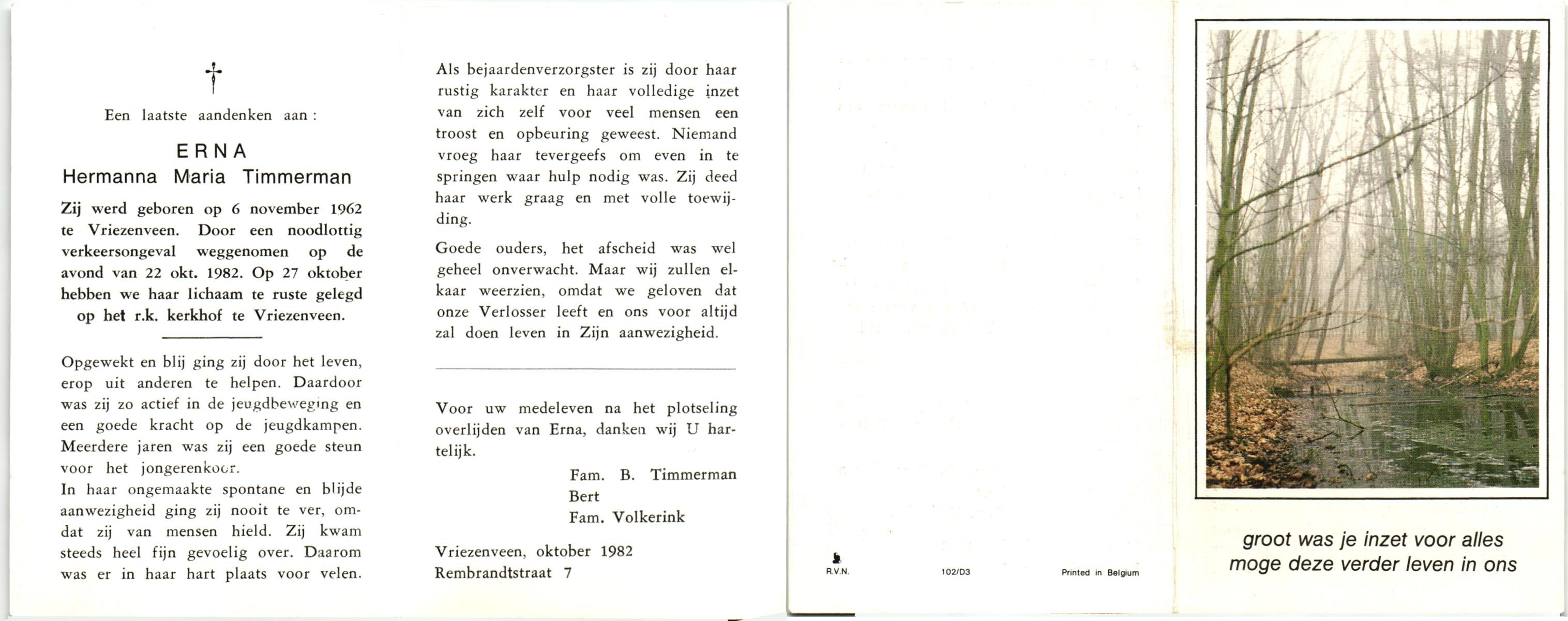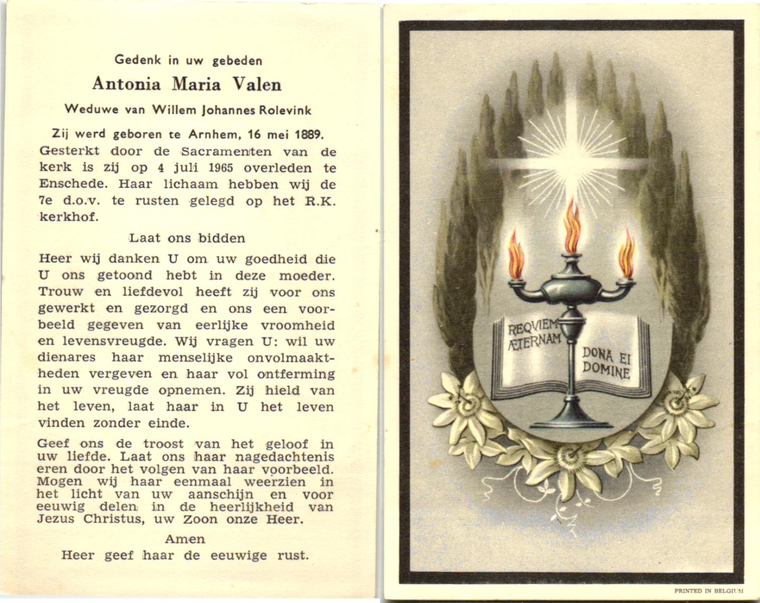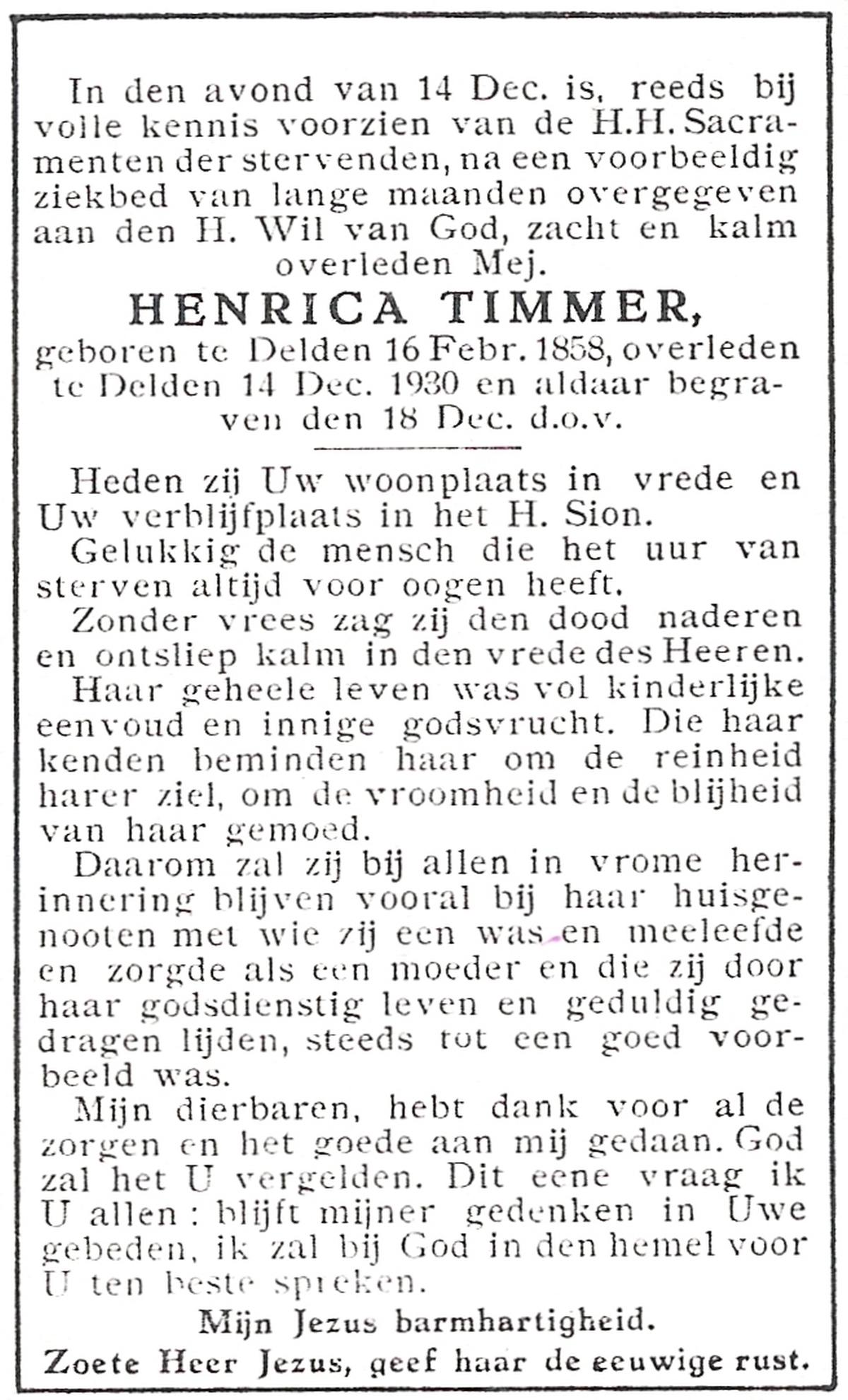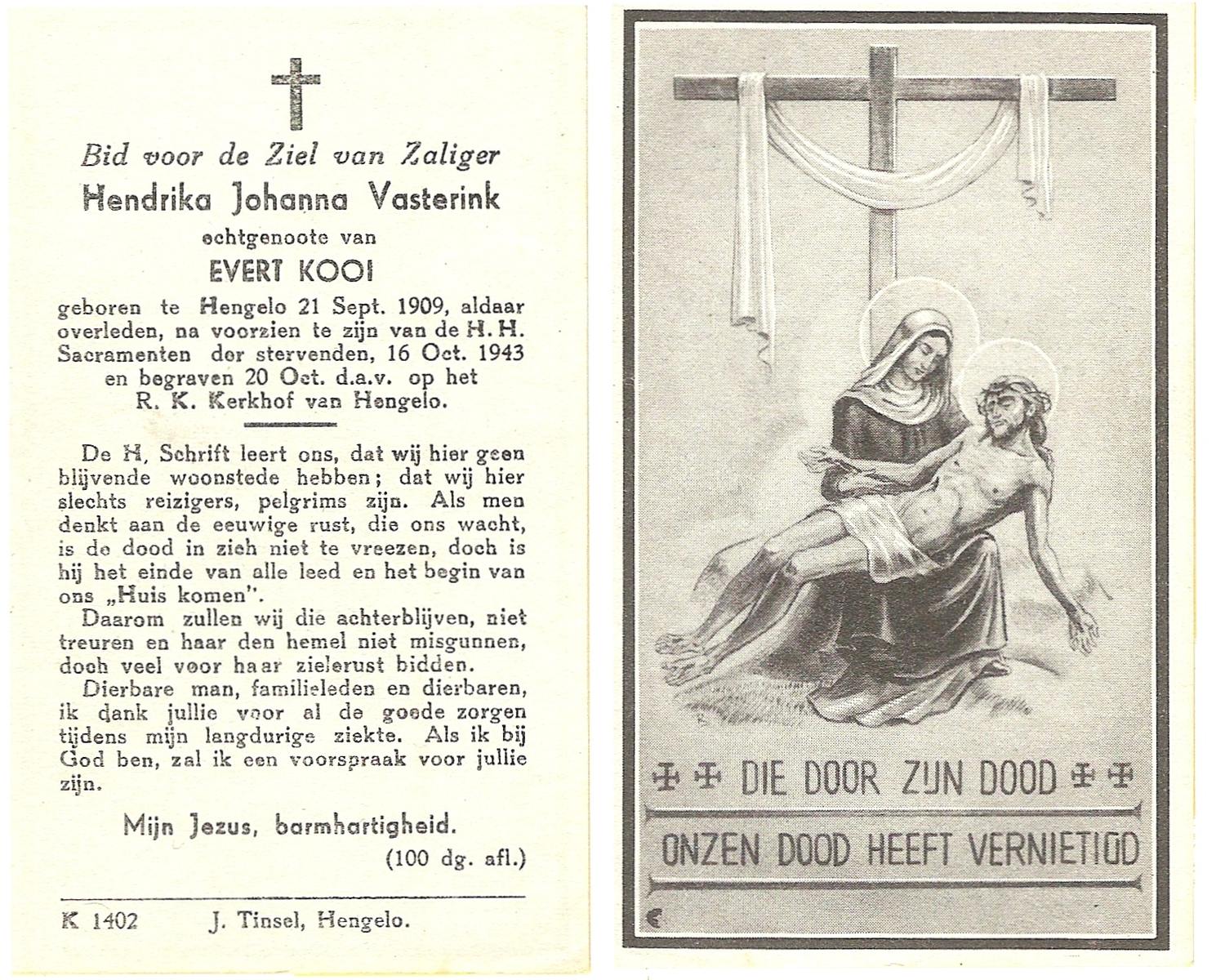 VEELERS, Henrica Frederica, geboren op 4-3-1916 te Bentelo, overleden op 15-4-1974 te Hengelo (Ov.) op 58-jarige leeftijd, begraven op 18-4-1974 te Bentelo.