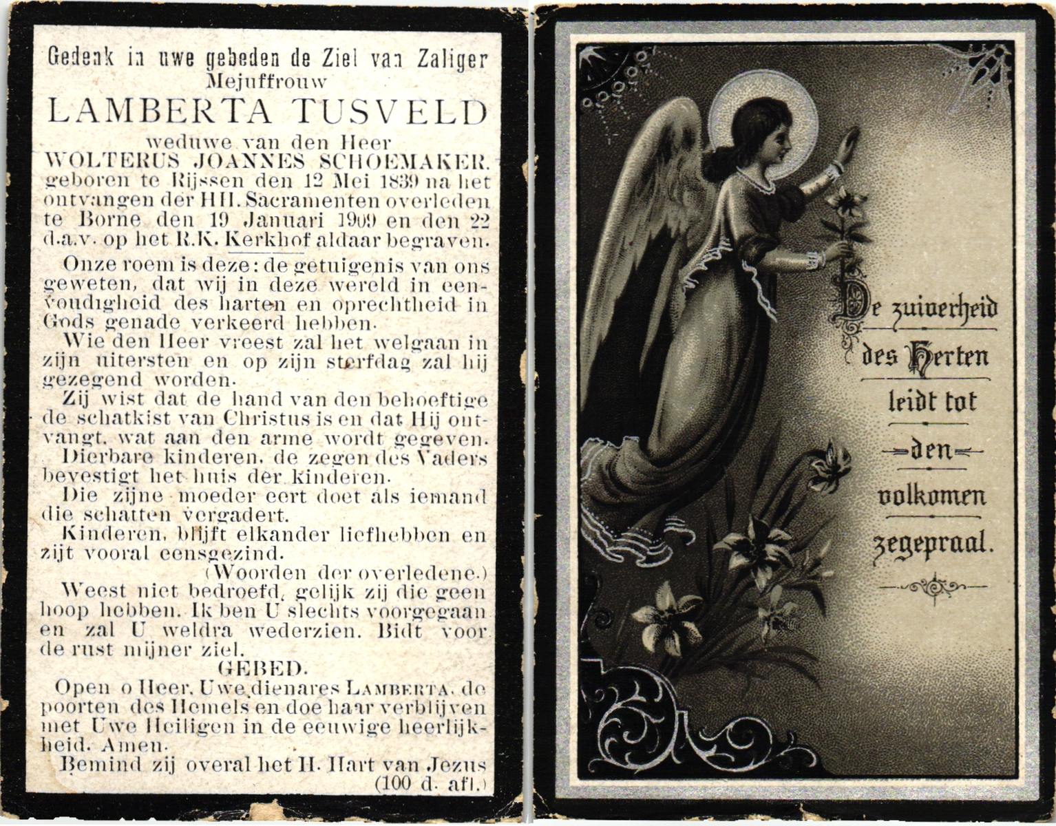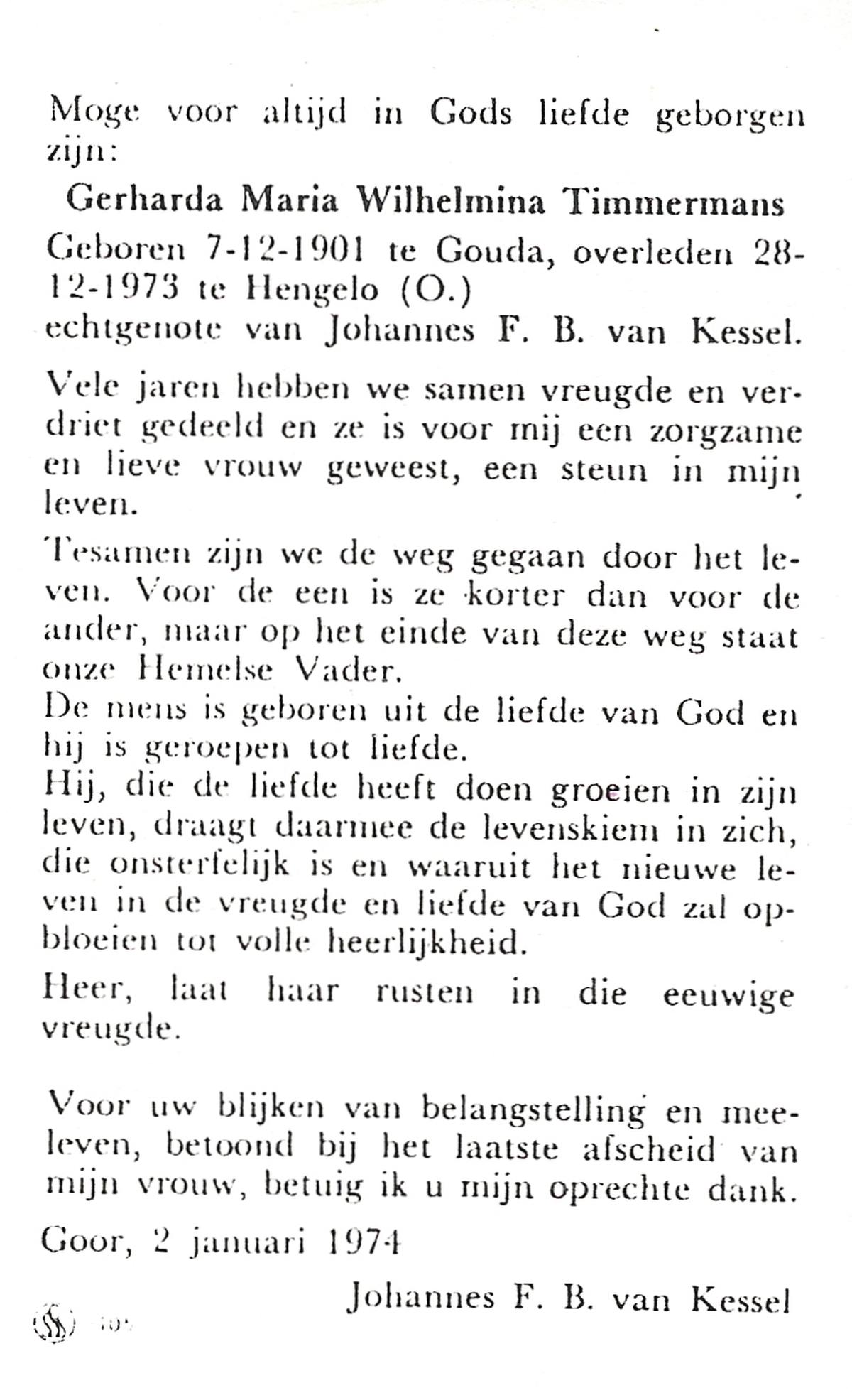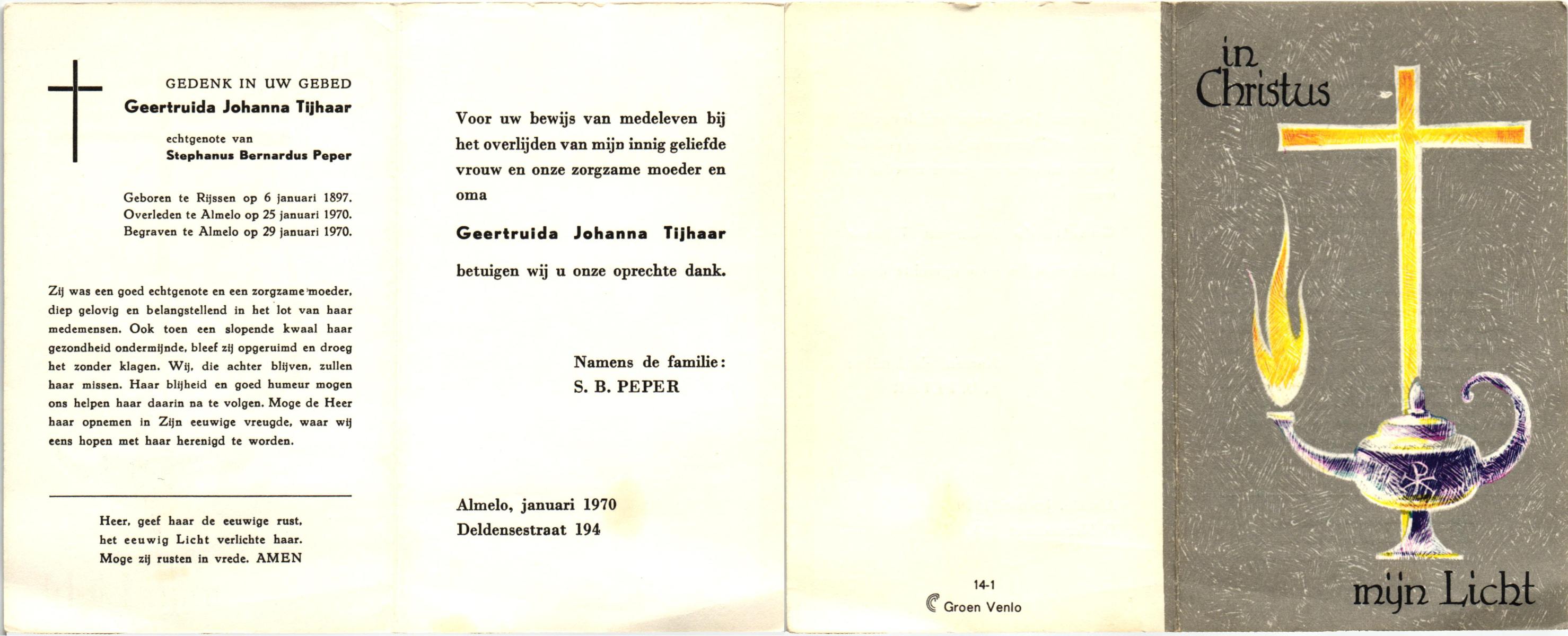 TIJHAAR, Geertruida Johanna, geboren op 06-01-1897 te Rijssen, overleden op 25-1-1970 te Almelo op 73-jarige leeftijd, begraven op 29-1-1970 te Almelo.