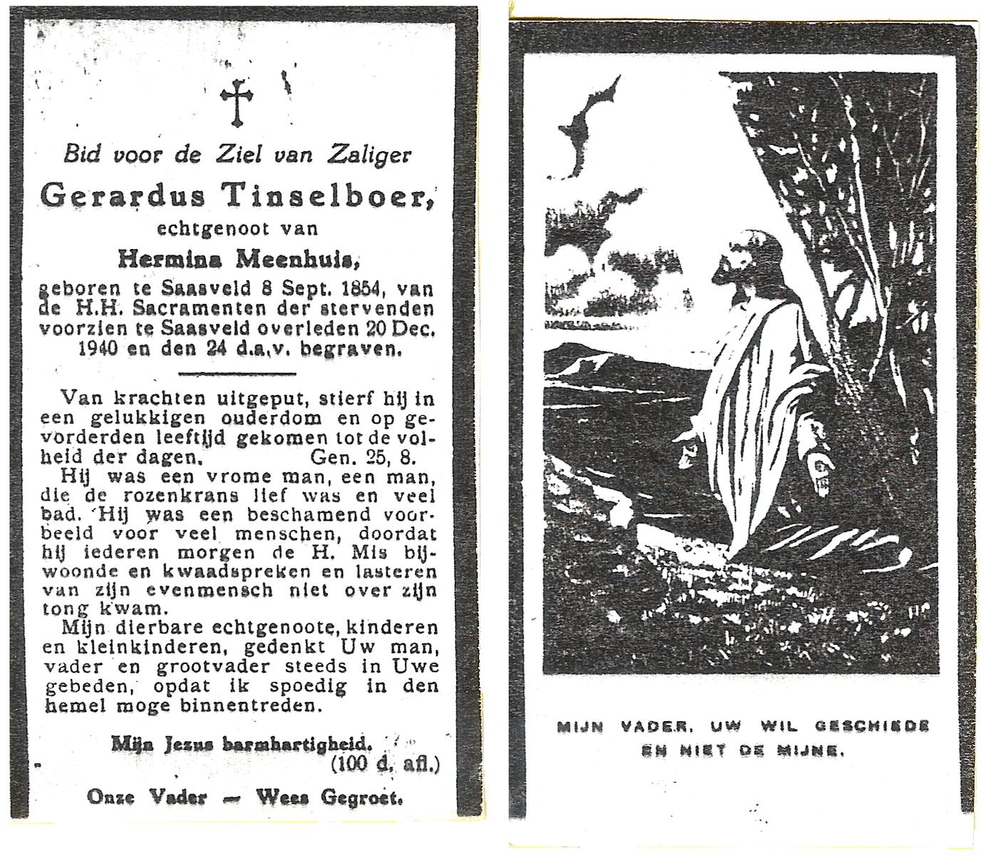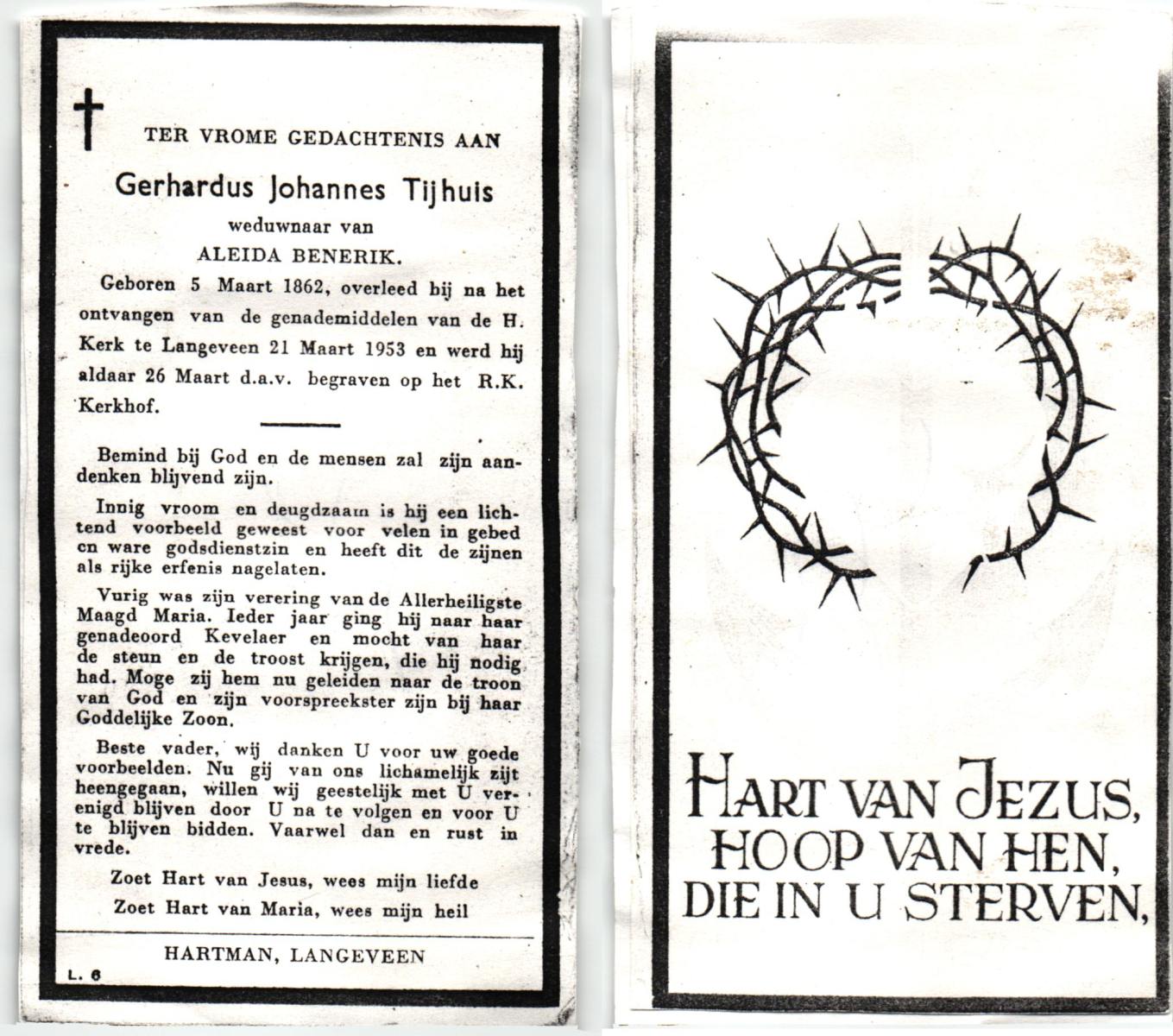TIJHUIS, Gerhardus Johannes, geboren op 05-03-1862, overleden op 21-3-1953 te Langeveen op 91-jarige leeftijd, begraven op 26-3-1953 te Langeveen.